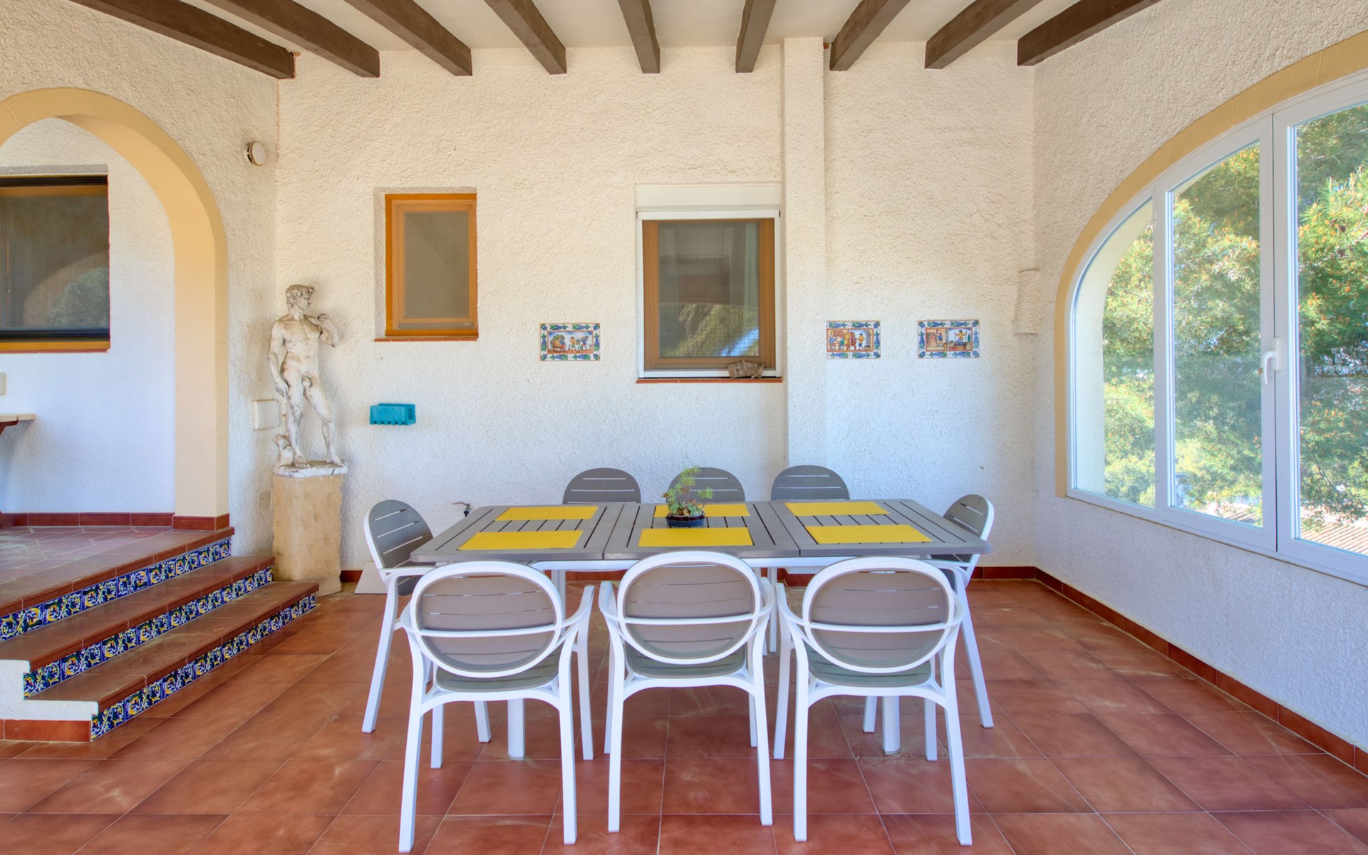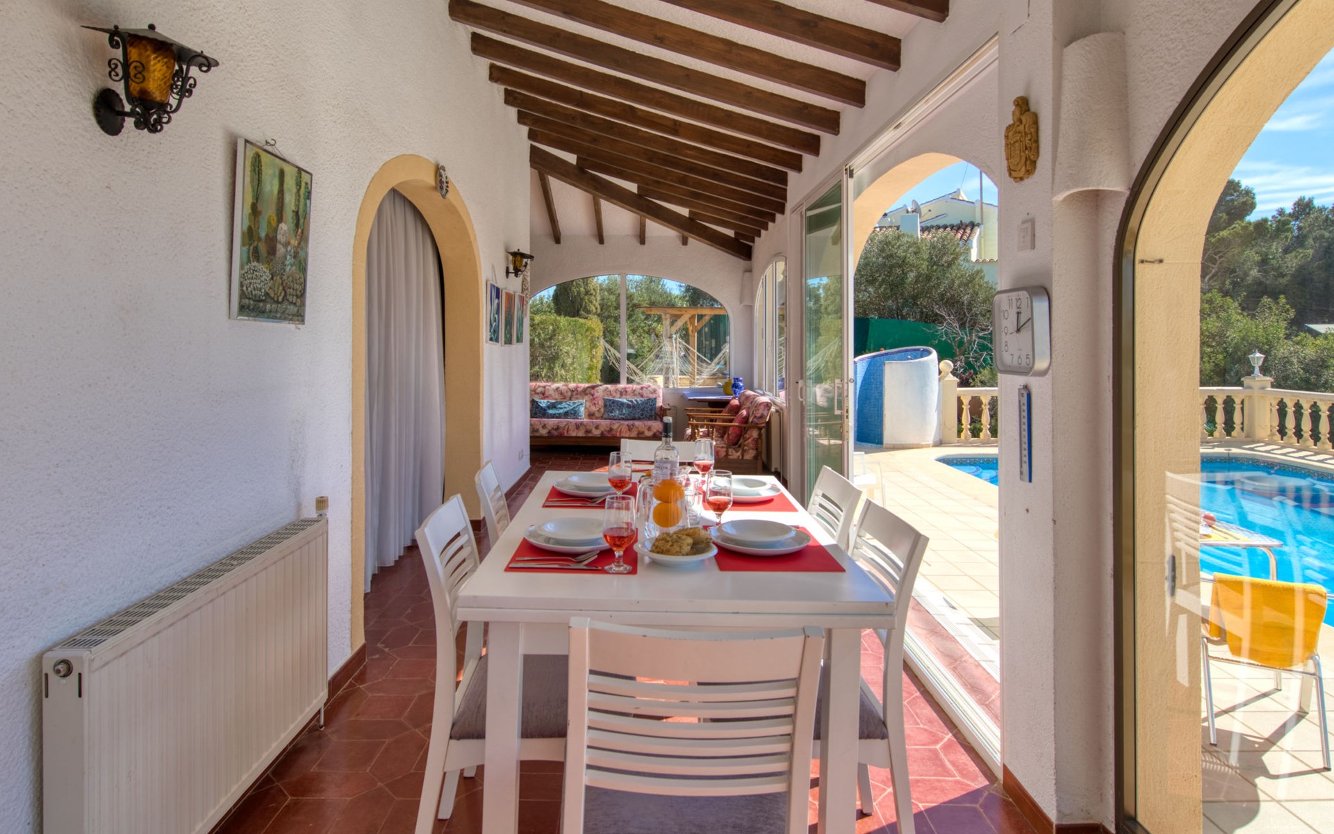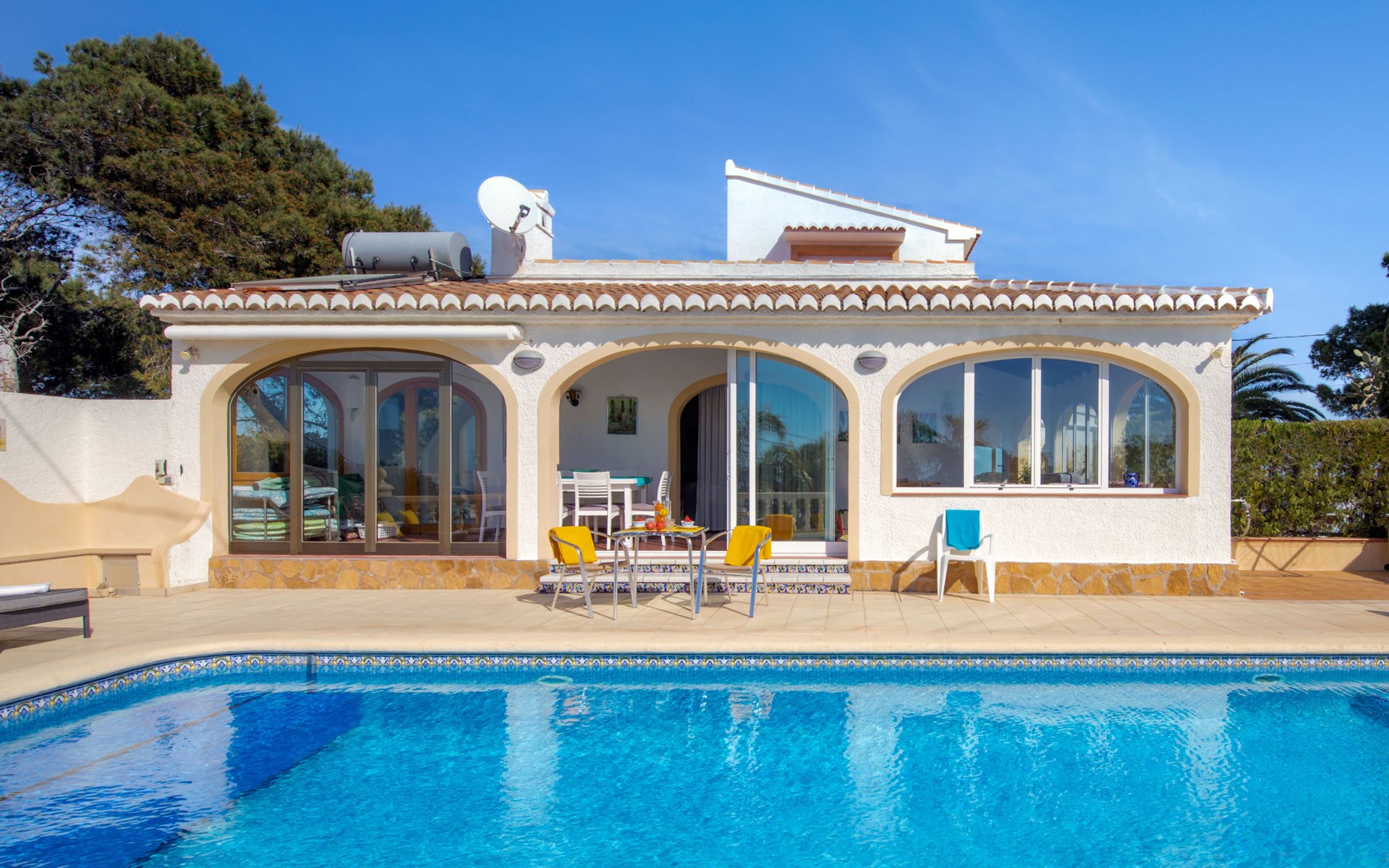 Huis "Marina". In de wijk Marina, 1 km van zee. Voor alleengebruik: terrein 1.400 m2 (omheind) met planten en bomen, openluchtzwembad (5 x 10 m, seizoensgebonden beschikbaarheid: 01.Jan. - 31.Dec.). In het huis: dakterras, centrale verwarming. Supermarkt 3.3 km, restaurant 3.3 km, bar 3.3 km, bushalte "Toscamar" 3.7 km, zandstrand "Arenal" 7.4 km, baai 1 km. Golfterrein (9 holes) 7 km, tennis 3.3 km. Groepen jongeren uitsluitend op aanvraag.