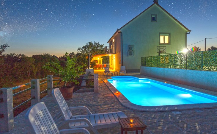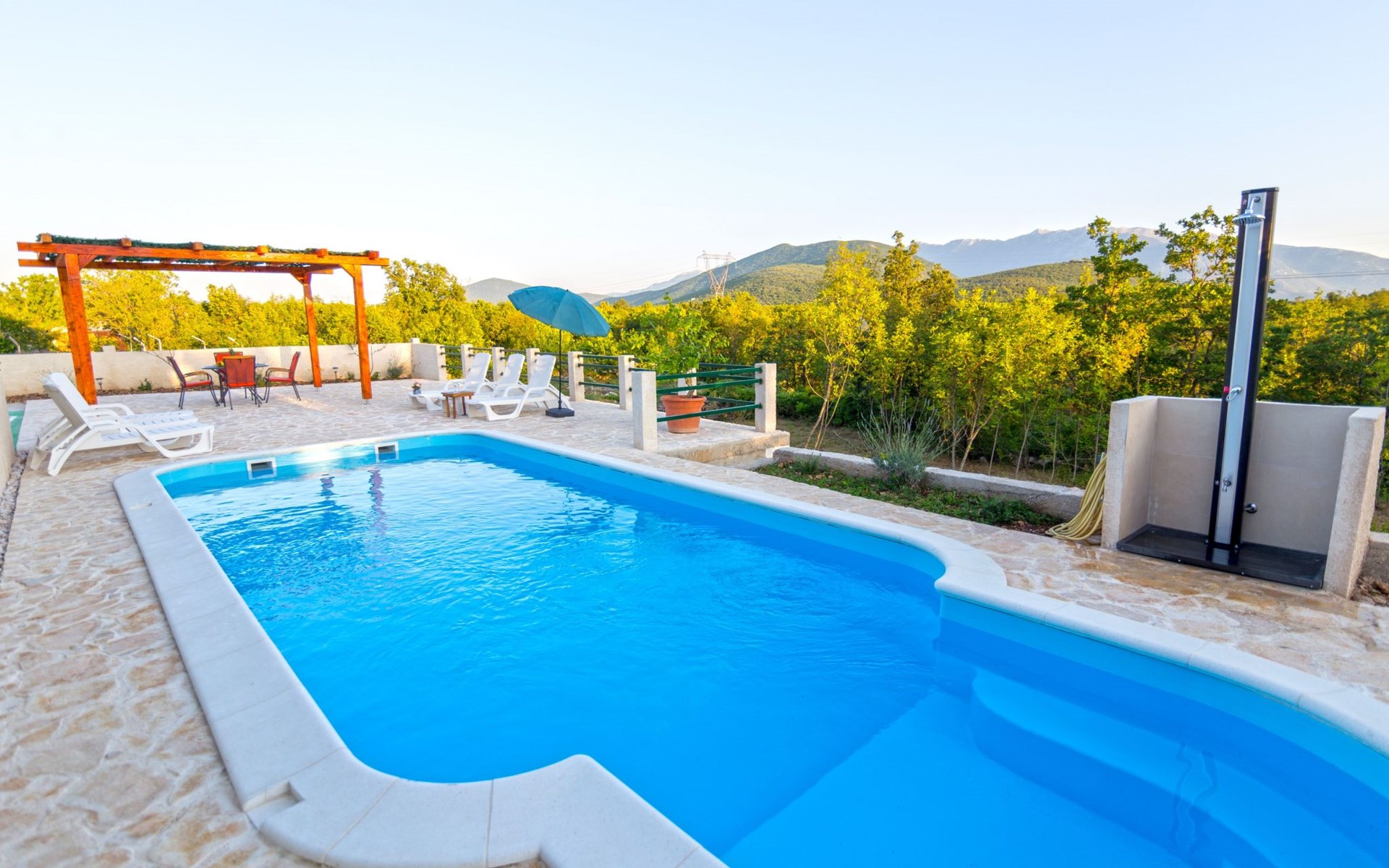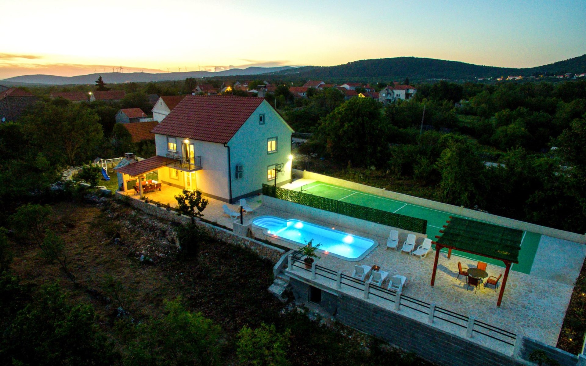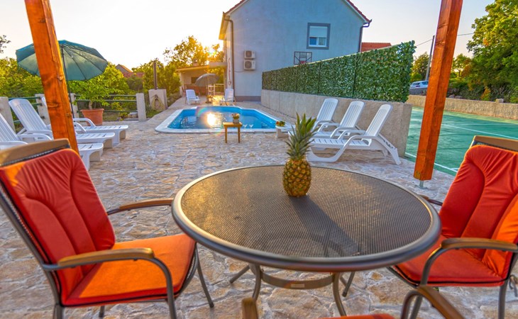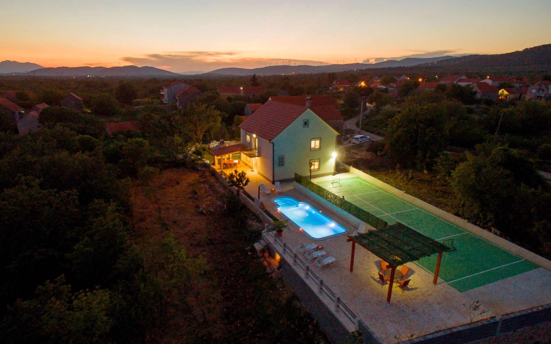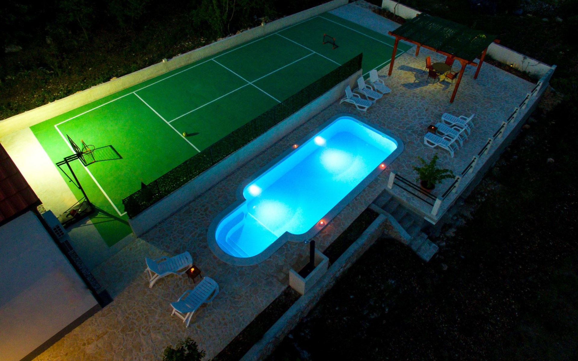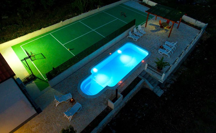 The house is a two-story, detached property located in Lovreć, near the town of Imotski, in the Split-Dalmatia County, Croatia. The property comprises a ground floor, first floor, and a roof. Both the ground floor and the first floor are separate apartments, each equipped with a kitchen, living room, dining area, two bedrooms, a bathroom, and a toilet. The living room on the first floor opens onto a balcony, while the ground floor opens to an outdoor area with a loggia, a swimming pool, a tennis court, and a children's playground. The tennis court is multifunctional and can also be used for mini football or basketball. The green areas around the house are mostly part of the property, so it’s not a problem if tennis or other balls end up there. The pool is private, spacious enough for a larger number of users, with heated water and an outdoor shower. The house is oriented north-south, with bedrooms on the north side and living areas on the south side. There are no neighbors on the south side of the house, ensuring privacy. On the north side, there is only a country road and parking spaces for cars, with a fence to close off the parking area. The entire house is rented as a single unit and can accommodate 1-12 people, ensuring that it is never shared between two groups or families who do not know each other. It is ideal for family vacations with children or for a group of friends wanting to spend their holiday together. The property is relatively close to larger well-known centers in Split-Dalmatia County (Imotski, Split, Omiš, Makarska, Dubrovnik).