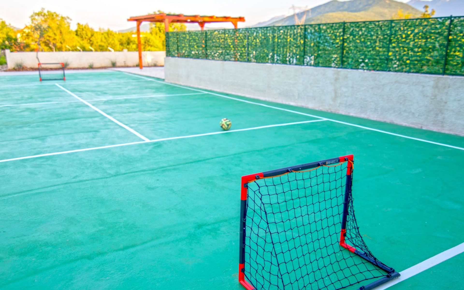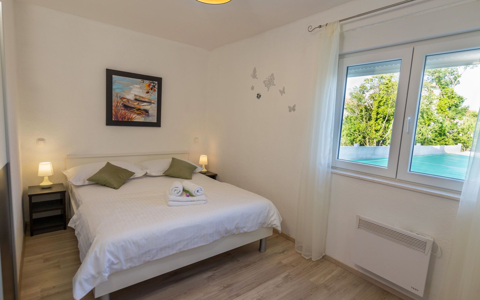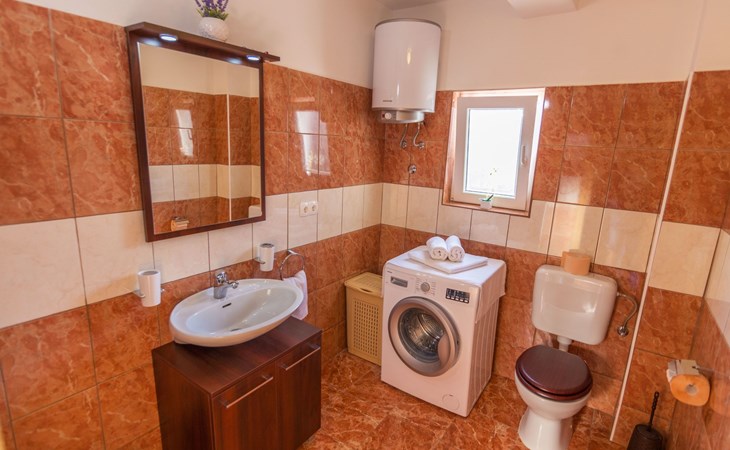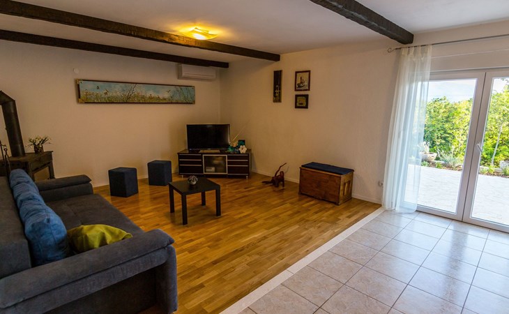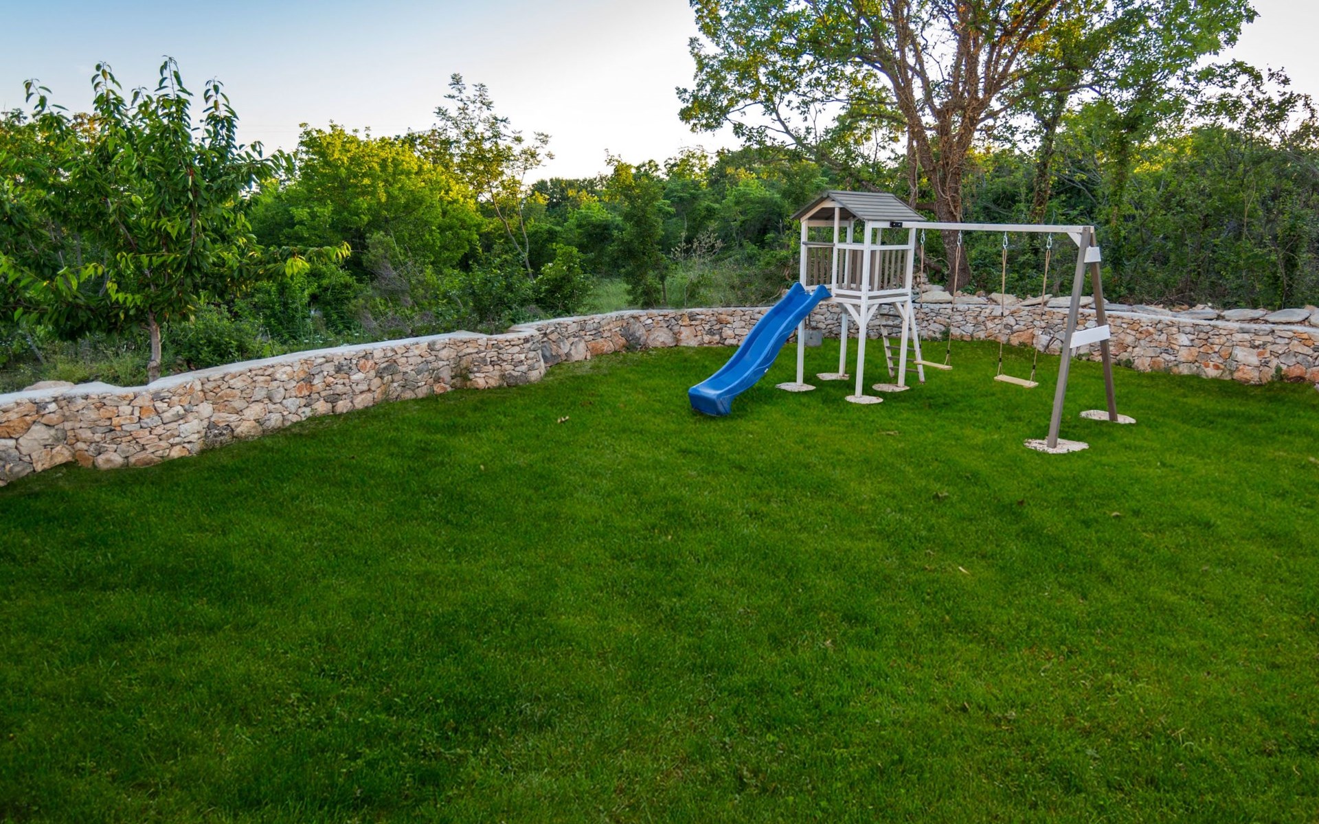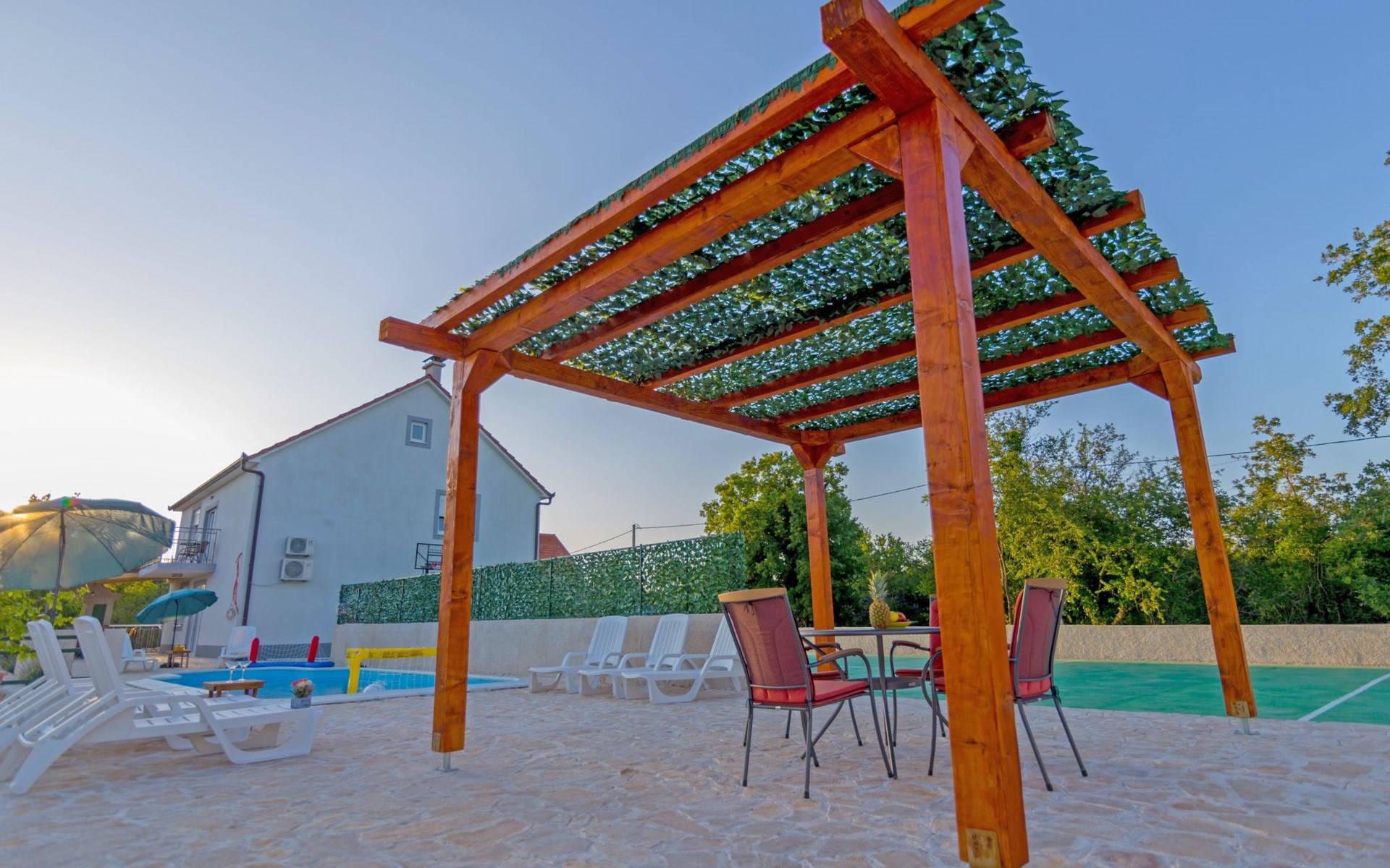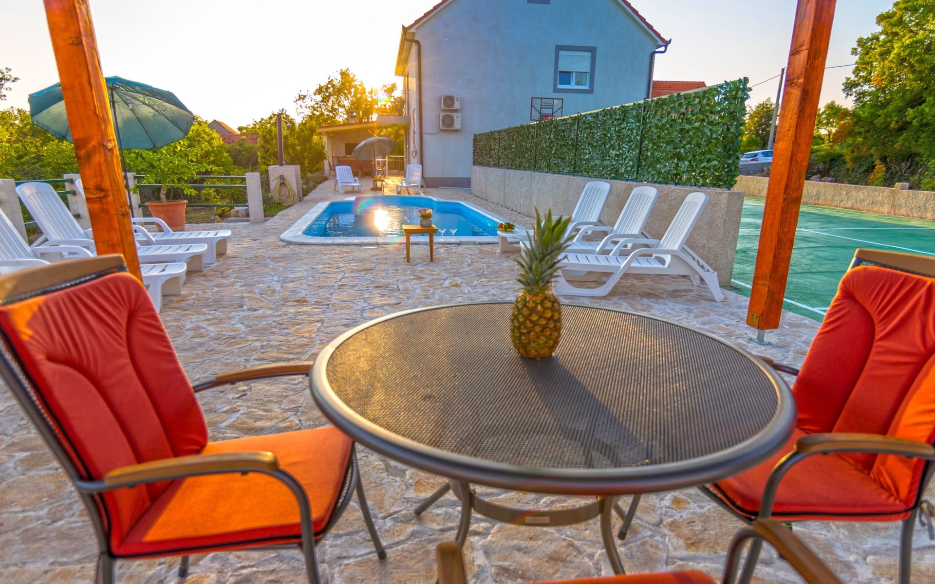 The house is a two-story, detached property located in Lovreć, near the town of Imotski, in the Split-Dalmatia County, Croatia. The property comprises a ground floor, first floor, and a roof. Both the ground floor and the first floor are separate apartments, each equipped with a kitchen, living room, dining area, two bedrooms, a bathroom, and a toilet. The living room on the first floor opens onto a balcony, while the ground floor opens to an outdoor area with a loggia, a swimming pool, a tennis court, and a children's playground. The tennis court is multifunctional and can also be used for mini football or basketball. The green areas around the house are mostly part of the property, so it’s not a problem if tennis or other balls end up there. The pool is private, spacious enough for a larger number of users, with heated water and an outdoor shower. The house is oriented north-south, with bedrooms on the north side and living areas on the south side. There are no neighbors on the south side of the house, ensuring privacy. On the north side, there is only a country road and parking spaces for cars, with a fence to close off the parking area. The entire house is rented as a single unit and can accommodate 1-12 people, ensuring that it is never shared between two groups or families who do not know each other. It is ideal for family vacations with children or for a group of friends wanting to spend their holiday together. The property is relatively close to larger well-known centers in Split-Dalmatia County (Imotski, Split, Omiš, Makarska, Dubrovnik).