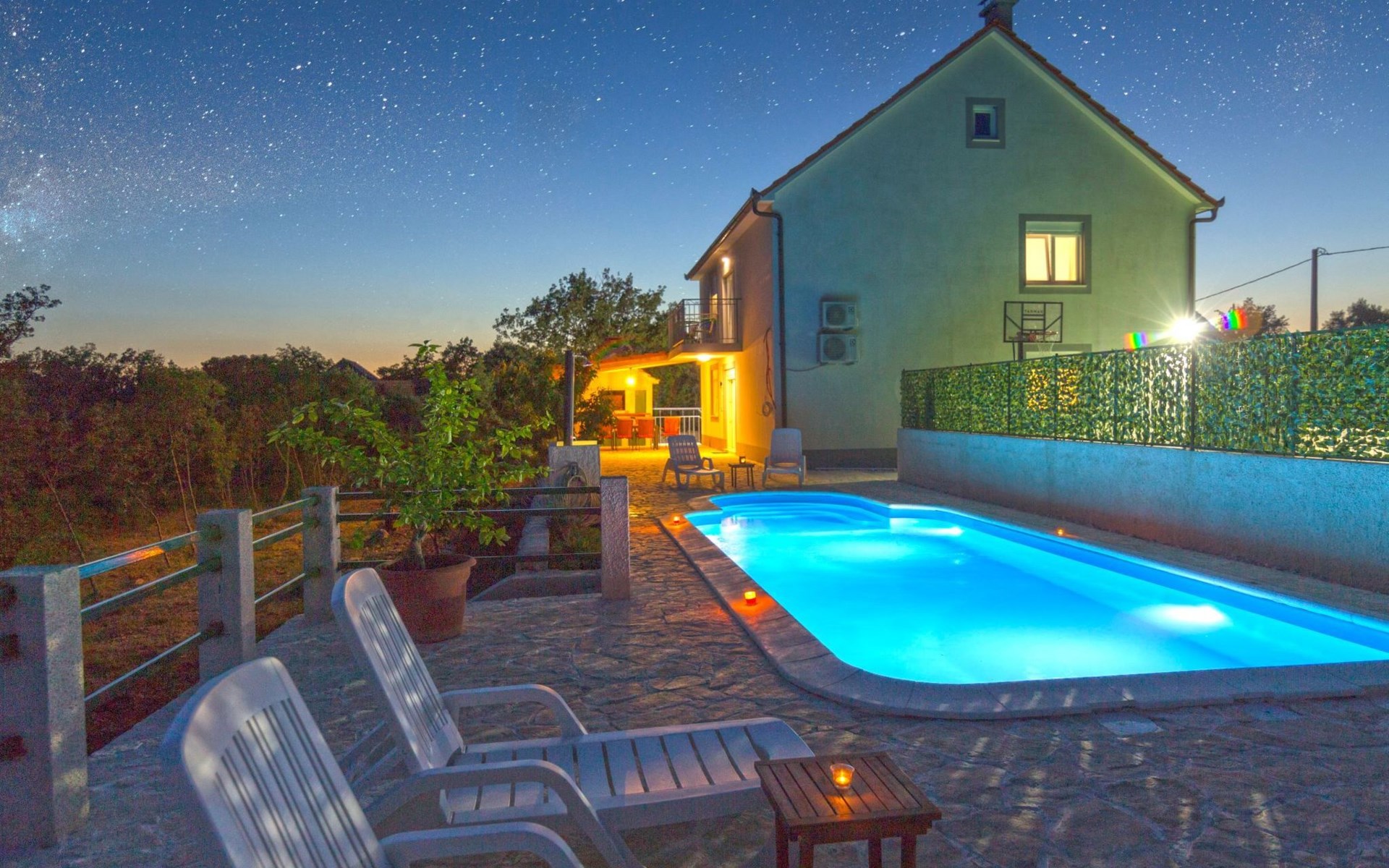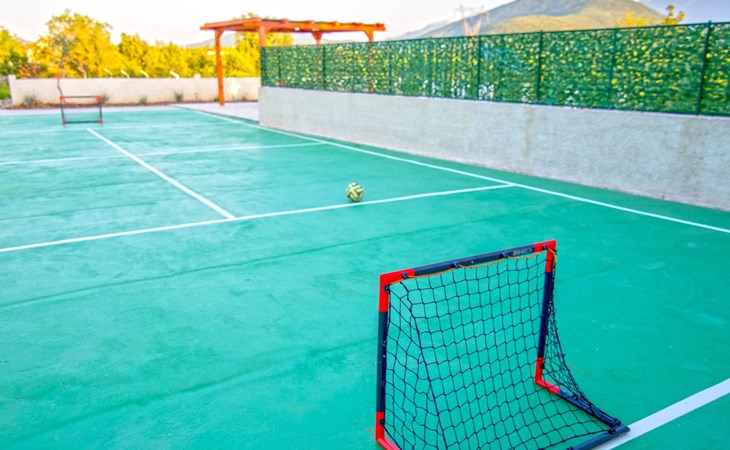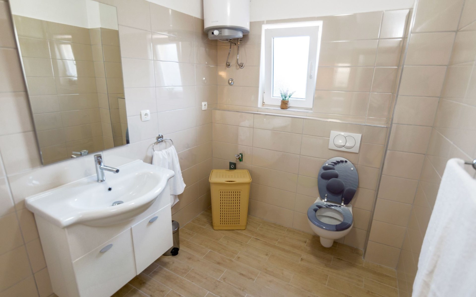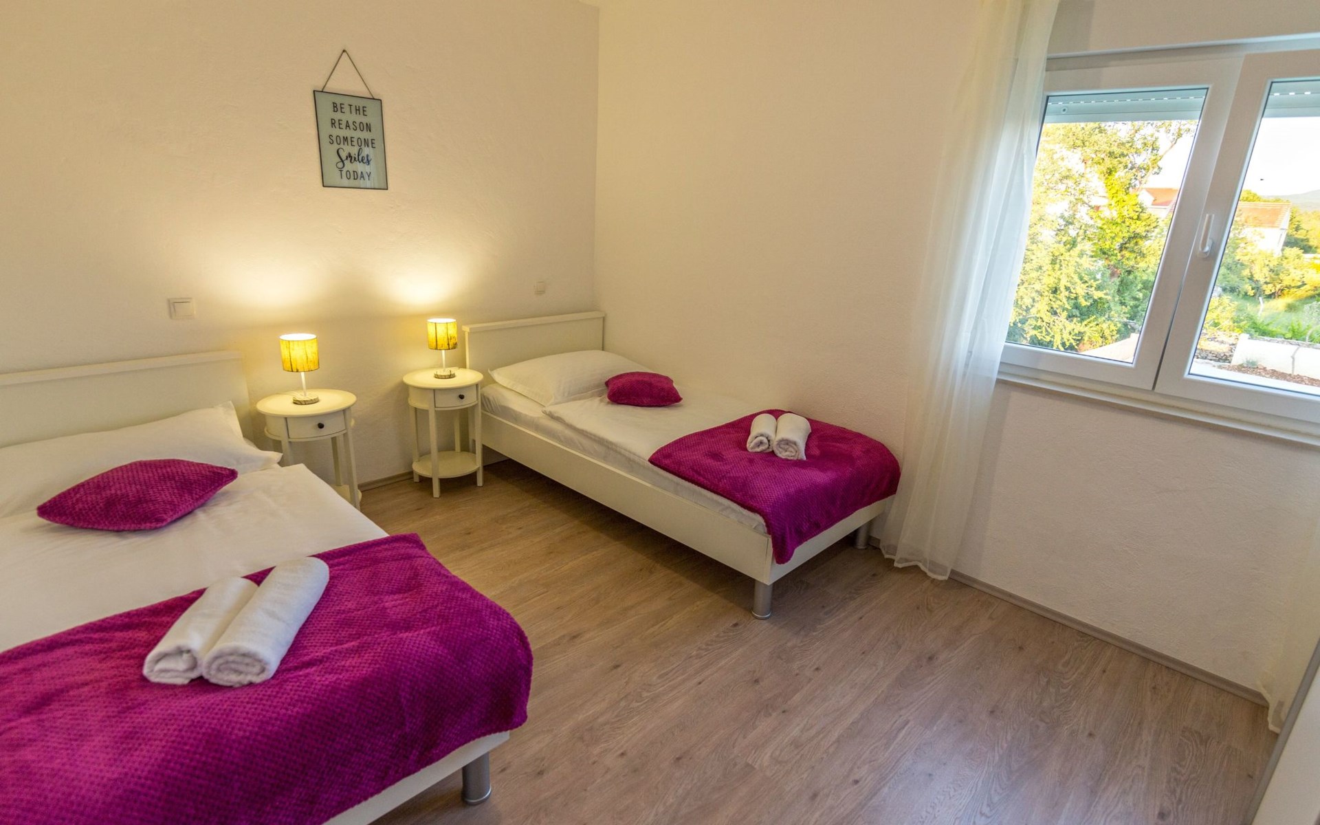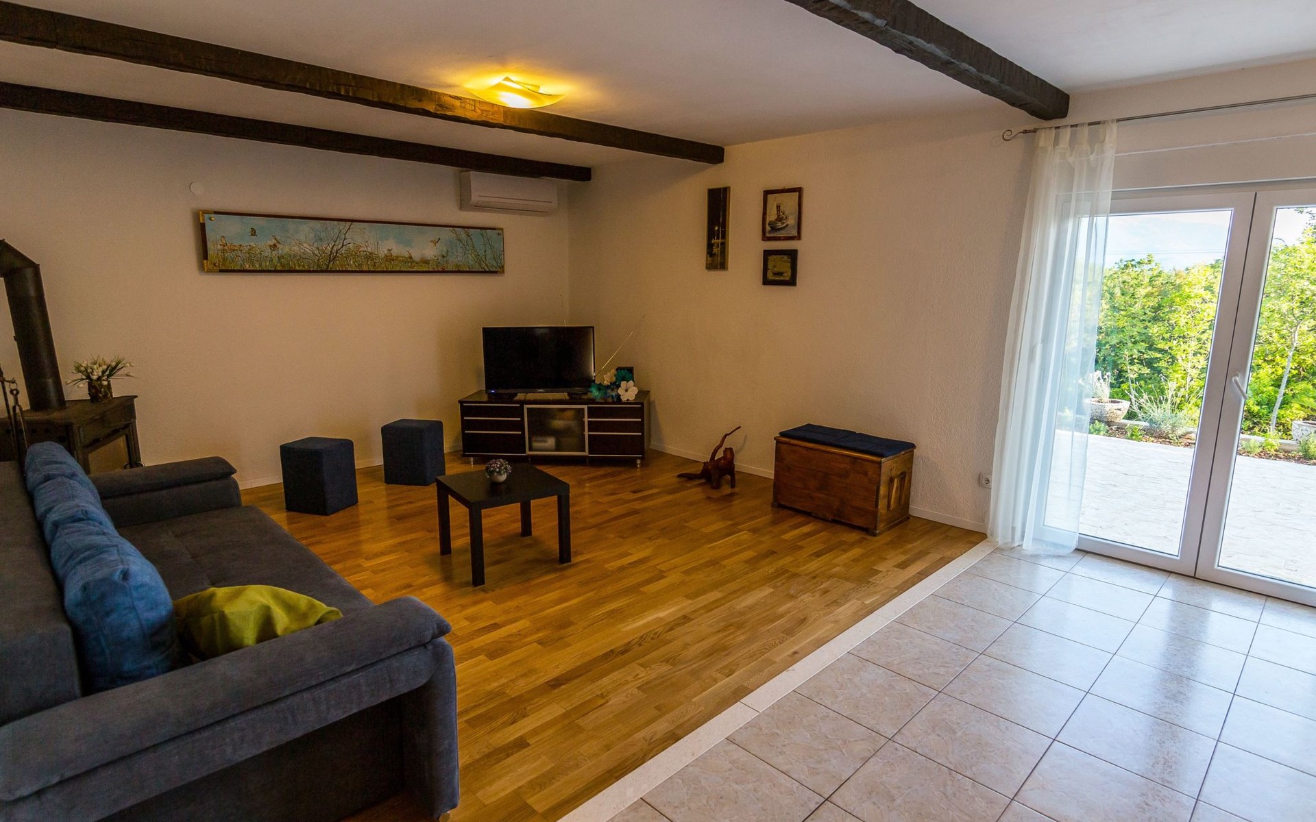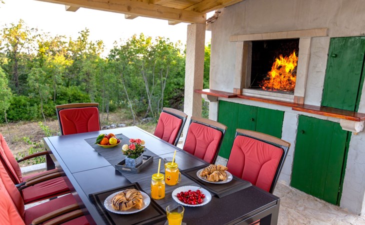 The house is a two-story, detached property located in Lovreć, near the town of Imotski, in the Split-Dalmatia County, Croatia. The property comprises a ground floor, first floor, and a roof. Both the ground floor and the first floor are separate apartments, each equipped with a kitchen, living room, dining area, two bedrooms, a bathroom, and a toilet. The living room on the first floor opens onto a balcony, while the ground floor opens to an outdoor area with a loggia, a swimming pool, a tennis court, and a children's playground. The tennis court is multifunctional and can also be used for mini football or basketball. The green areas around the house are mostly part of the property, so it’s not a problem if tennis or other balls end up there. The pool is private, spacious enough for a larger number of users, with heated water and an outdoor shower. The house is oriented north-south, with bedrooms on the north side and living areas on the south side. There are no neighbors on the south side of the house, ensuring privacy. On the north side, there is only a country road and parking spaces for cars, with a fence to close off the parking area. The entire house is rented as a single unit and can accommodate 1-12 people, ensuring that it is never shared between two groups or families who do not know each other. It is ideal for family vacations with children or for a group of friends wanting to spend their holiday together. The property is relatively close to larger well-known centers in Split-Dalmatia County (Imotski, Split, Omiš, Makarska, Dubrovnik).