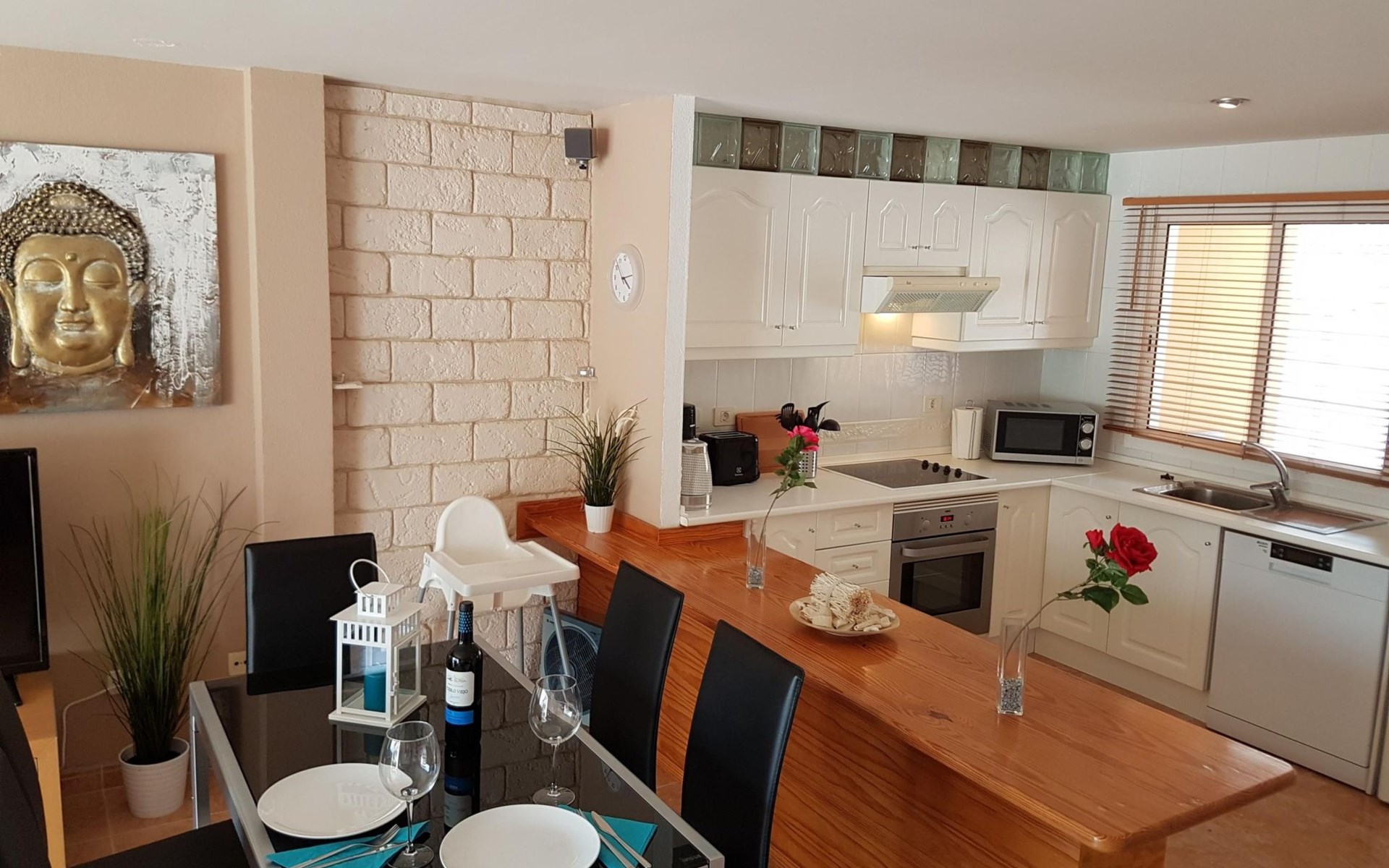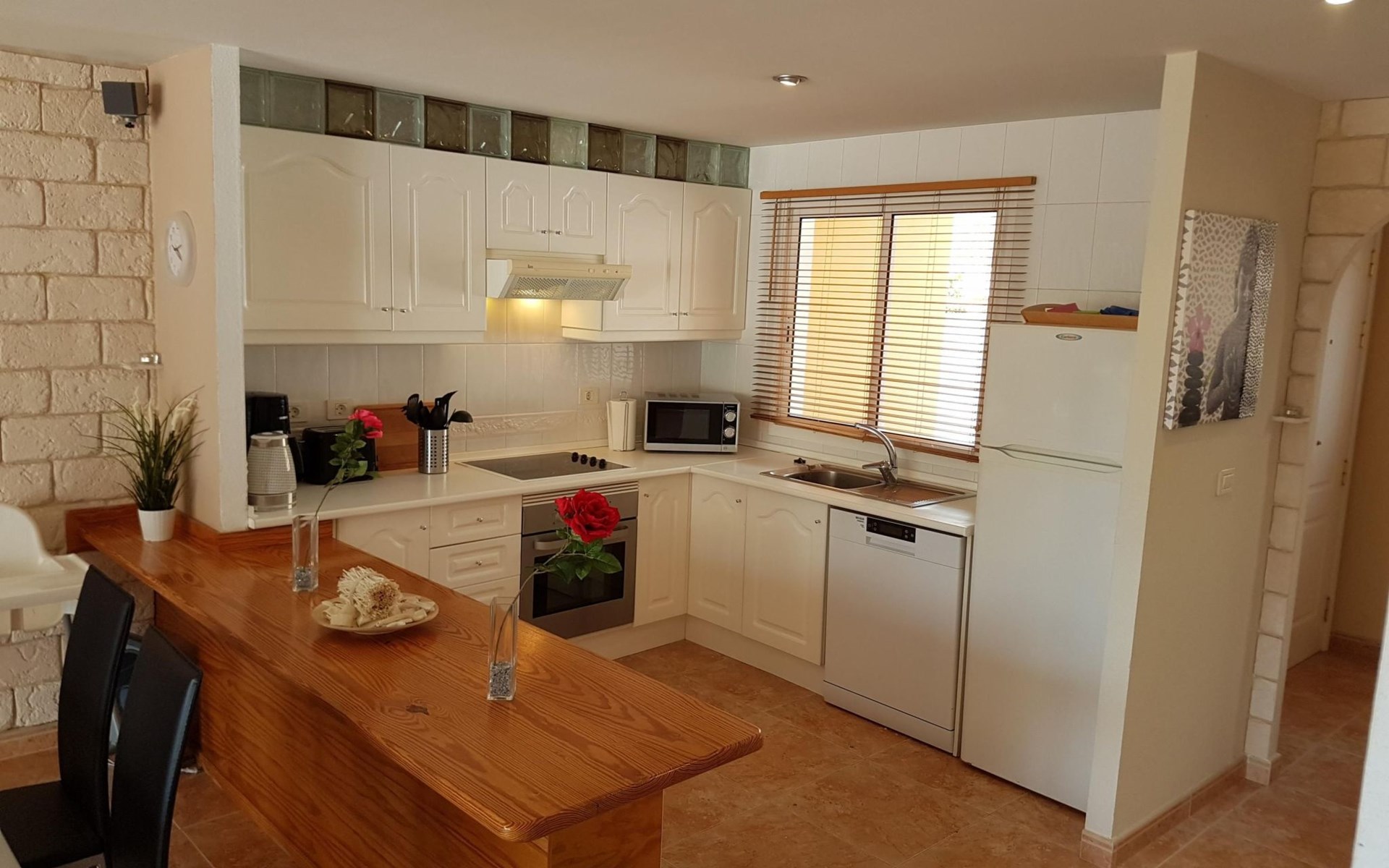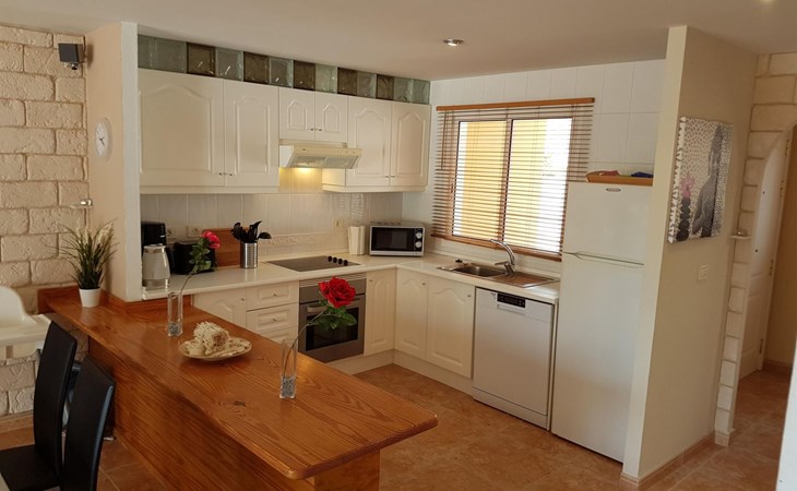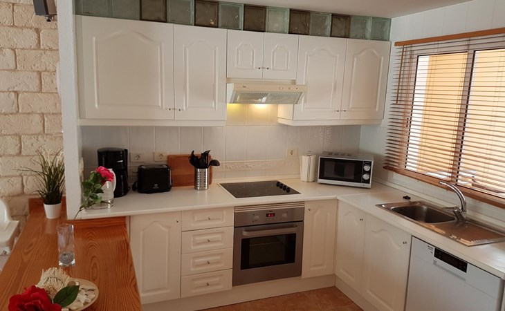De volledig uitgeruste keuken heeft een vaatwasser, fornuis met keramische kookplaat, oven, magnetron, koffiezetapparaat, broodrooster, waterkoker en een koelkast met vriesvak.