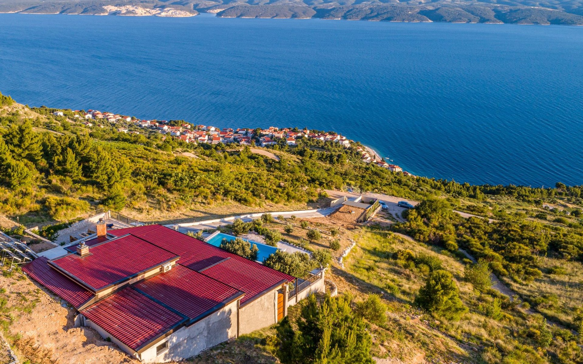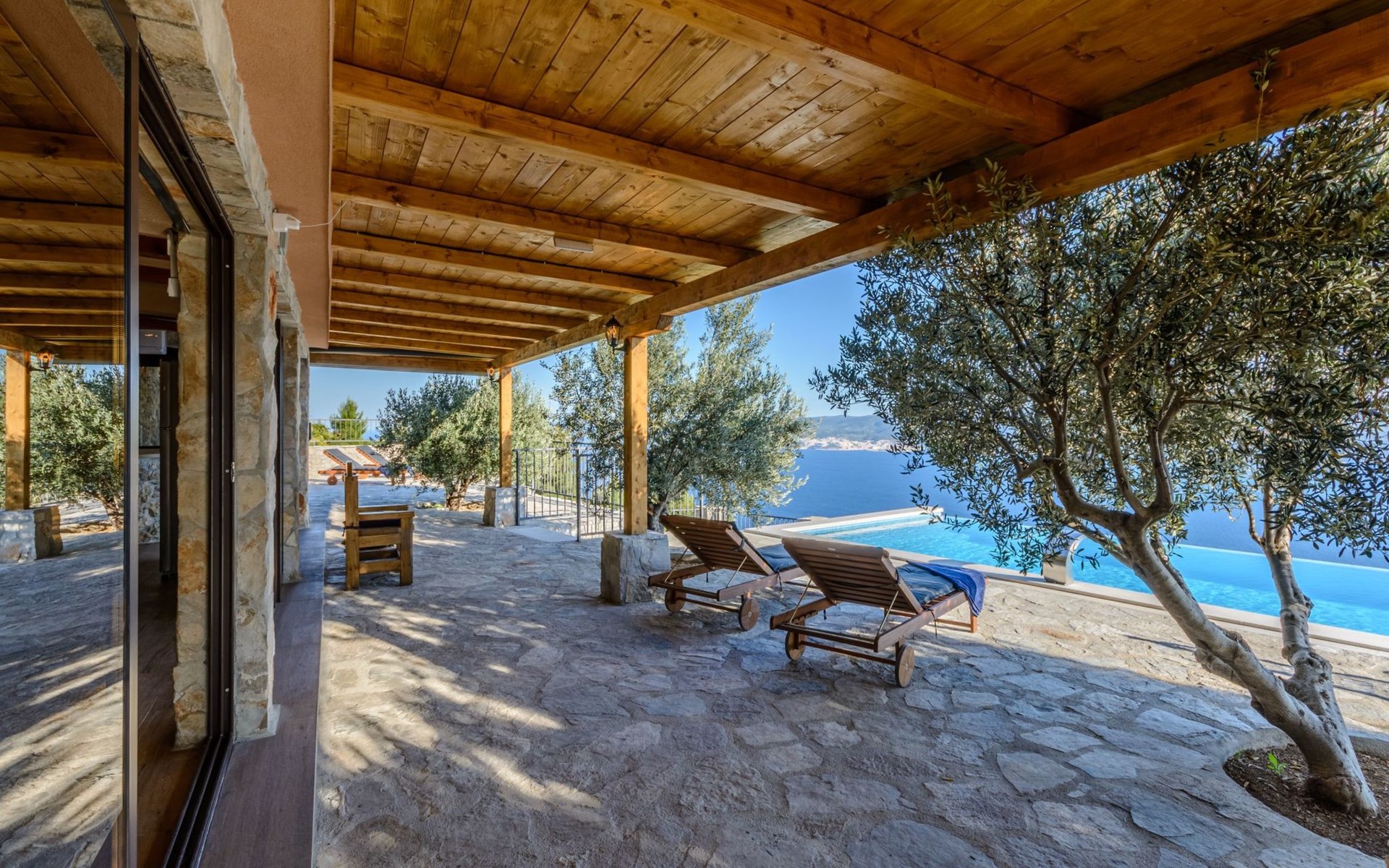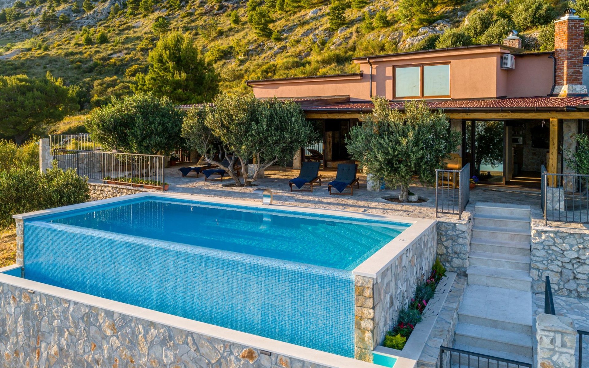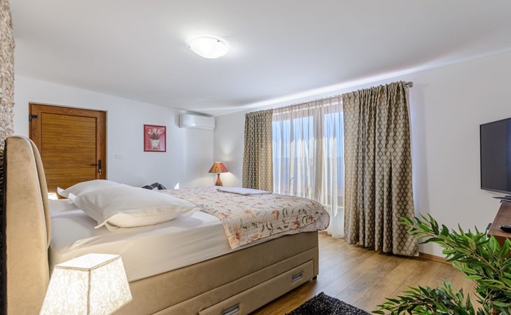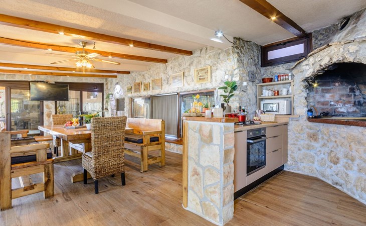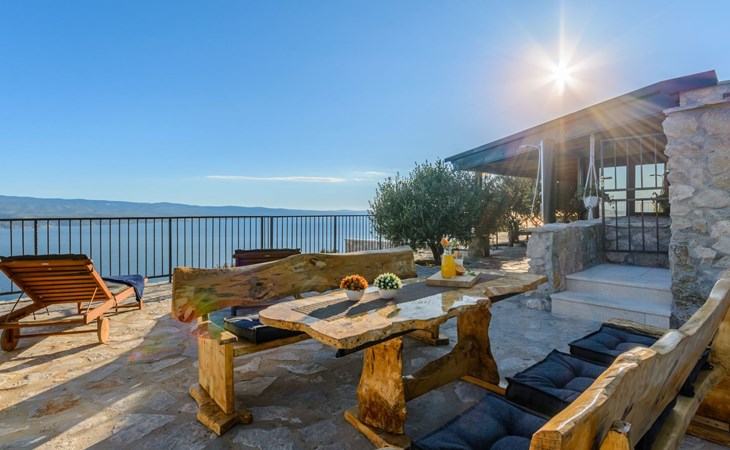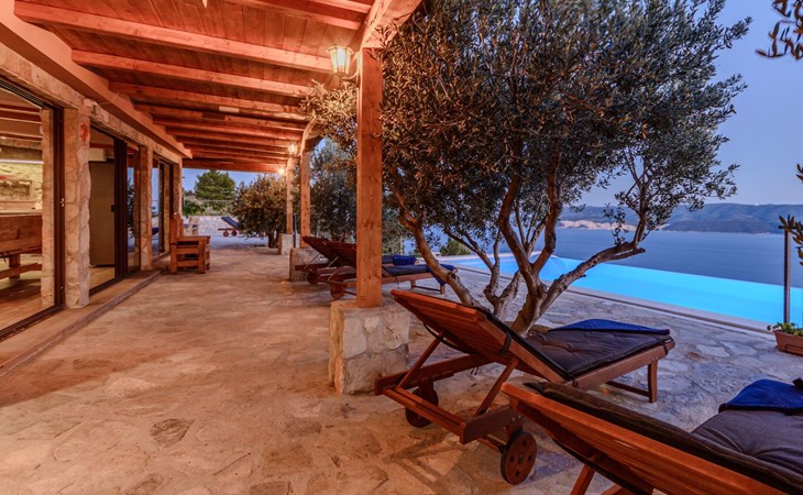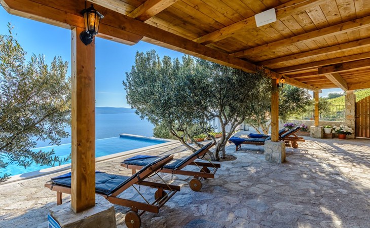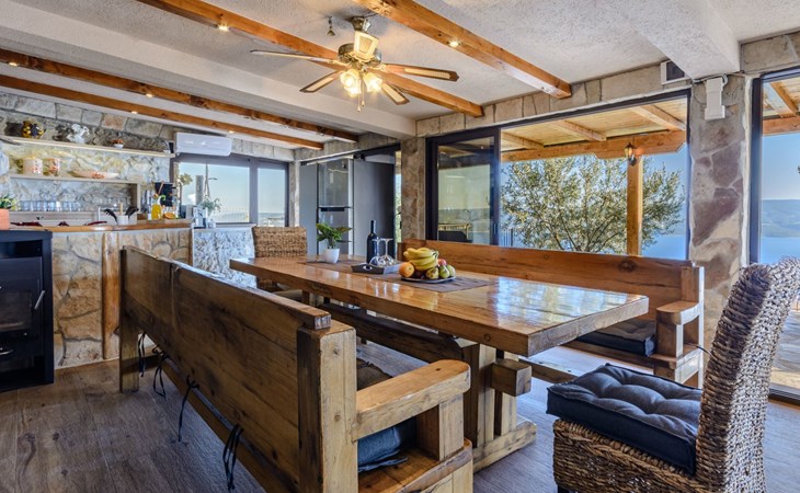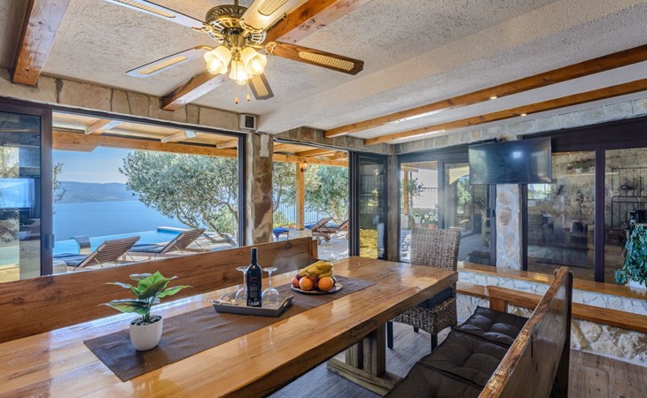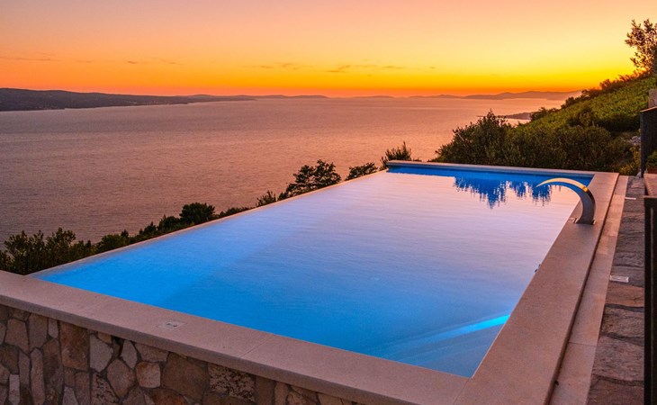 A brand new Villa, situated on a secluded hilltop approximately 4 km from the center of Omiš town, offering a breathtaking view of the Adriatic sea. For all our guests we offer absolute security and privacy, the perfect place for a relaxing holiday, peace and quiet all around with a beautiful terrace with garden furniture and sunshade just for your own private use.The Villa has four bedrooms and can accommodate up to 8 persons. In addition, the Villa features 3 bathrooms with a shower, hair dryer and a washing machine + tumble dryer. The kitchen is fully equipped and comes with an oven, a stove, a refrigerator, a water kettle, coffee machine, a microwave, a dishwasher, a toaster, pots and pans, plates, cutlery, glasses and any other kitchen equipment you may need. Both an outdoor and an indoor dining area are available. It also offers a heated outdoor swimming pool (infinity pool) and a large terrace with Grill / BBQ facilities for private use, with a stunning sea view. Additional amenities include Wi-Fi, air-conditioning (3 units in total), ceiling fans, flat-screen cable TV, a safety deposit box, iron. An outdoor heated pool with a spacious terrace with an outdoor dining area, sun loungers and umbrellas and BBQ facilities is a great place to relax and enjoy.Parking is secured right at the entrance of the Villa, private and free of charge.The Villa offers complete privacy as it is located ion a secluded location.Omis, a town surrounded by sea, a river and two mountains standing shoulder to shoulder, all within a 500 meter radius. Its medieval town core offers a number of bars and restaurants, whilst being within a walking distance from a centrally located sandy beach, a beach awarded a Blue Flag certificate as an indication of its high environmental and quality standards.In addition to the sun and the sea, all beaches in Omiš, as well as all other vast beaches of the Riviera offer a wide variety of entertainment and leisure activities such as jet-skis, boat or kayak rental or sea trampolines.If your perfect vacation includes a dose of adrenaline, then Omiš is definitely the right choice for you. There is a wide offer of activities and tours, enough to satisfy everyone, from solo travellers to families with teenage kids seeking thrill in a number of activities, such as canyoning, rafting, ziplining, canoeing, sea kayaking, wind surfing …