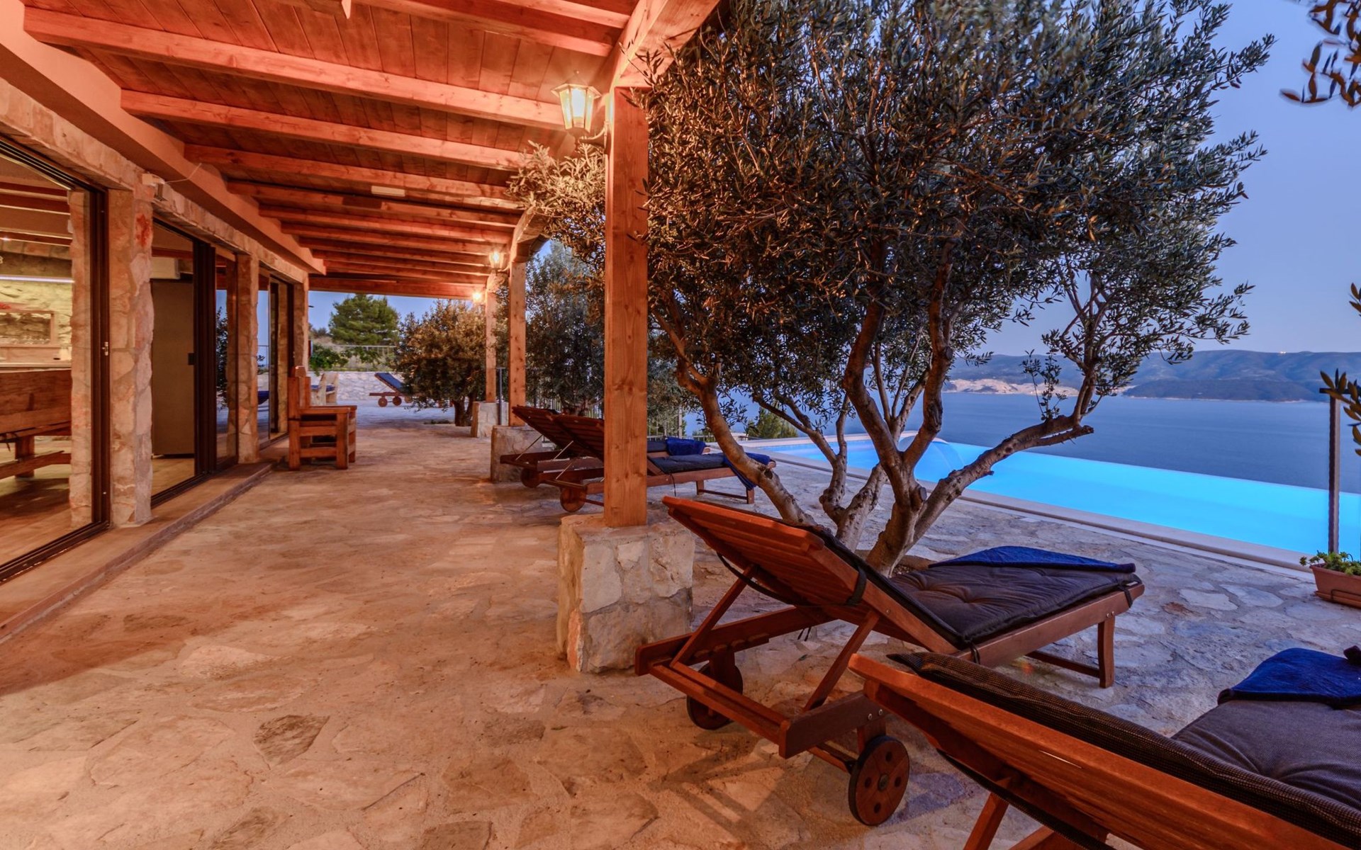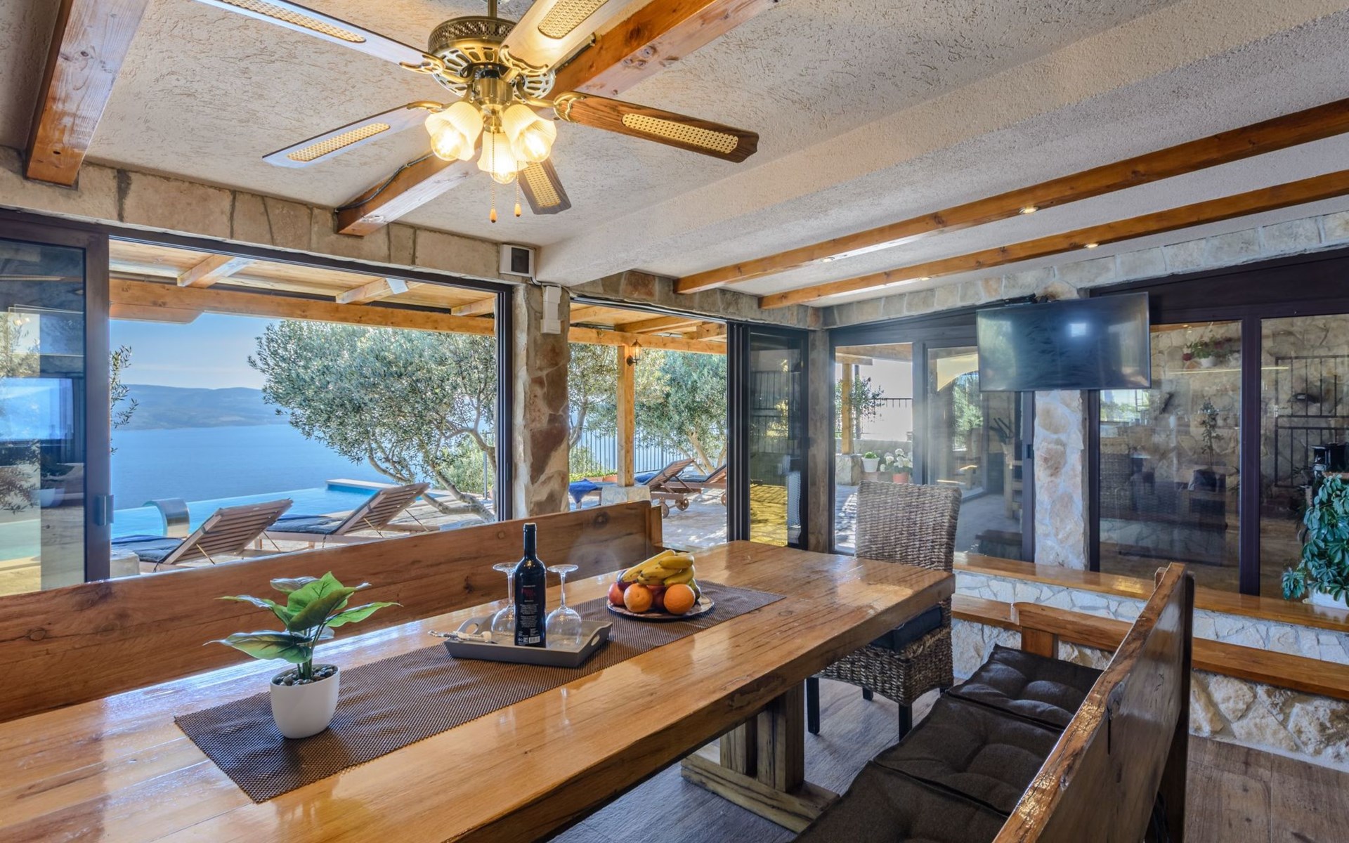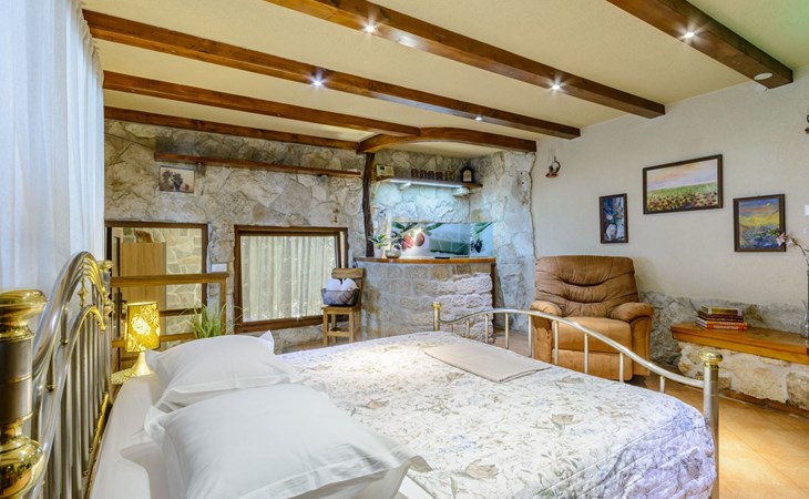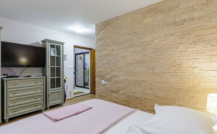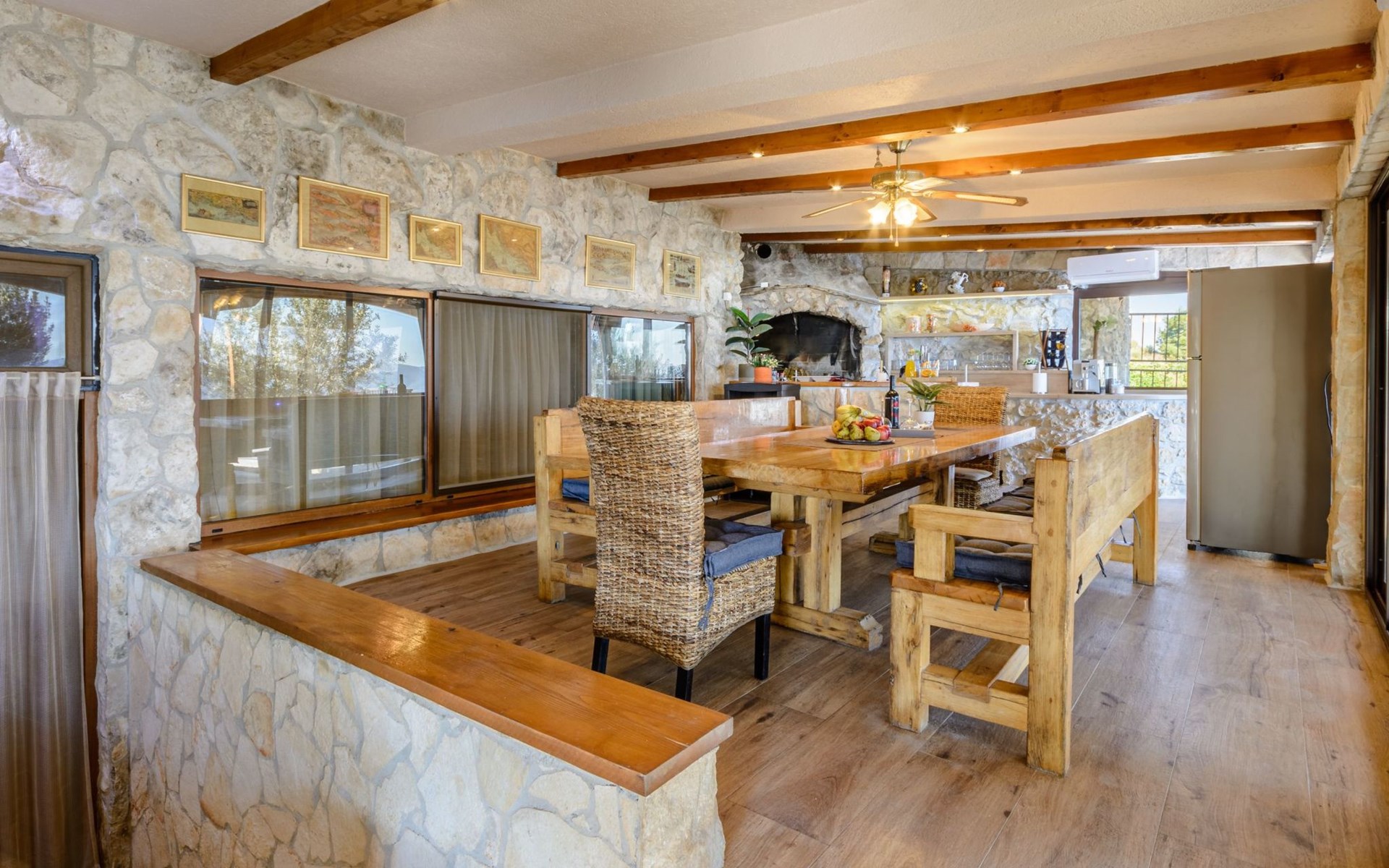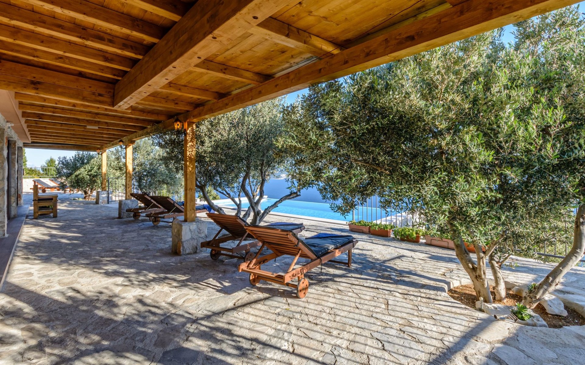 A brand new Villa, situated on a secluded hilltop approximately 4 km from the center of Omiš town, offering a breathtaking view of the Adriatic sea. For all our guests we offer absolute security and privacy, the perfect place for a relaxing holiday, peace and quiet all around with a beautiful terrace with garden furniture and sunshade just for your own private use.The Villa has four bedrooms and can accommodate up to 8 persons. In addition, the Villa features 3 bathrooms with a shower, hair dryer and a washing machine + tumble dryer. The kitchen is fully equipped and comes with an oven, a stove, a refrigerator, a water kettle, coffee machine, a microwave, a dishwasher, a toaster, pots and pans, plates, cutlery, glasses and any other kitchen equipment you may need. Both an outdoor and an indoor dining area are available. It also offers a heated outdoor swimming pool (infinity pool) and a large terrace with Grill / BBQ facilities for private use, with a stunning sea view. Additional amenities include Wi-Fi, air-conditioning (3 units in total), ceiling fans, flat-screen cable TV, a safety deposit box, iron. An outdoor heated pool with a spacious terrace with an outdoor dining area, sun loungers and umbrellas and BBQ facilities is a great place to relax and enjoy.Parking is secured right at the entrance of the Villa, private and free of charge.The Villa offers complete privacy as it is located ion a secluded location.Omis, a town surrounded by sea, a river and two mountains standing shoulder to shoulder, all within a 500 meter radius. Its medieval town core offers a number of bars and restaurants, whilst being within a walking distance from a centrally located sandy beach, a beach awarded a Blue Flag certificate as an indication of its high environmental and quality standards.In addition to the sun and the sea, all beaches in Omiš, as well as all other vast beaches of the Riviera offer a wide variety of entertainment and leisure activities such as jet-skis, boat or kayak rental or sea trampolines.If your perfect vacation includes a dose of adrenaline, then Omiš is definitely the right choice for you. There is a wide offer of activities and tours, enough to satisfy everyone, from solo travellers to families with teenage kids seeking thrill in a number of activities, such as canyoning, rafting, ziplining, canoeing, sea kayaking, wind surfing …