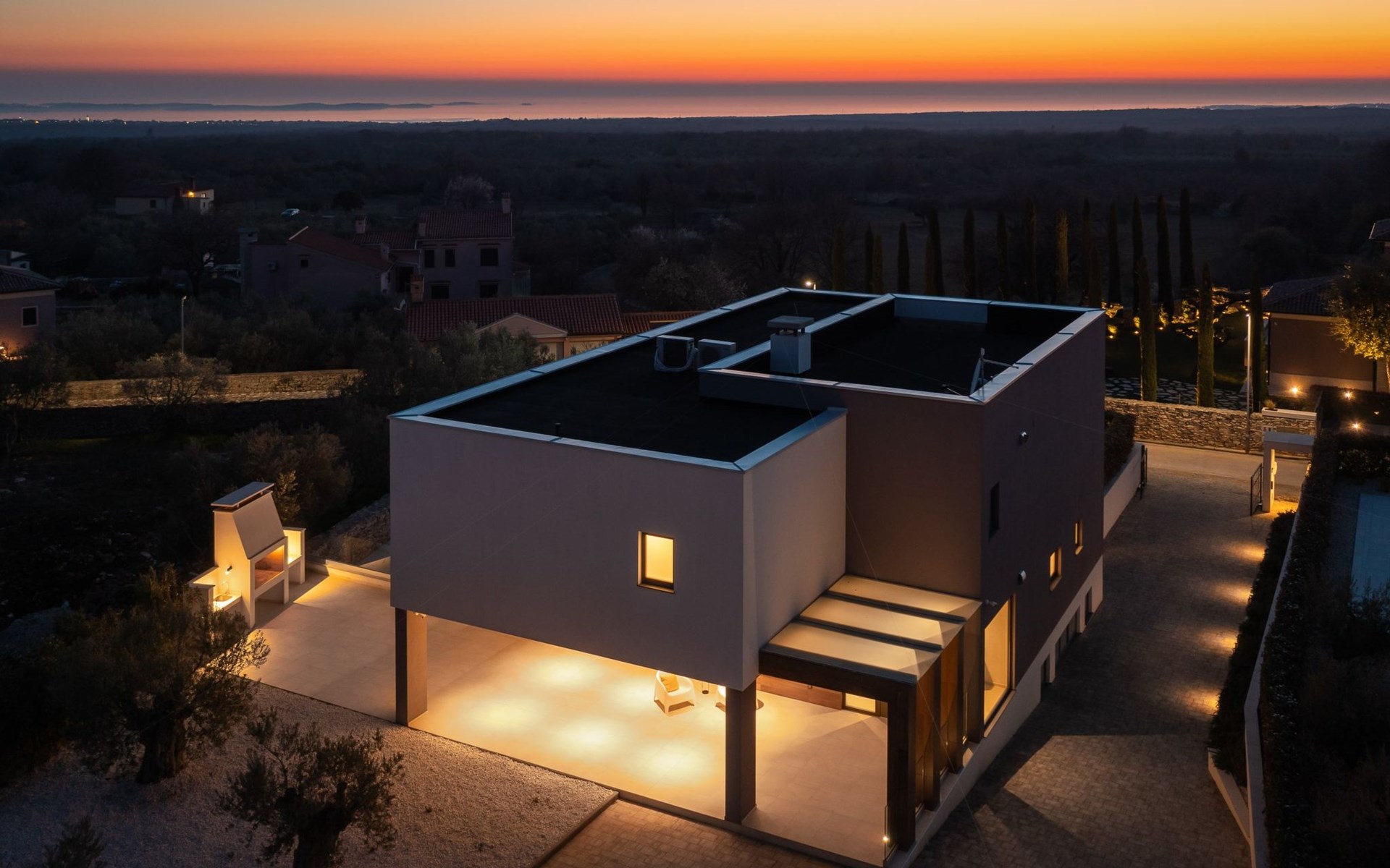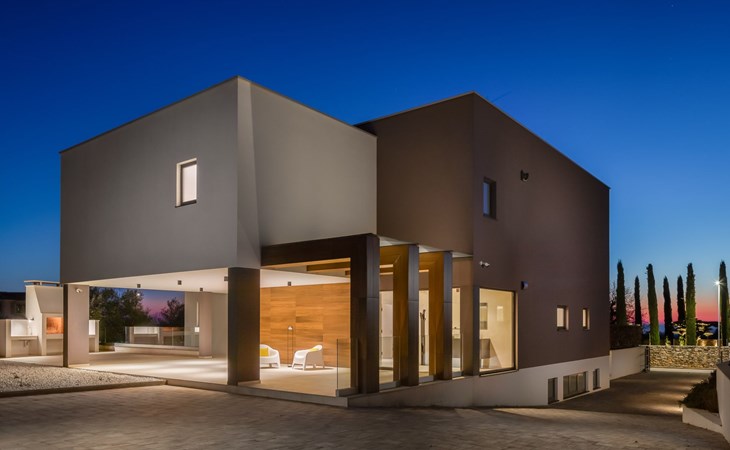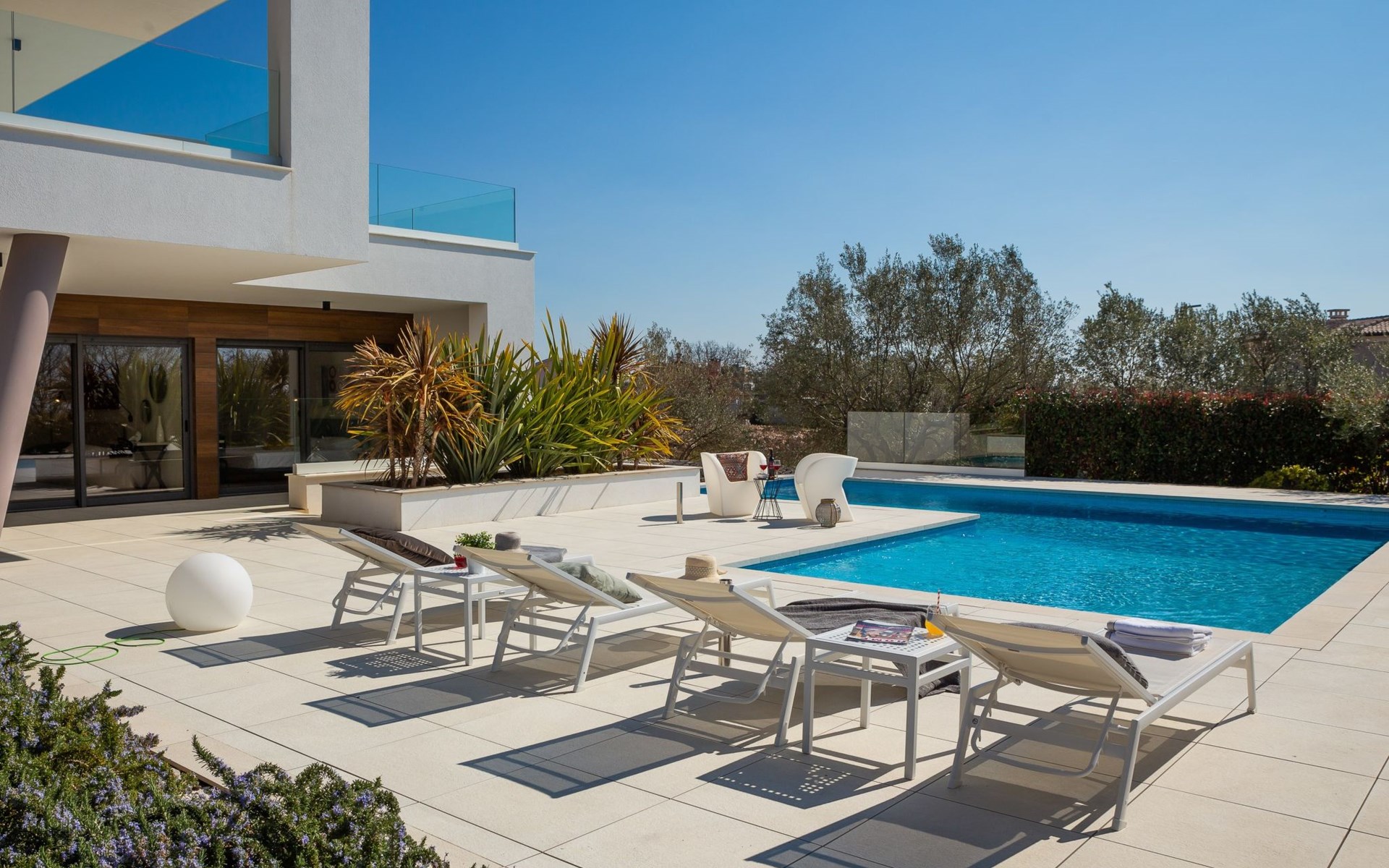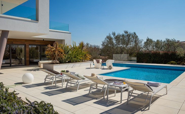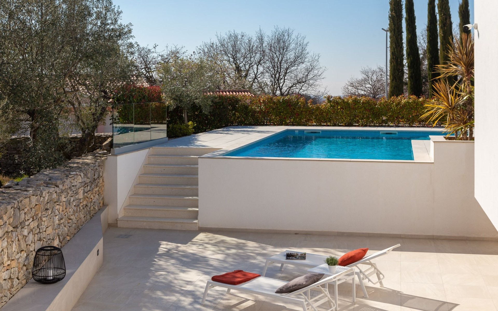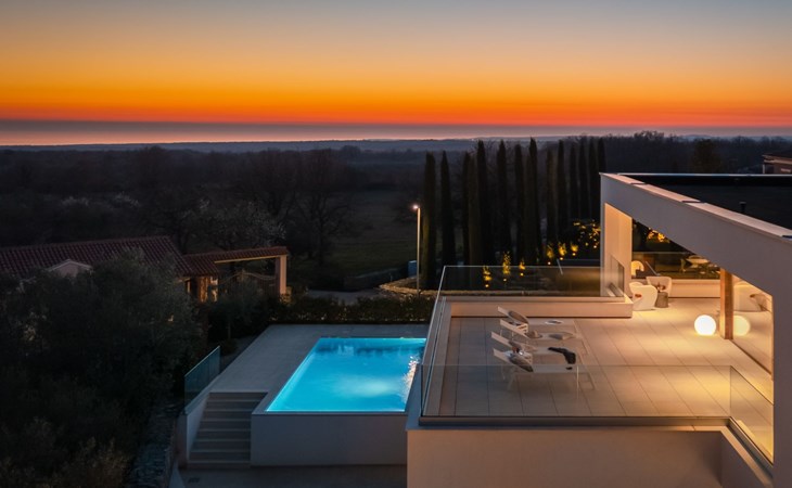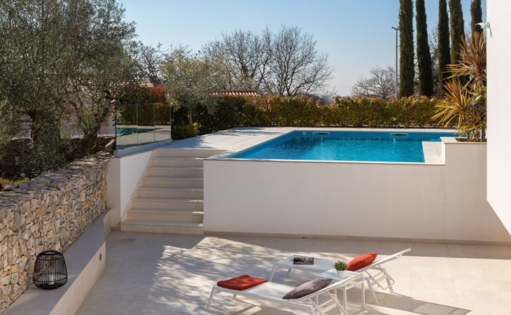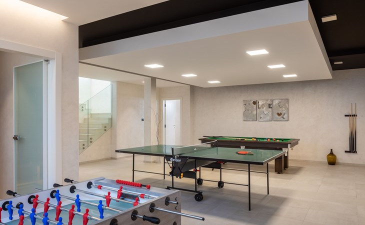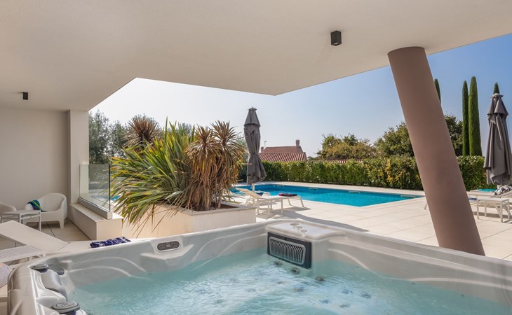 Vodnjan: Moderne villa "Old Olive I", van 3 verdiepingen. In het gehucht Salvela, 1 km van het centrum van Vodnjan, 7 km van het centrum van Fažana, 10 km van het centrum van Pula, zonnige ligging, 7 km van zee. Voor alleengebruik: terrein 1.000 m2 (omheind), tuin met planten en bomen, openluchtzwembad (65 m2, 30 - 140 cm diepte, seizoensgebonden beschikbaarheid: 01.Mrt. - 01.Nov.) met trap. Onregelmatig zwembad. WC bij het zwembad, buitendouche, hot tub, barbecue. In het huis: internetaansluiting, sauna, tafeltennis, biljart, tafelvoetbal, wasmachine, droger. Parkeerplaats (voor 3 auto's) bij het huis op het terrein. Winkel 1 km, supermarkt 1 km, restaurant 1.5 km, bushalte 1.4 km, kiezelstrand 7 km, strandbad 7 km. Golfterrein (18 holes) 7 km, tennis 2 km. Attracties in de buurt: NP Brijuni 7 km, Amphitheater 11 km. Groepen jongeren uitsluitend op aanvraag.