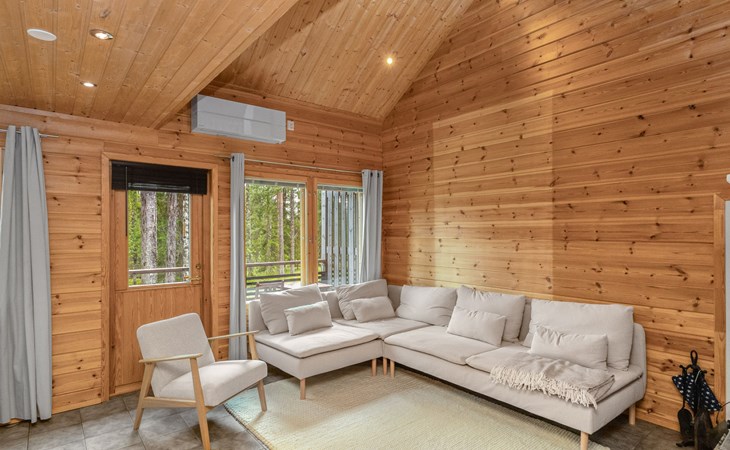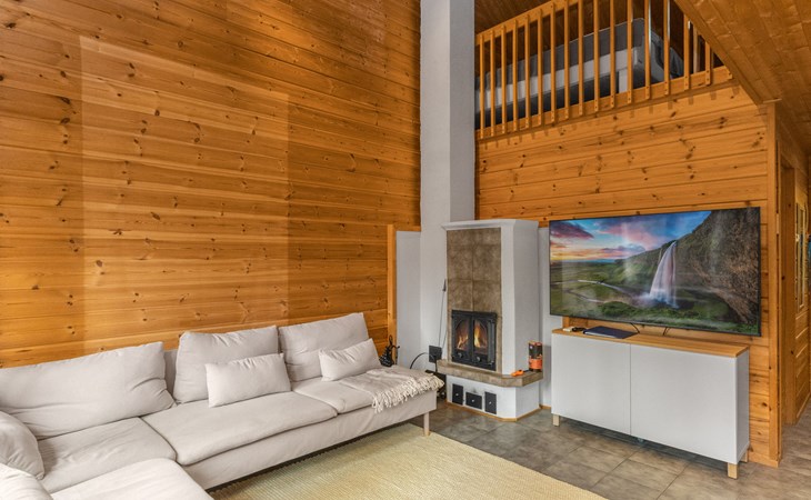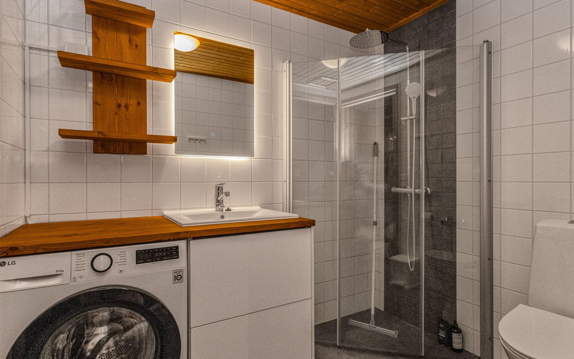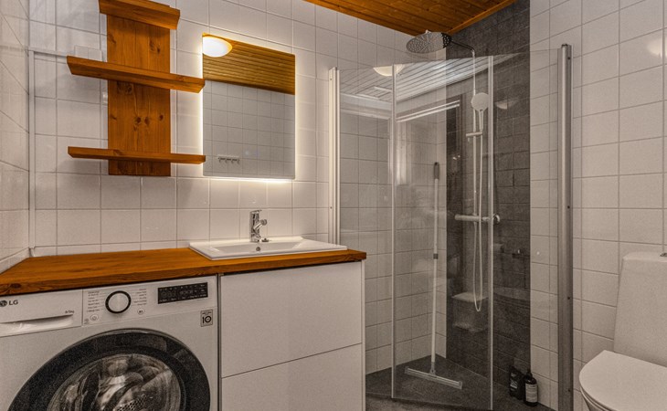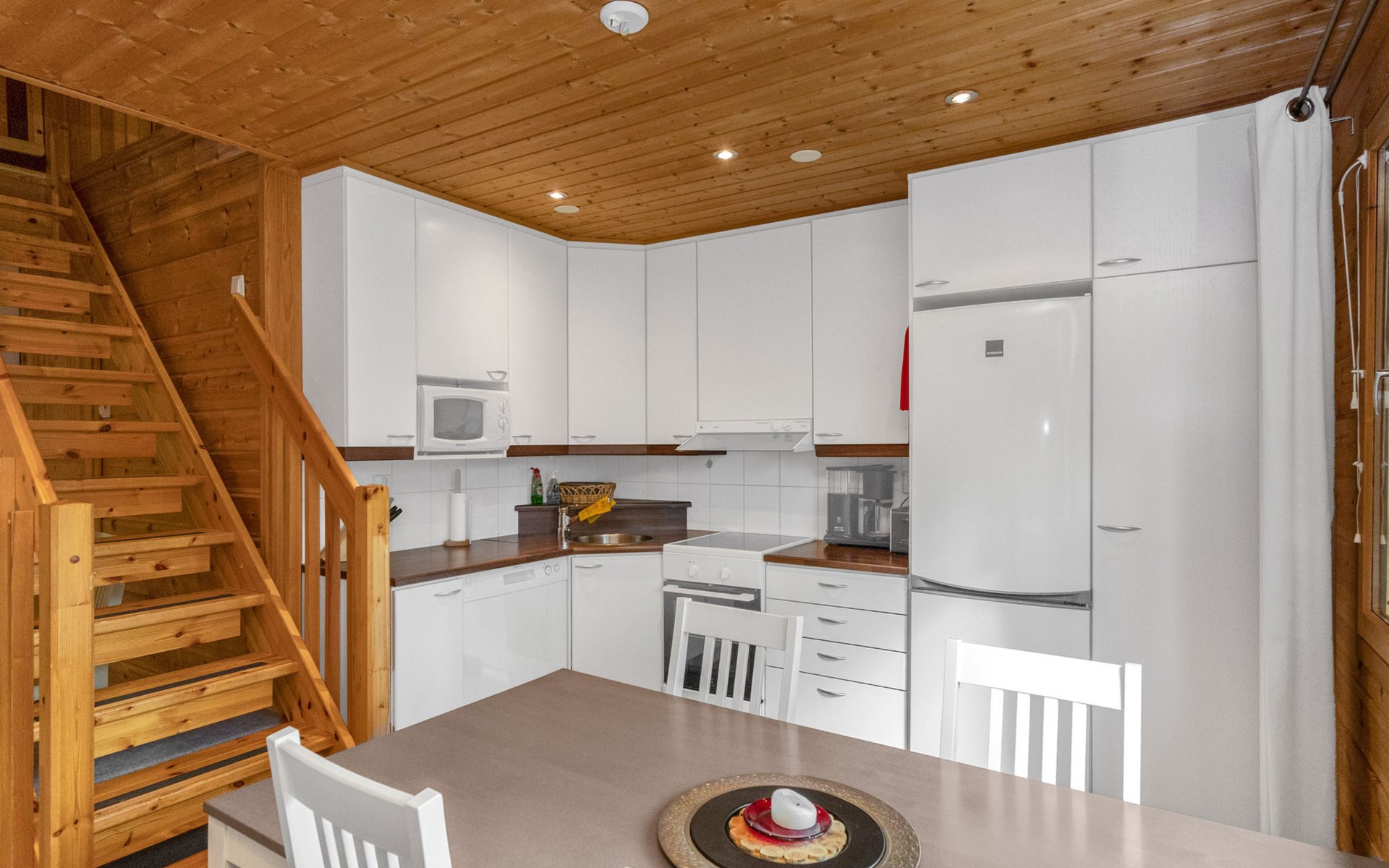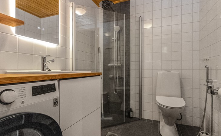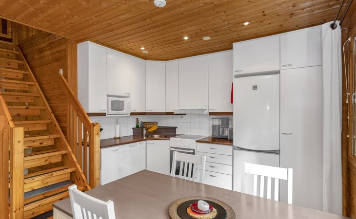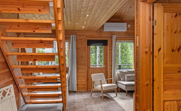 The apartment living area 54 m2 first floor + 13 m2 loft, a living room/kitchen, one bedroom with two separate 90 cm wide beds (renewed in 2025), and a loft (13 m²) with two separate 80 cm beds (renewed in 2025). The apartment also includes a sauna with an electric stove and a washroom/WC. The washroom has been recently renovated, and the living area has also been refreshed.