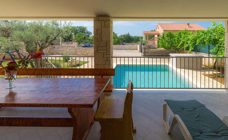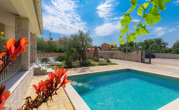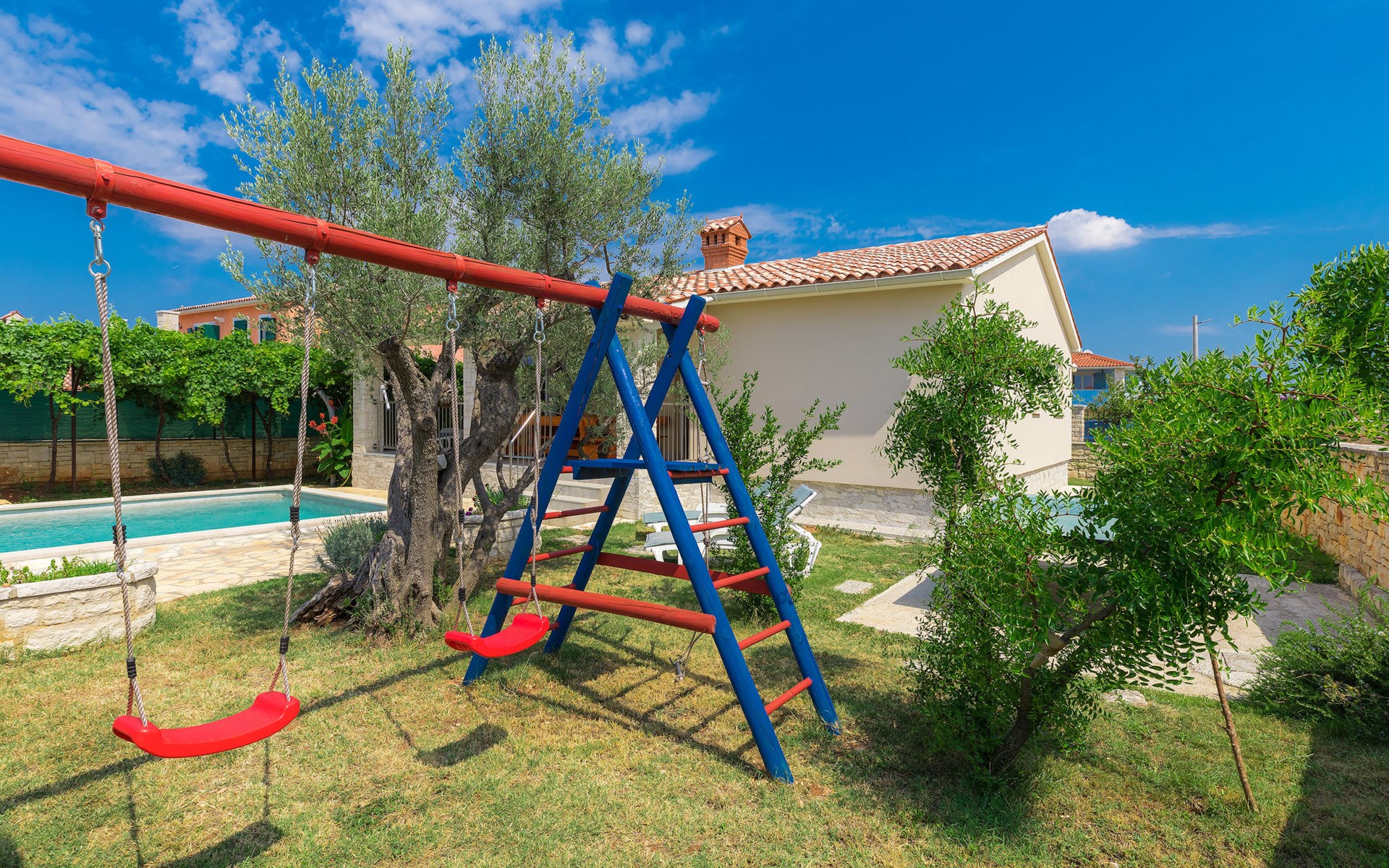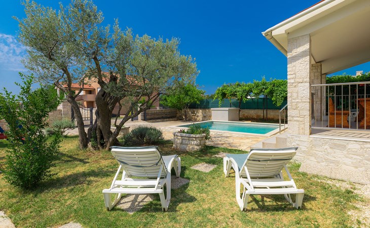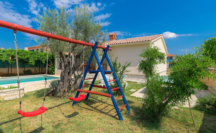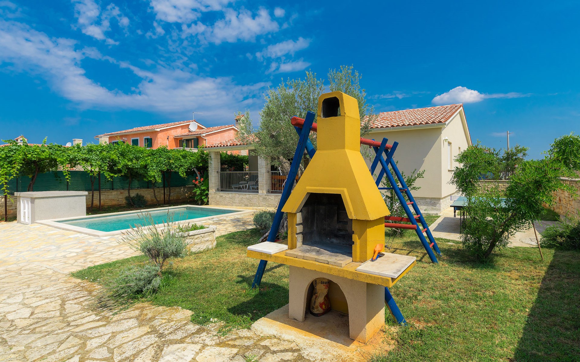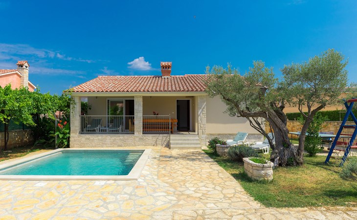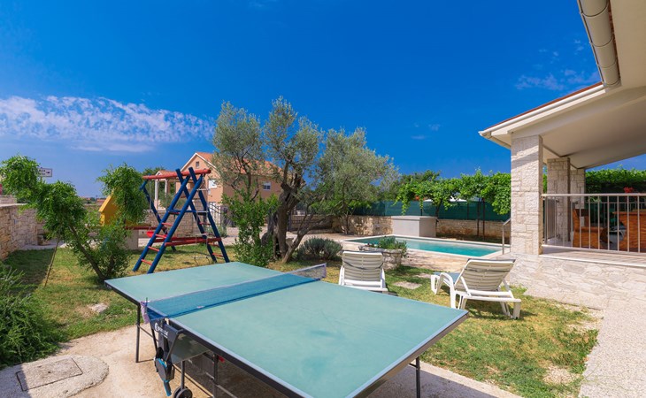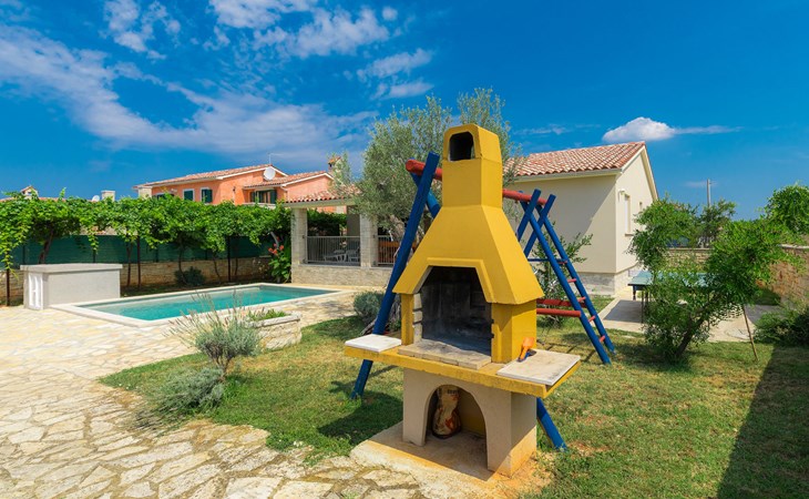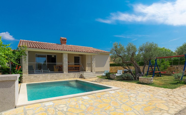 Eengezinswoning "Goldi". In het gehucht Golubovo, 7 km van het centrum van Vodnjan, 4 km van zee, 4 km van het strand. Voor alleengebruik: terrein 500 m2 (omheind), gazon en planten, openluchtzwembad (5 x 4 m, 140 cm diepte, seizoensgebonden beschikbaarheid: 15.Apr. - 14.Okt.). Buitendouche, tafeltennis, barbecue (glijbaan). In het huis: internetaansluiting, wasmachine. Parkeerplaats (voor 2 auto's) op het terrein. Supermarkt 7 km, bushalte 3.6 km, kiezelstrand 4 km, rotsstrand 4 km.