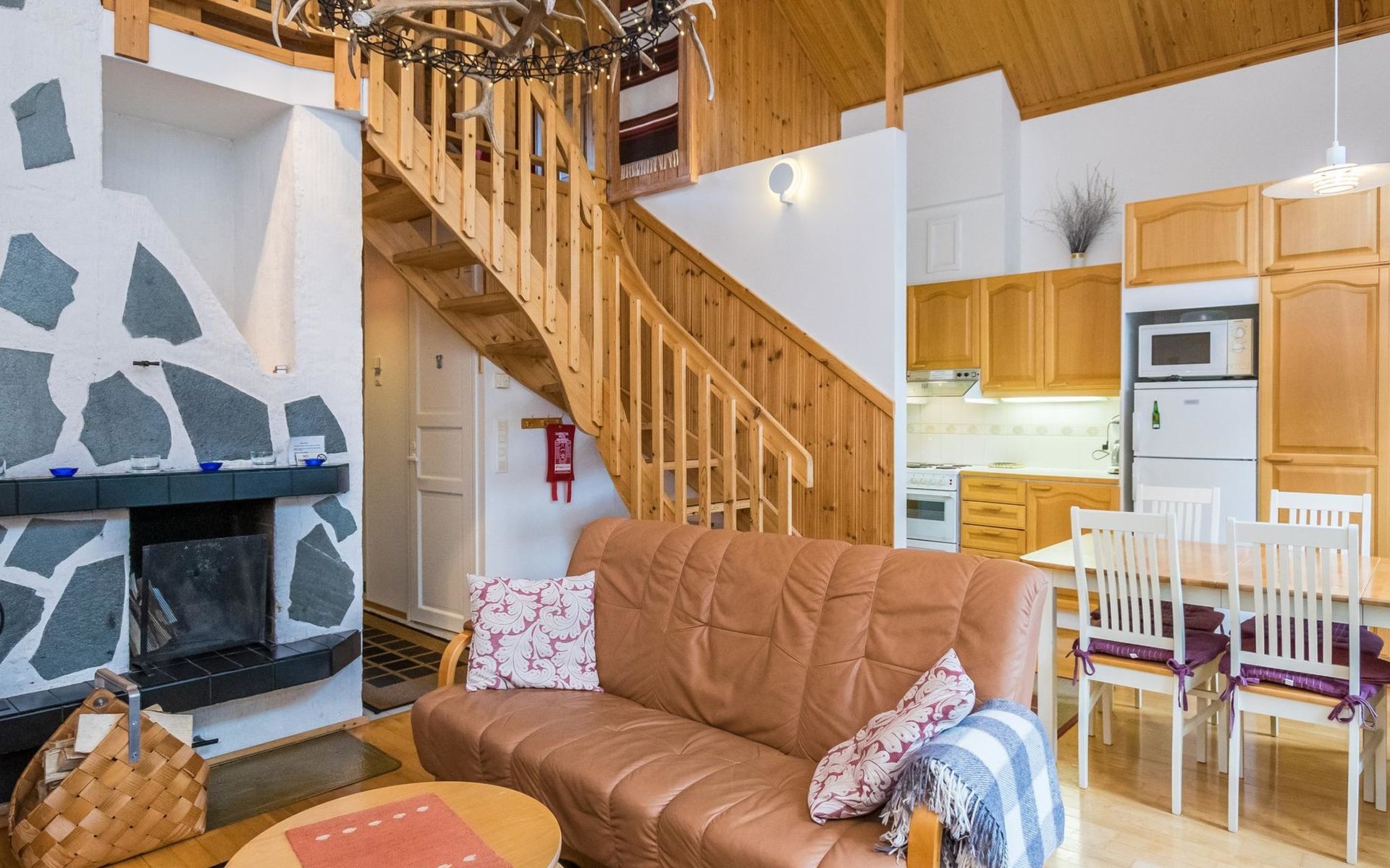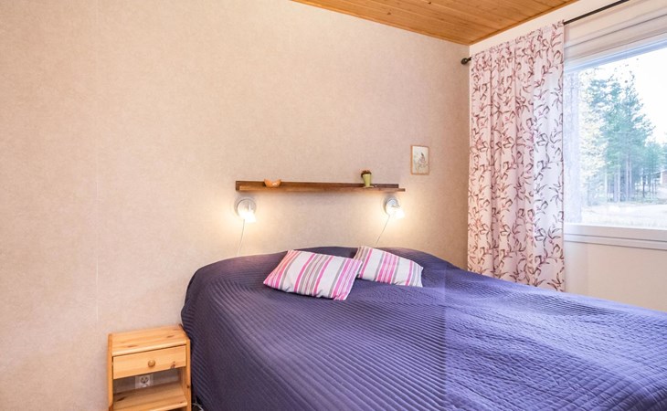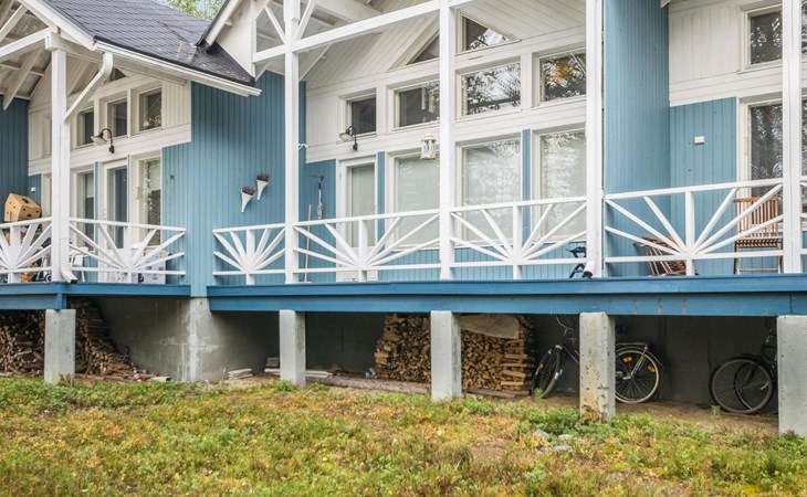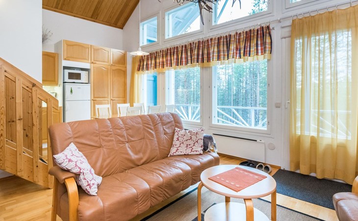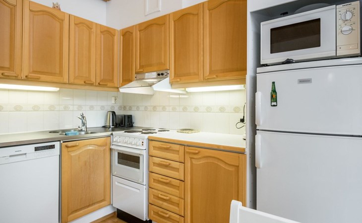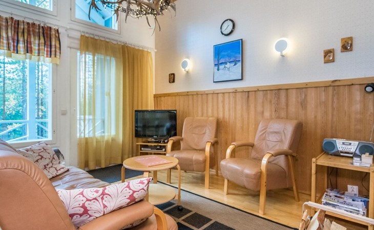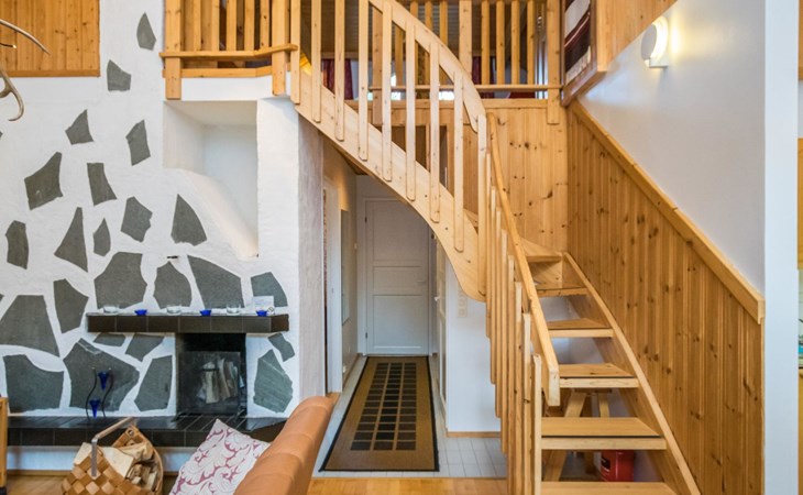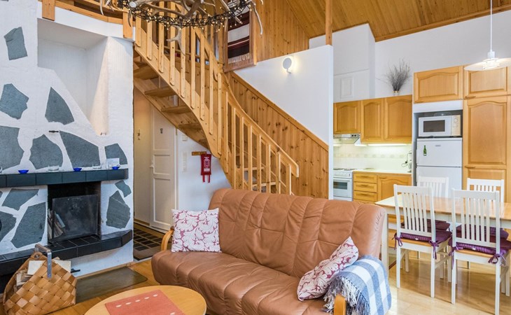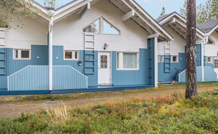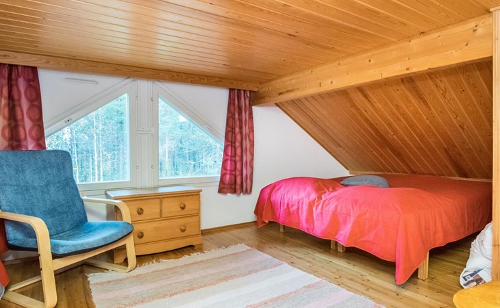 Part of row house built 1991, with living room/ kitchen, bedroom with double bed, sauna and washroom, WC and sleeping loft, with two divan double beds which can, however, each be separated to make two single divan beds (four in all), and one separate single divan bed. Outside terrace.