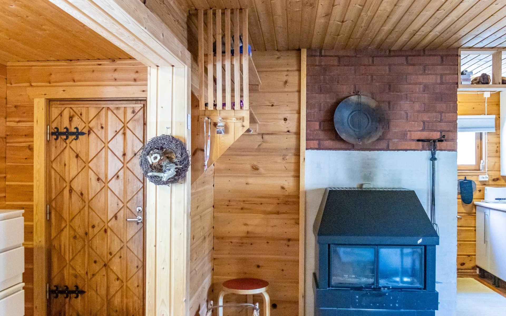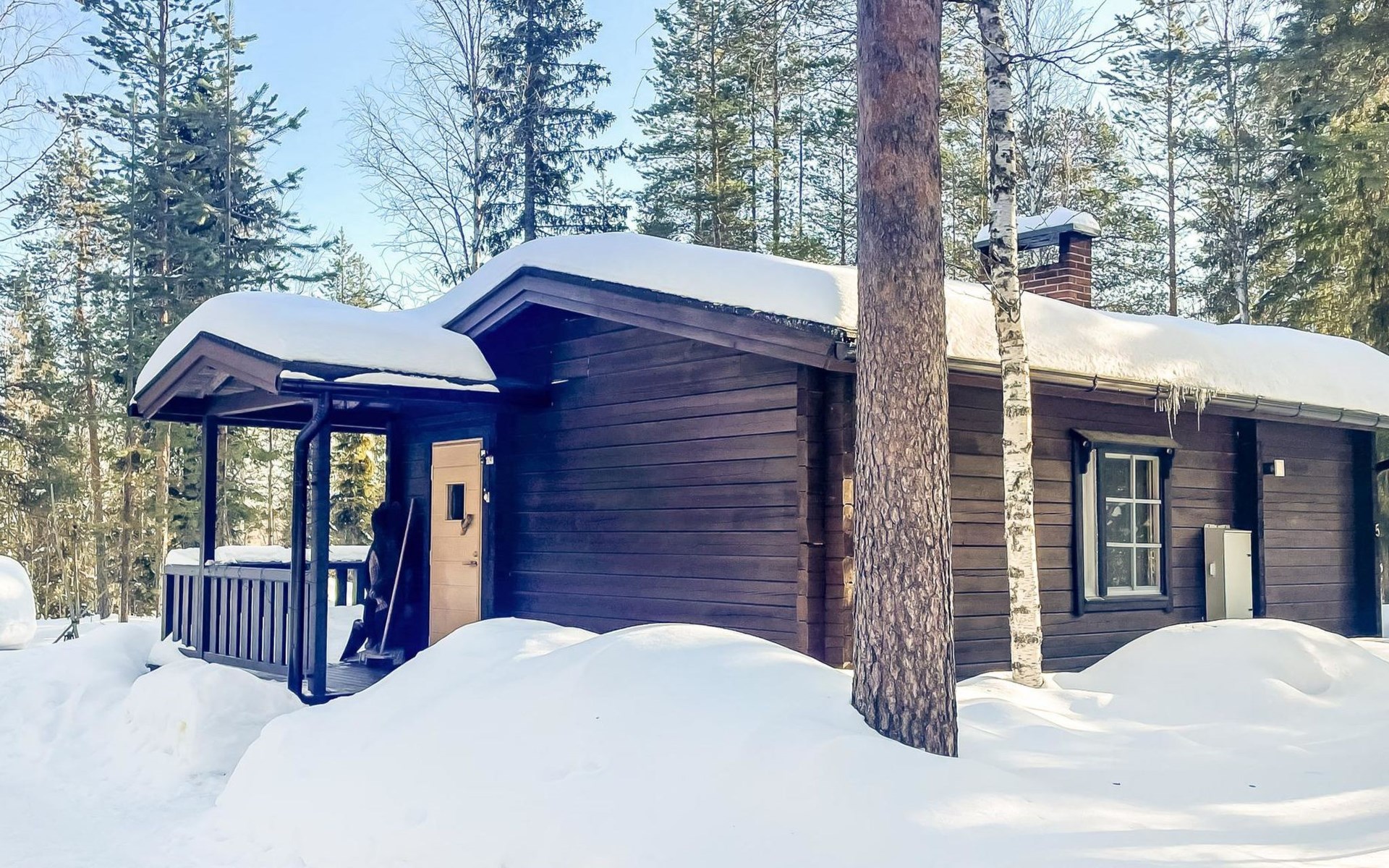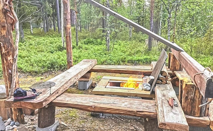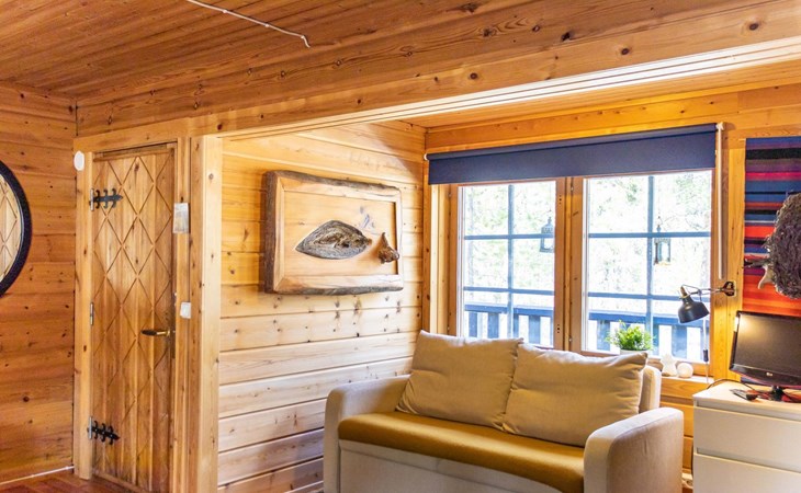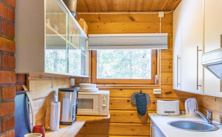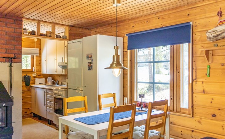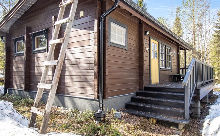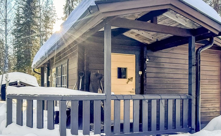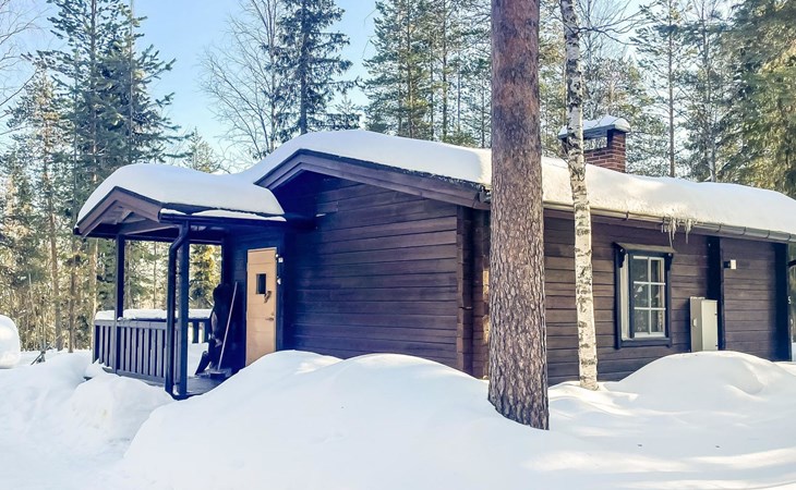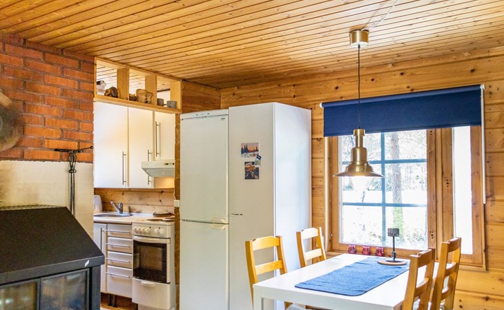 The 45 m2 cabin includes a living room/kitchen, a bathroom, sauna, and a terrace. Outside, there is also a campfire site. The cabin was originally built in 1982 with an extension added in the early 2000s.