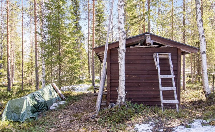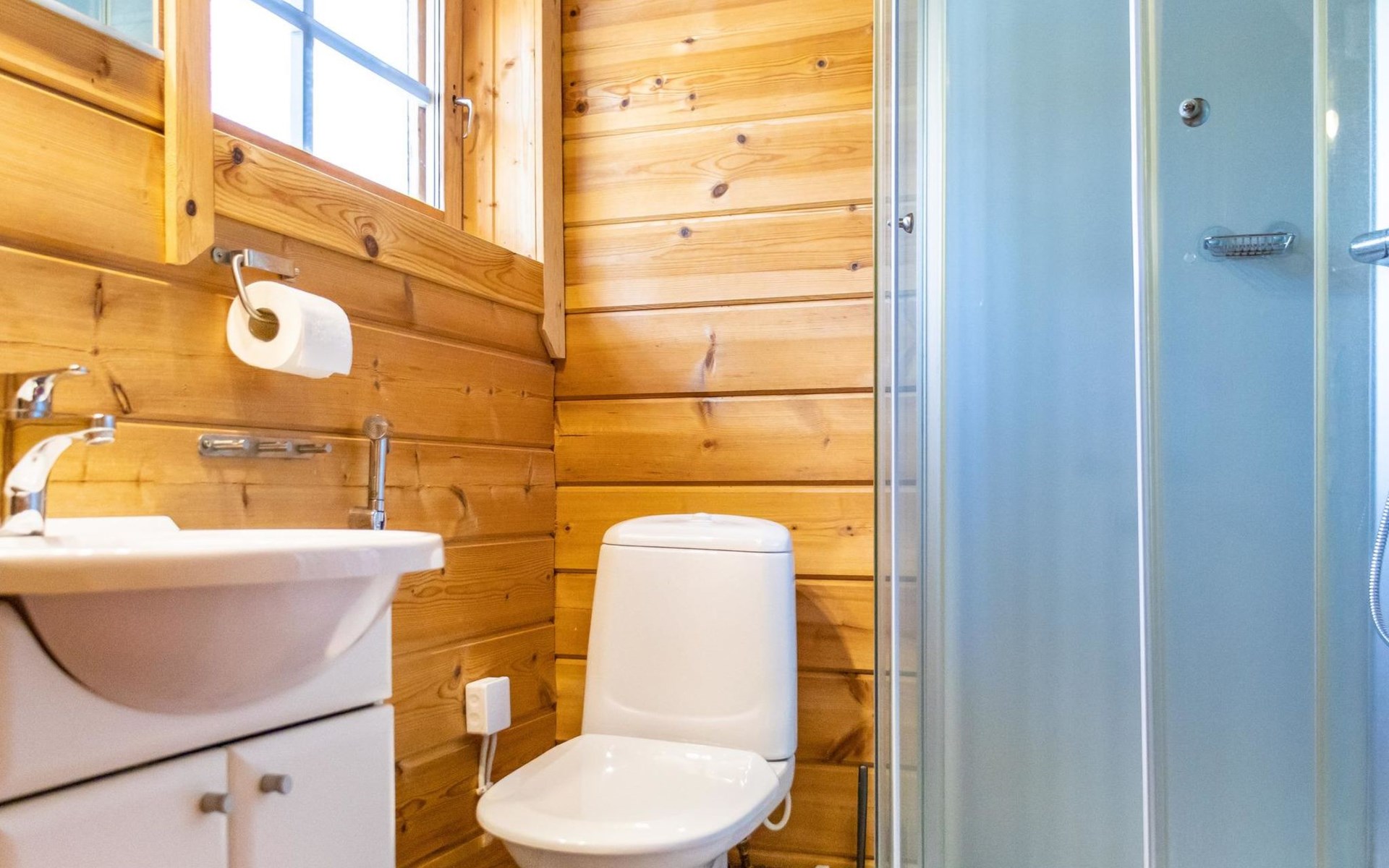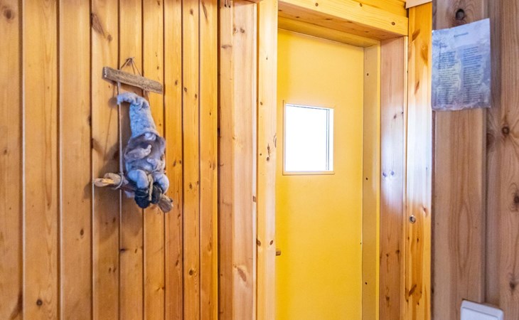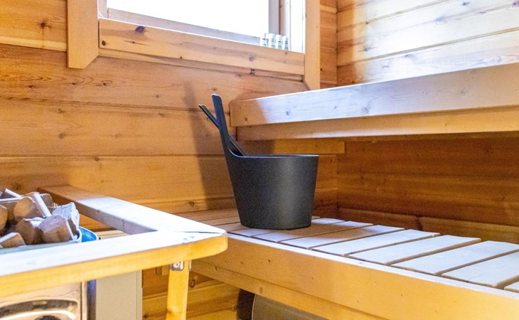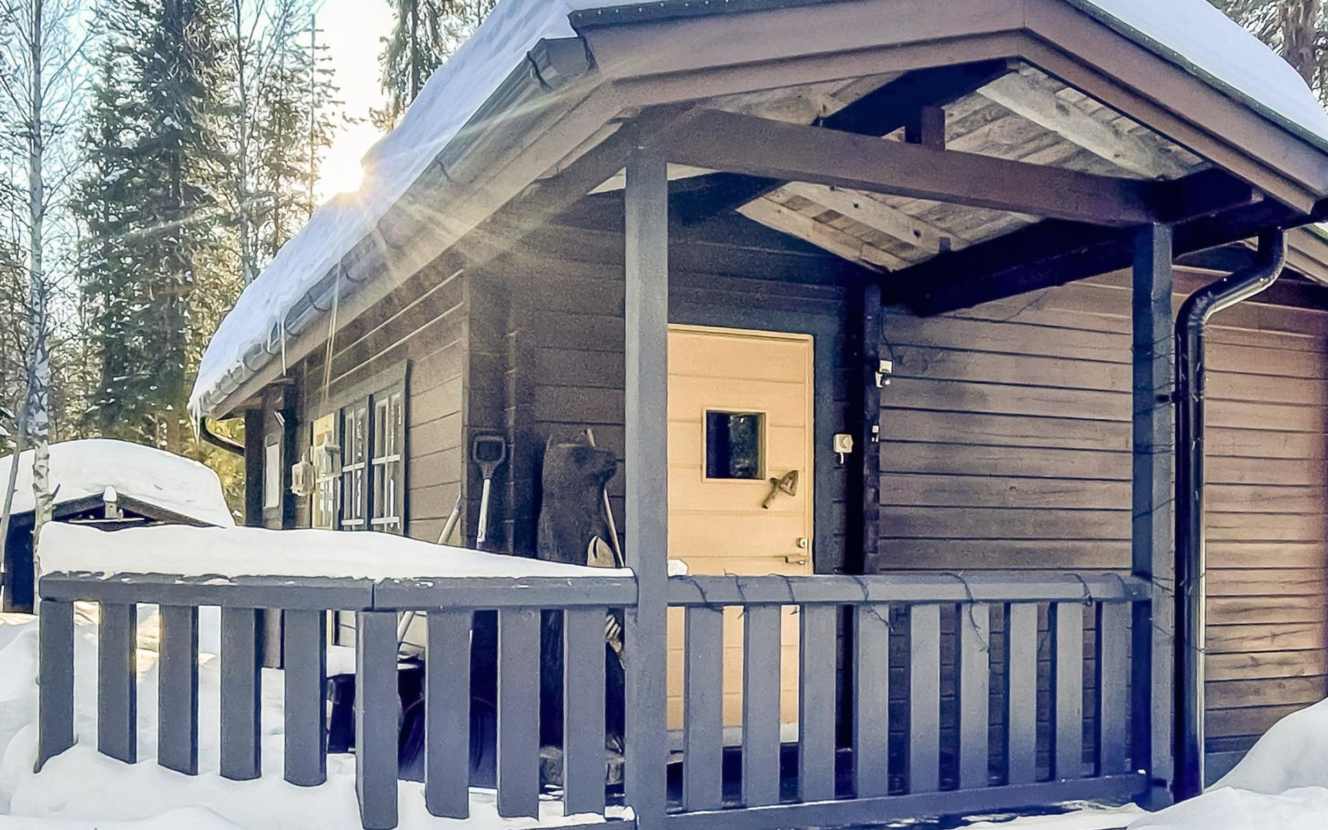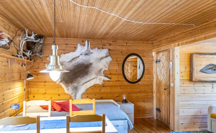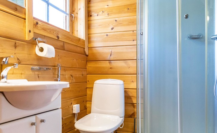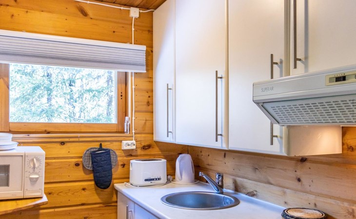 The 45 m2 cabin includes a living room/kitchen, a bathroom, sauna, and a terrace. Outside, there is also a campfire site. The cabin was originally built in 1982 with an extension added in the early 2000s.