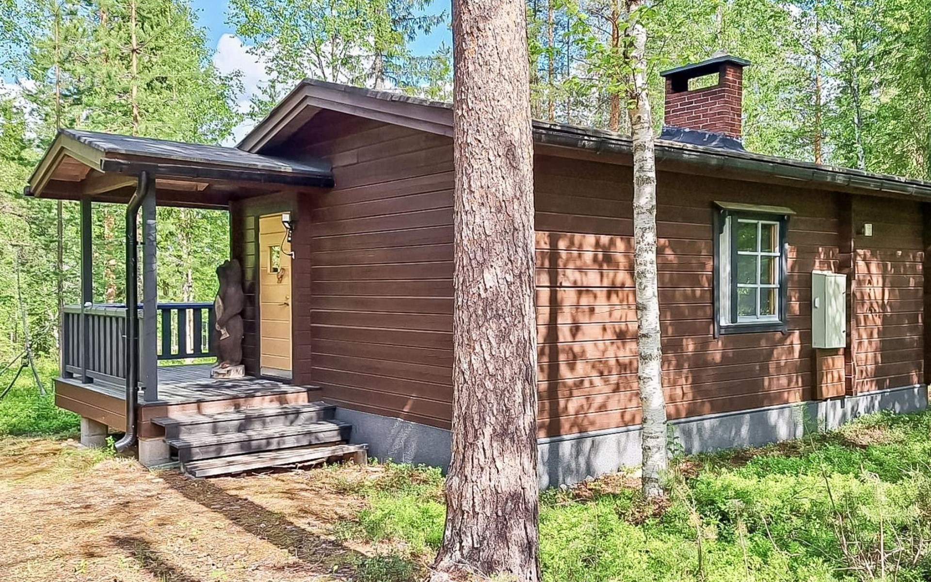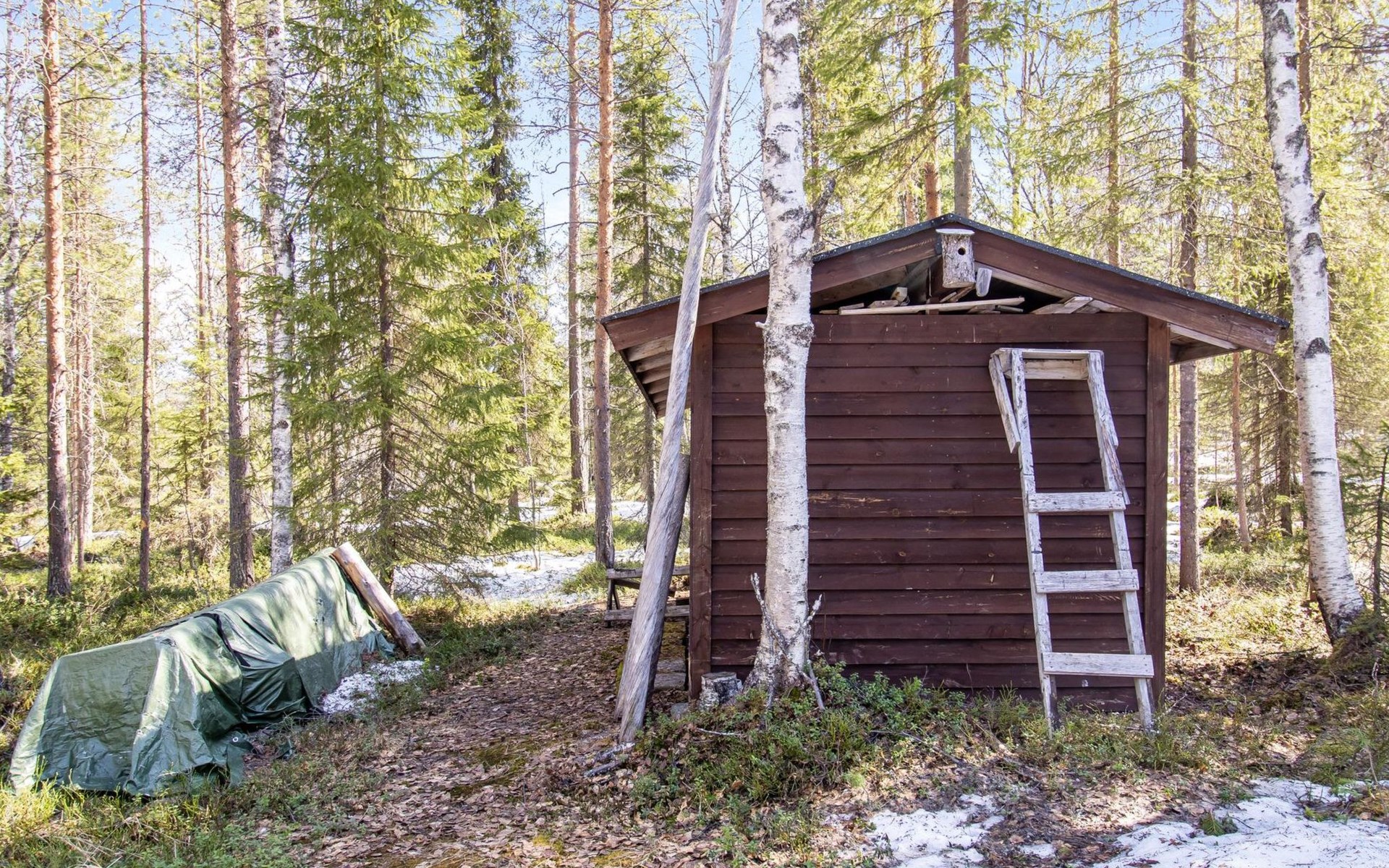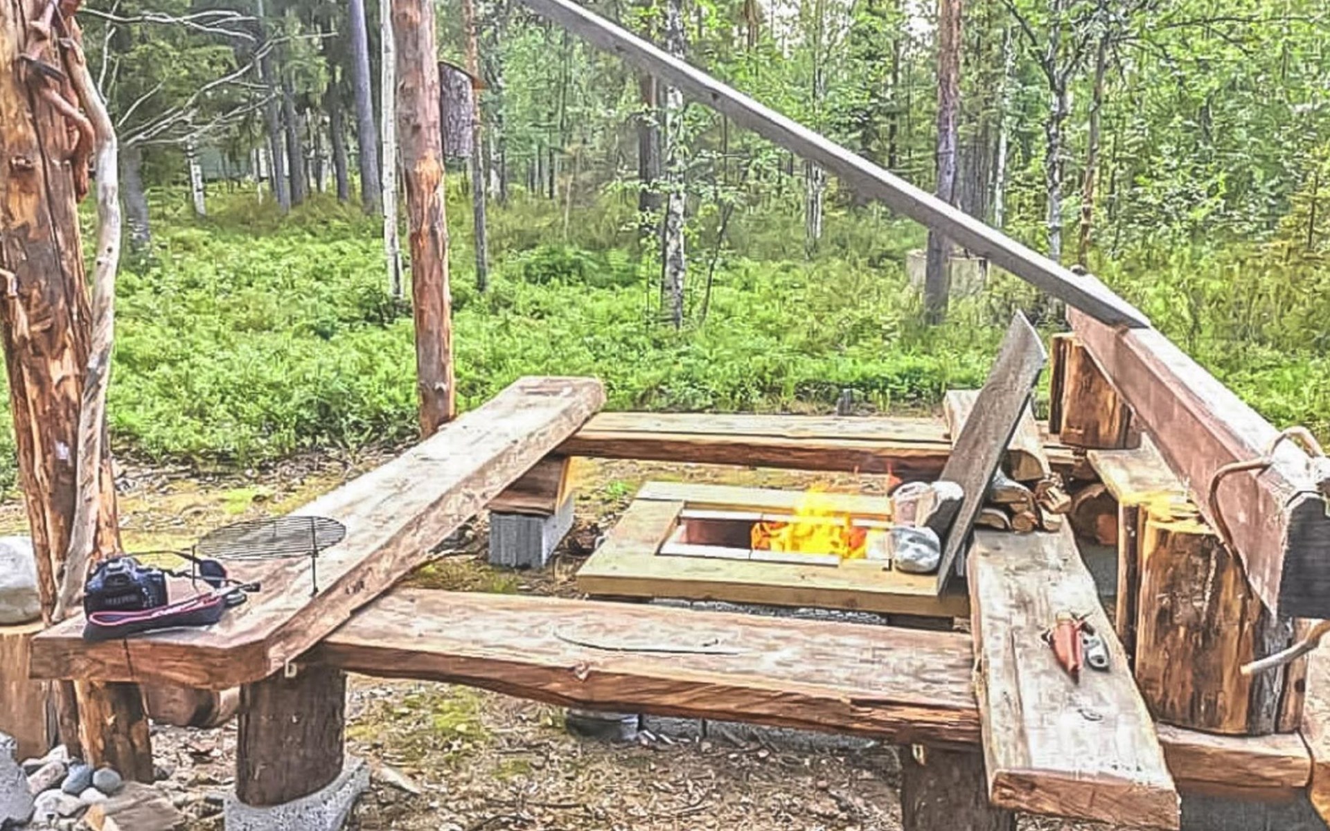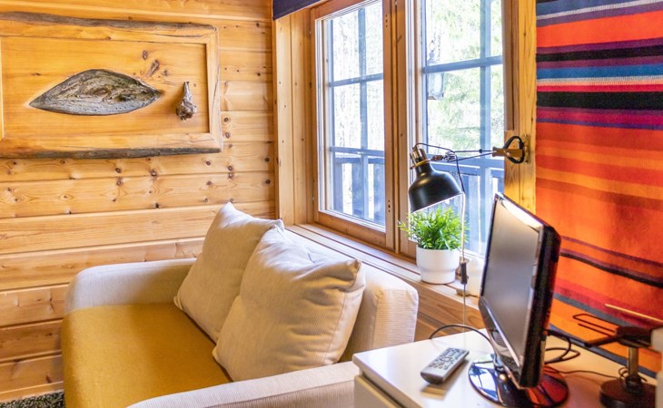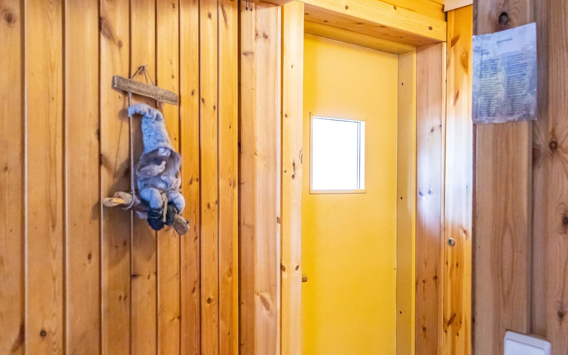 The 45 m2 cabin includes a living room/kitchen, a bathroom, sauna, and a terrace. Outside, there is also a campfire site. The cabin was originally built in 1982 with an extension added in the early 2000s.