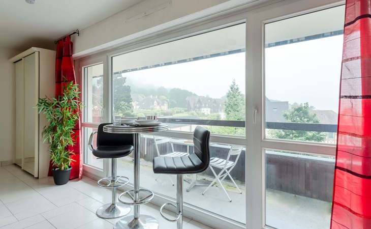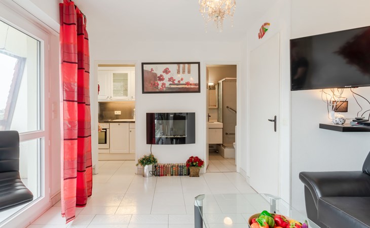 Trouville sur Mer: Residentie "Les Flots Bleus", van 4 verdiepingen. Buiten de plaats, op een heuvel, 900 m van zee, 900 m van het strand. In het complex: lift. (5 treden). Winkel 2 km, levensmiddelenwinkel 2.1 km, supermarkt 2.1 km, bushalte "Trouville Prémanoir" 300 m, station "Deauville-Trouville" 2.4 km, zandstrand "Trouville-sur-mer" 1 km, overdekt zwembad 2 km, thermaalbad "Trouville sur Mer" 2 km. Golfterrein (18 holes) 6.1 km, zeilschool 1.5 km, tennis 1.5 km. Attracties in de buurt: Honfleur 13 km, Mémorial de Caen 64 km, Plage du débarquement d'Arromanches 97 km. Auto noodzakelijk. De sleuteloverdracht vindt plaats bij het agentschap Interhome in Deauville. Vergelijkbare accommodaties kunnen worden geboekt.
