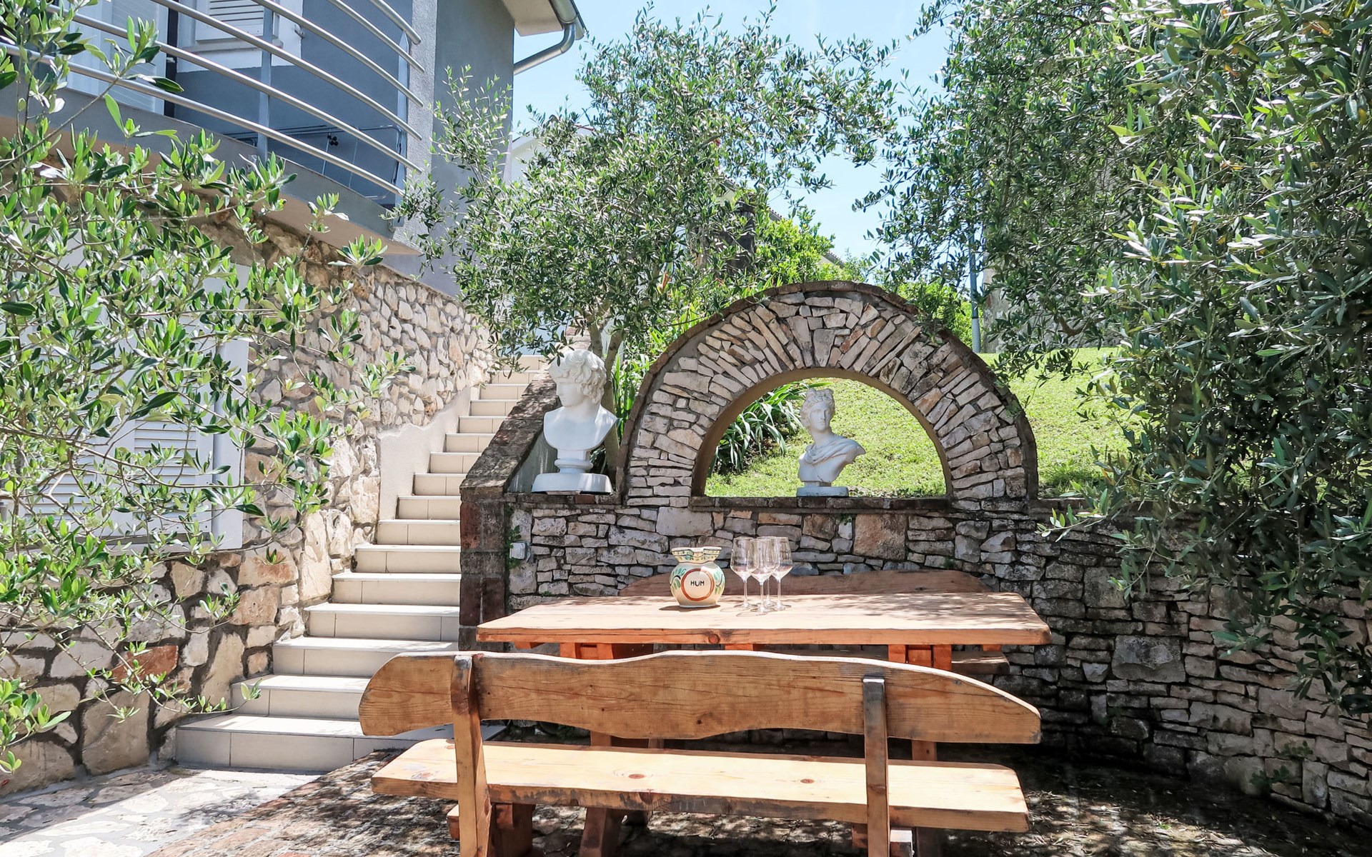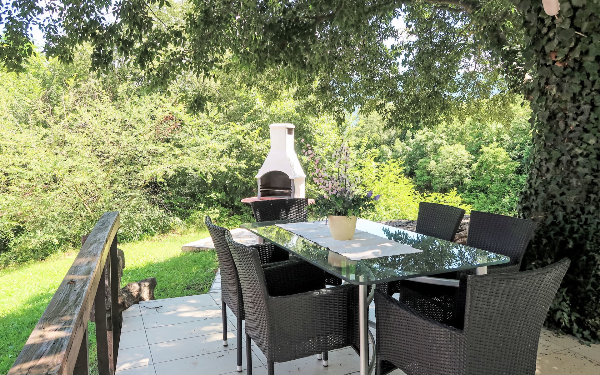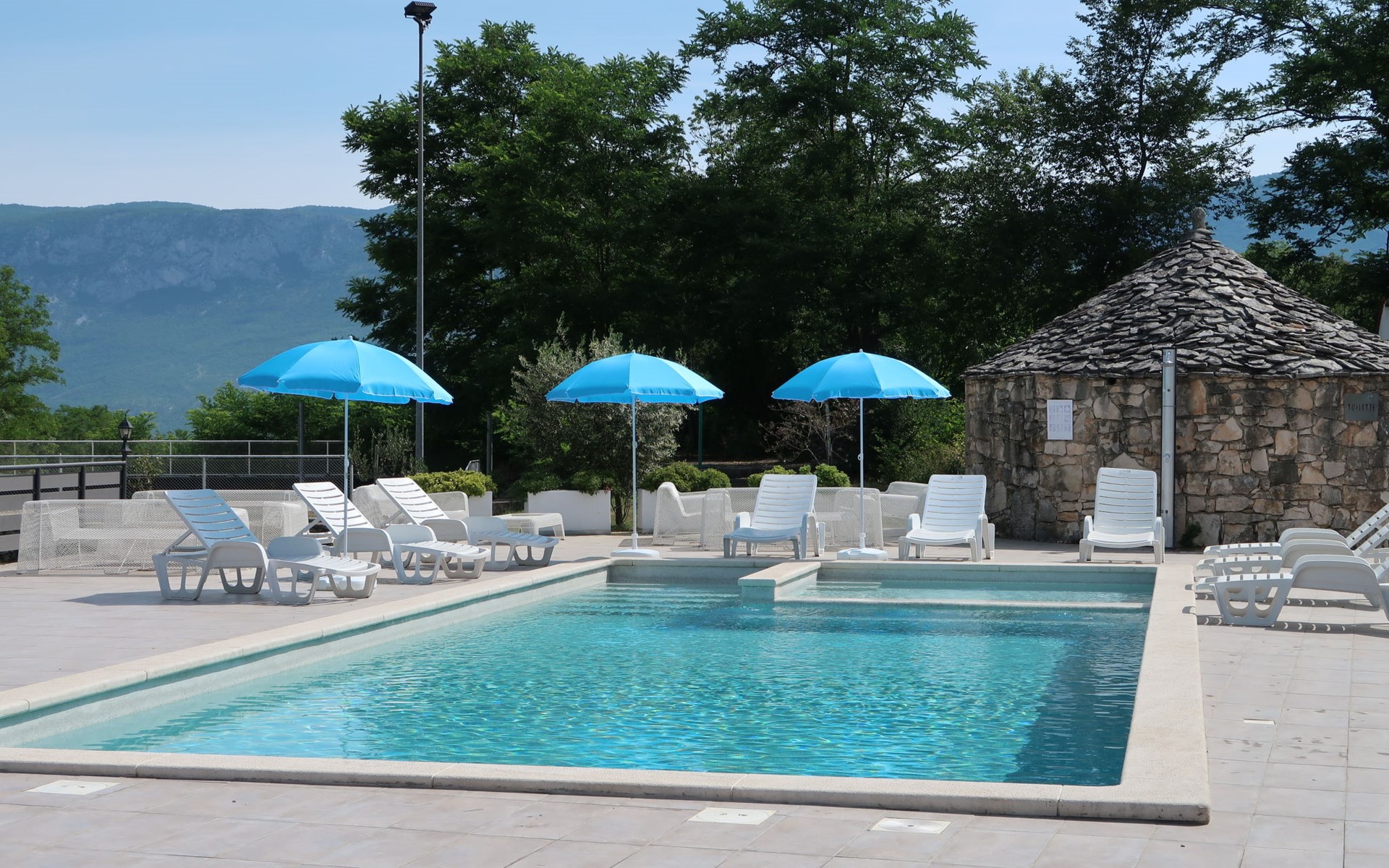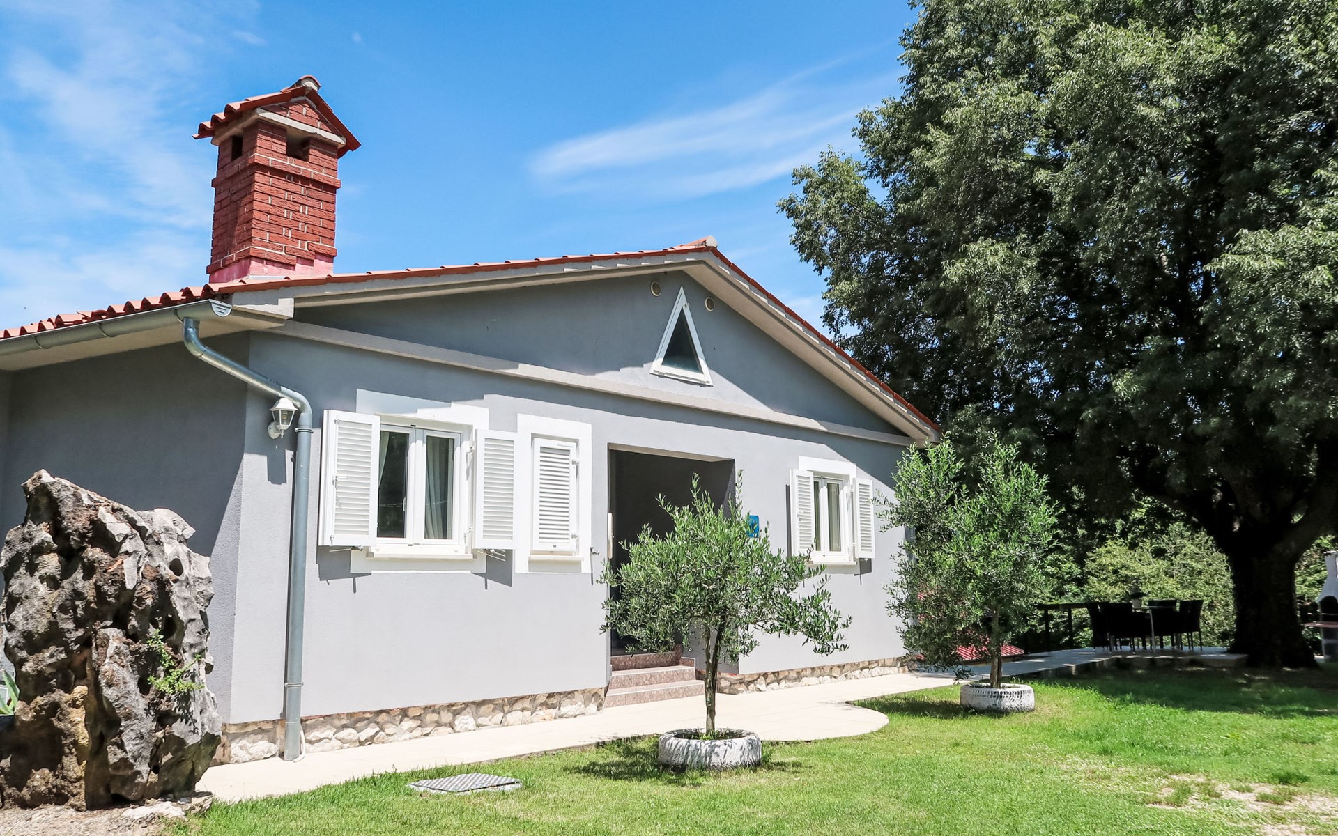 Landhuis, omgeven door bomen en weiden. 8 km van het centrum van Labin, 5 km van zee, aan een doodlopende weg. Voor medegebruik: terrein 6.000 m2 met bomen, weide, openluchtzwembad hoekig (12 x 5 m, 135 cm diepte, seizoensgebonden beschikbaarheid: 15.Mei. - 25.Sep.) met trap. Buitendouche, volleybalveld, prieel, terras, tuinmeubelen, barbecue, kinderspeelplaats (glijbaan, schommel). In het huis: internetaansluiting. Parkeerplaats op het terrein. Winkel 300 m, bushalte 2.9 km, kiezelstrand 5 km, rotsstrand 5 km. De eigenaar woont op hetzelfde terrein.