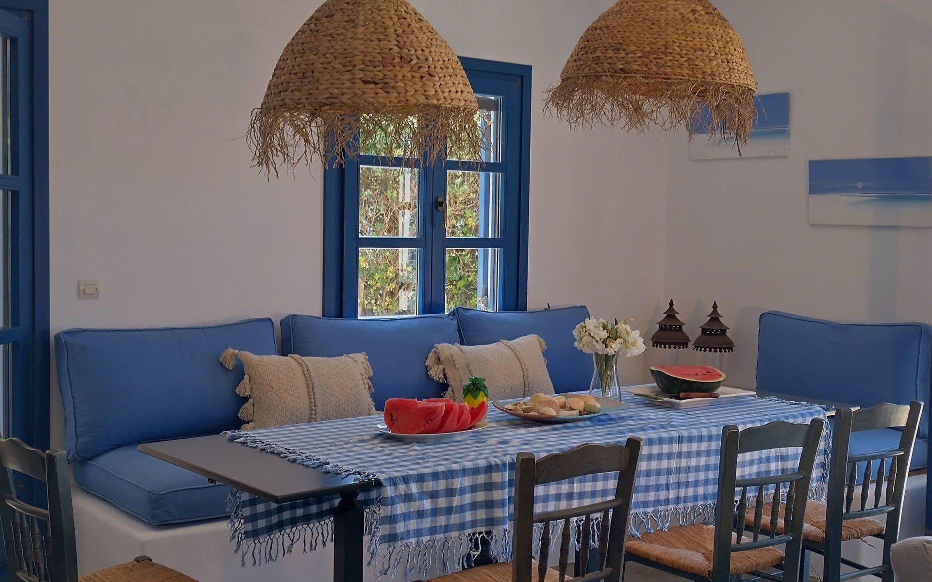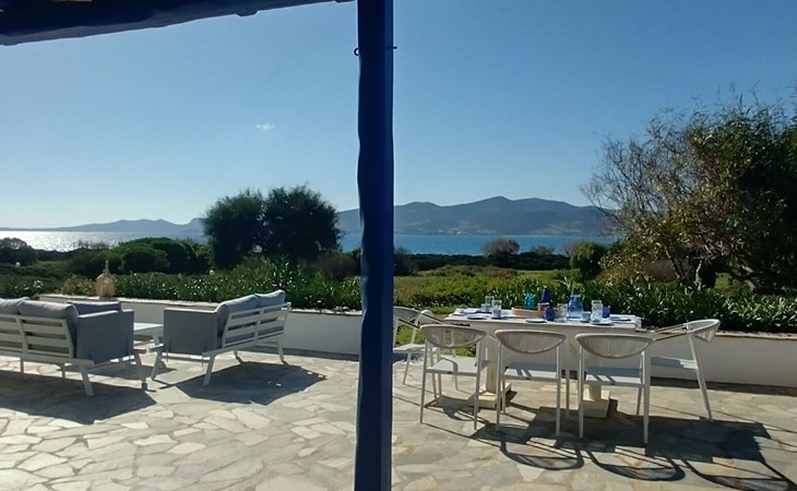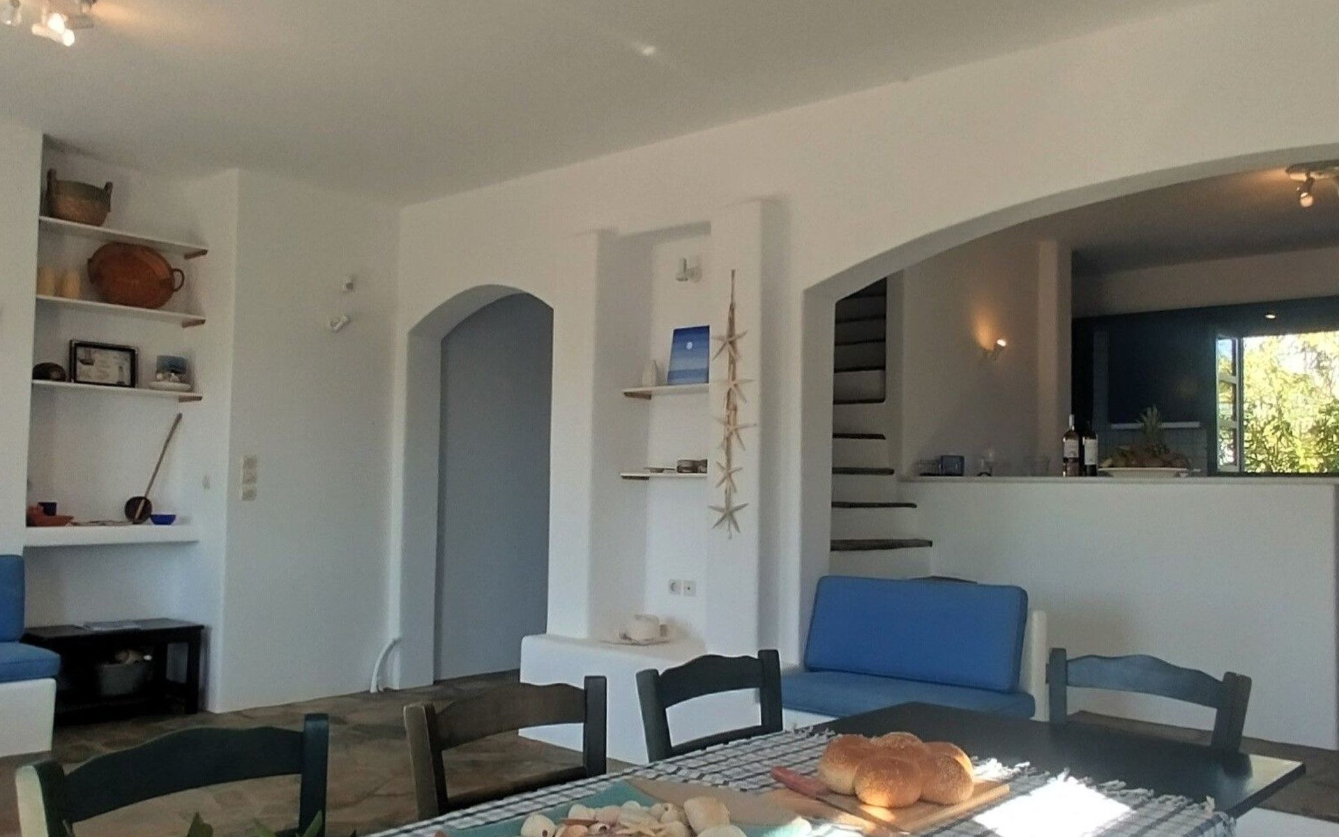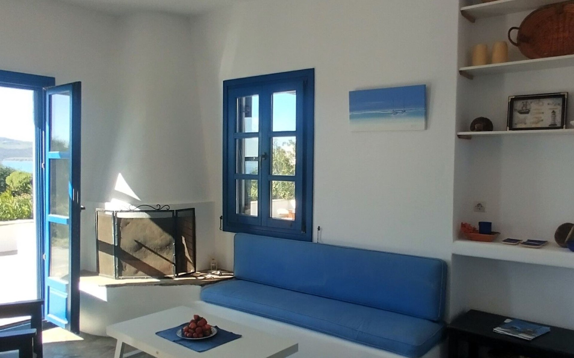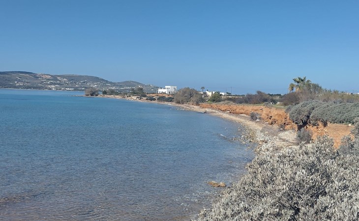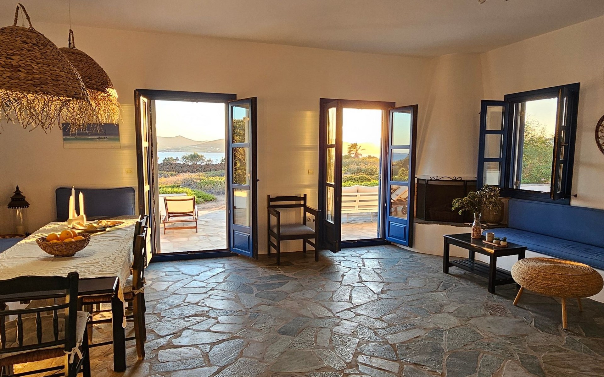 Kampos is een klein dorp op het zuidwesten van Paros, het huis is gelegen aan de kust deel van het dorp, dat is een woonwijk gekenmerkt door grote Cycladische huizen met tuinen en olijfbomen rond. Een klein lokaal strand ligt op slechts 180 m van de villa met enkele tamarisken voor schaduw en kristalhelder water. Het is er nooit te woelig omdat dit het kanaal is tussen Paros en Antiparos waar het water ondiep en kalm is. De kleine kapel van Agios Nikolaos aan de kust ligt op nog eens 7-8 minuten lopen en een kleine baai met vissersboten ligt op 800 m van het huis en kan worden gebruikt om een boot aan te leggen als je er een wilt huren. Het dorp Kambos wordt gekenmerkt door kleine traditionele huizen die met elkaar verbonden zijn door kronkelende straatjes, tuinen en graanvelden rondom. Er is een dorpswinkel, een soort "verkoopt alles" ("pantopolio" in het Grieks) op slechts 1300 m van het huis, dit is het centrum van het dorp. Alyki is een populair dorp met uitstekende tavernes, geweldige stranden, supermarkten, een uitstekende bakker en enkele andere winkels op slechts 5 minuten rijden of een korte fietstocht. Parikia, de hoofdstad van Paros met zijn oude agora, het archeologisch museum en nog veel meer, bereik je in ongeveer 15 minuten met de auto of je kunt de bus nemen, die er ongeveer een half uur over doet. Naoussa, de feesthoofdstad van het eiland, en zijn chique boetiekjes zijn ook gemakkelijk te bereiken, de rit duurt slechts een half uur.