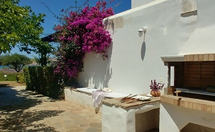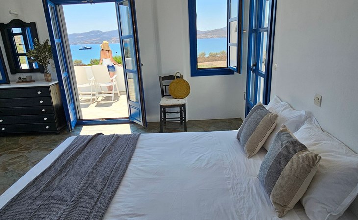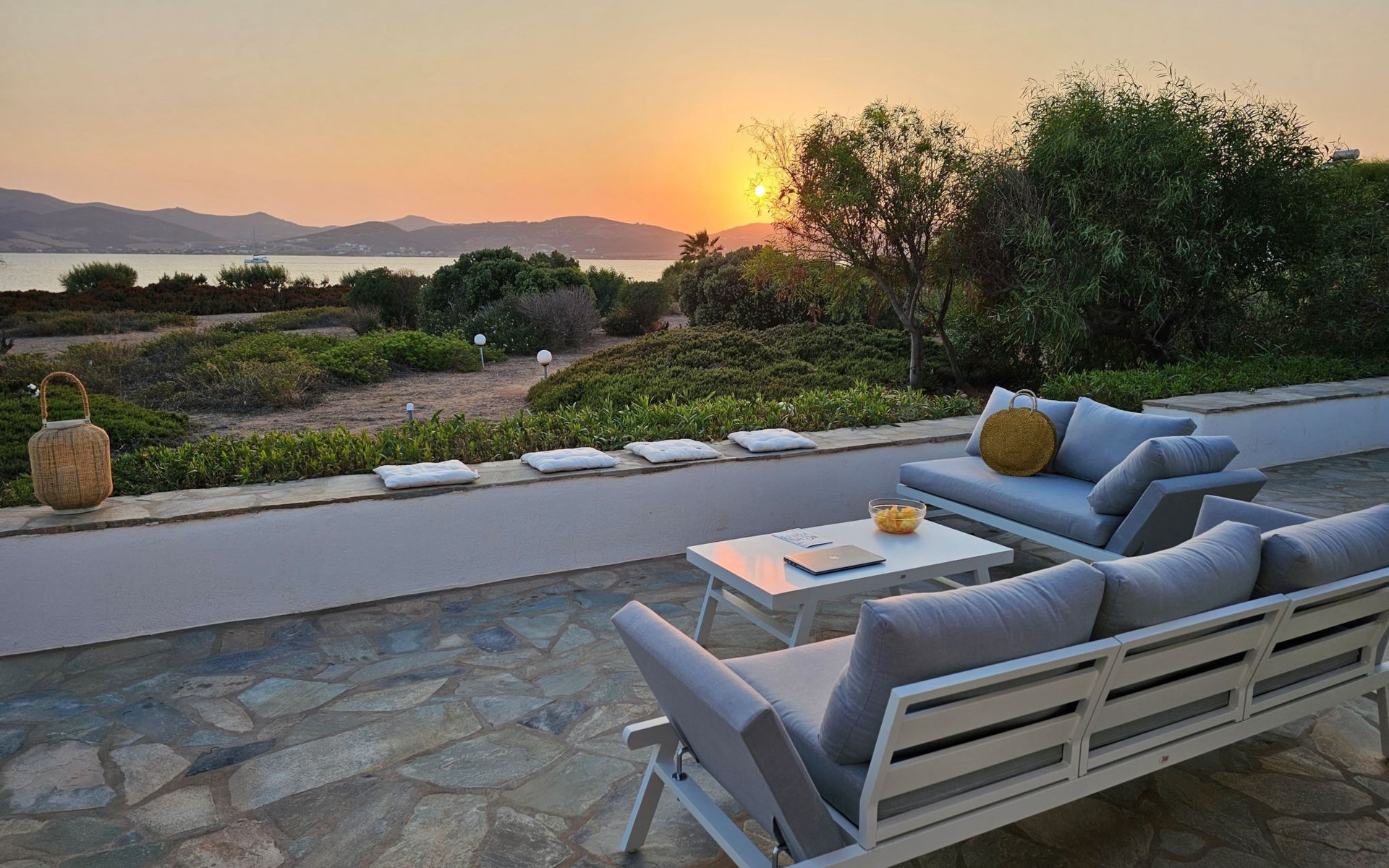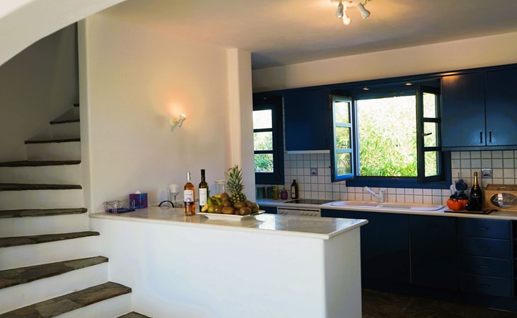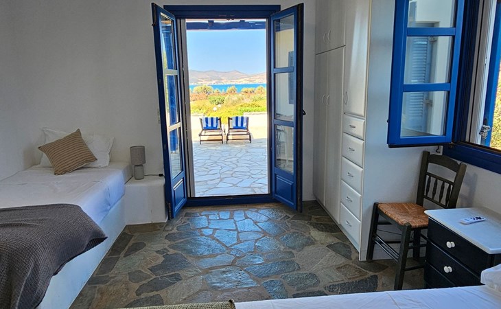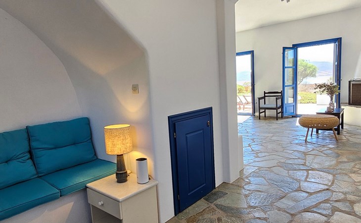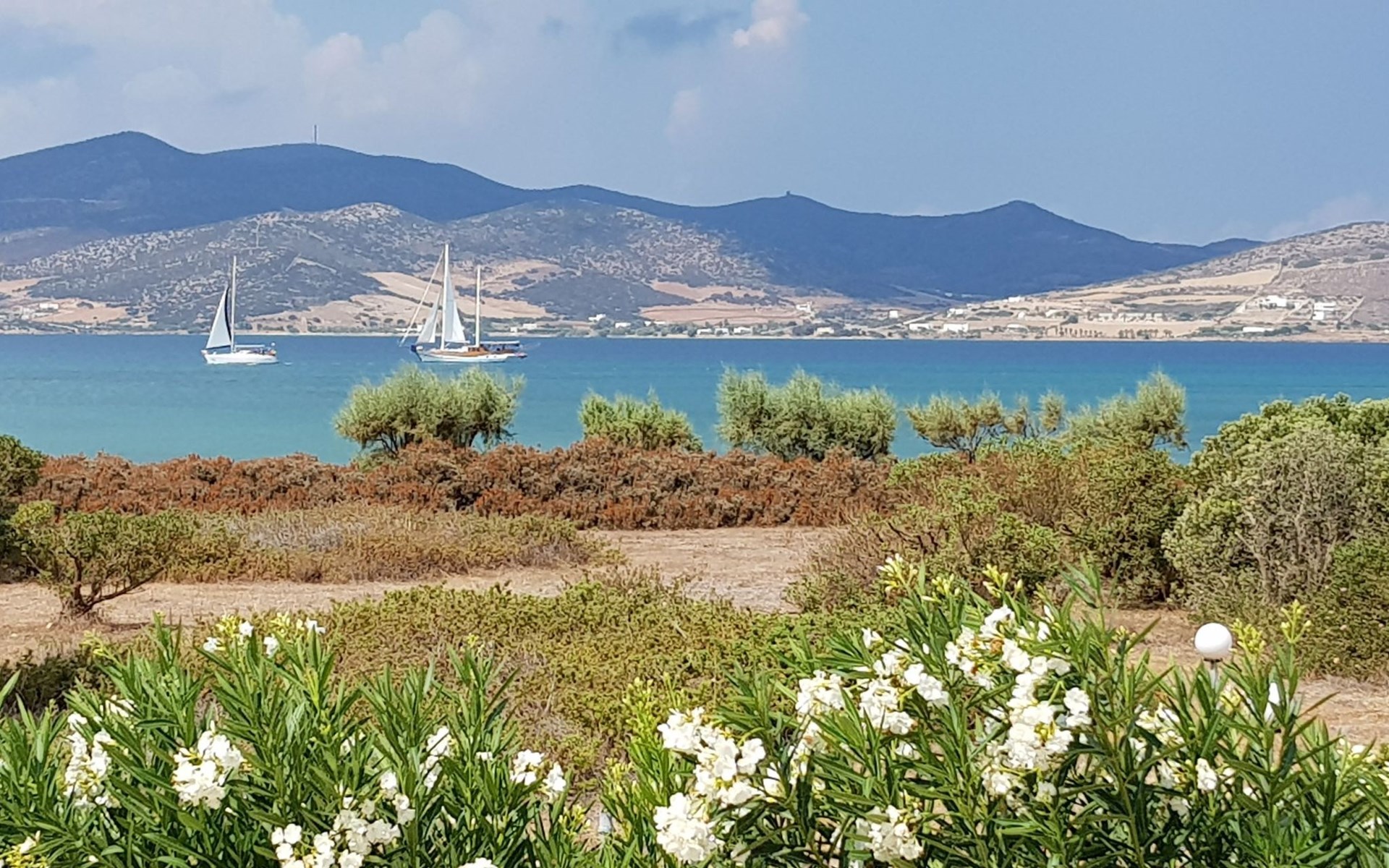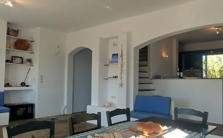 Kampos is een klein dorp op het zuidwesten van Paros, het huis is gelegen aan de kust deel van het dorp, dat is een woonwijk gekenmerkt door grote Cycladische huizen met tuinen en olijfbomen rond. Een klein lokaal strand ligt op slechts 180 m van de villa met enkele tamarisken voor schaduw en kristalhelder water. Het is er nooit te woelig omdat dit het kanaal is tussen Paros en Antiparos waar het water ondiep en kalm is. De kleine kapel van Agios Nikolaos aan de kust ligt op nog eens 7-8 minuten lopen en een kleine baai met vissersboten ligt op 800 m van het huis en kan worden gebruikt om een boot aan te leggen als je er een wilt huren. Het dorp Kambos wordt gekenmerkt door kleine traditionele huizen die met elkaar verbonden zijn door kronkelende straatjes, tuinen en graanvelden rondom. Er is een dorpswinkel, een soort "verkoopt alles" ("pantopolio" in het Grieks) op slechts 1300 m van het huis, dit is het centrum van het dorp. Alyki is een populair dorp met uitstekende tavernes, geweldige stranden, supermarkten, een uitstekende bakker en enkele andere winkels op slechts 5 minuten rijden of een korte fietstocht. Parikia, de hoofdstad van Paros met zijn oude agora, het archeologisch museum en nog veel meer, bereik je in ongeveer 15 minuten met de auto of je kunt de bus nemen, die er ongeveer een half uur over doet. Naoussa, de feesthoofdstad van het eiland, en zijn chique boetiekjes zijn ook gemakkelijk te bereiken, de rit duurt slechts een half uur.