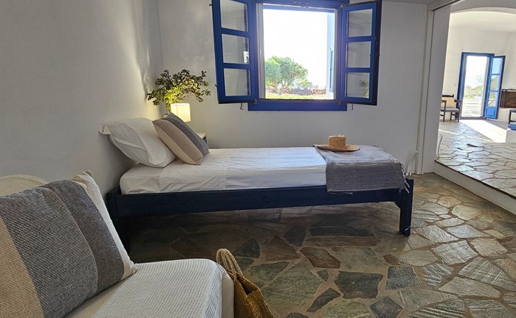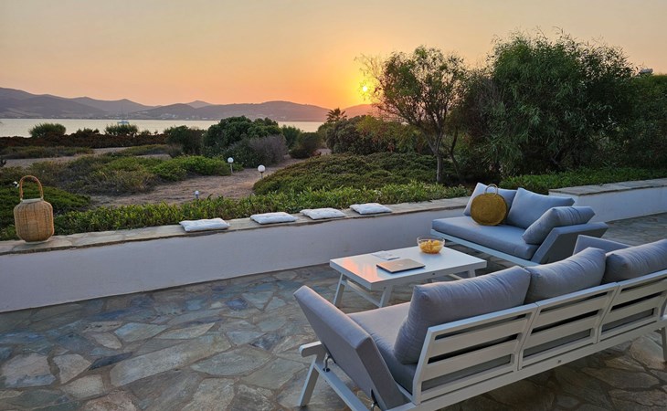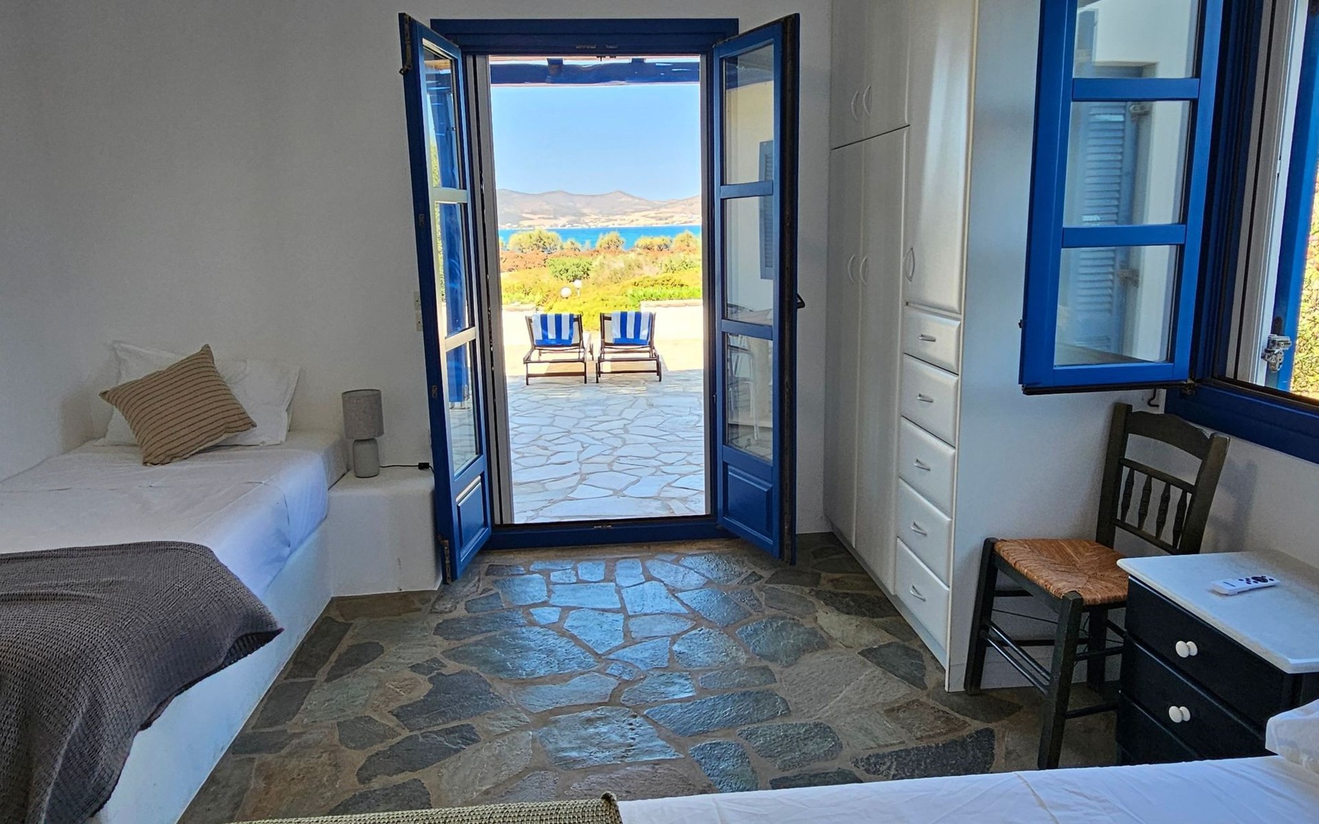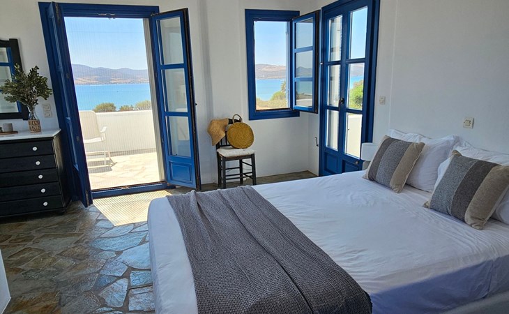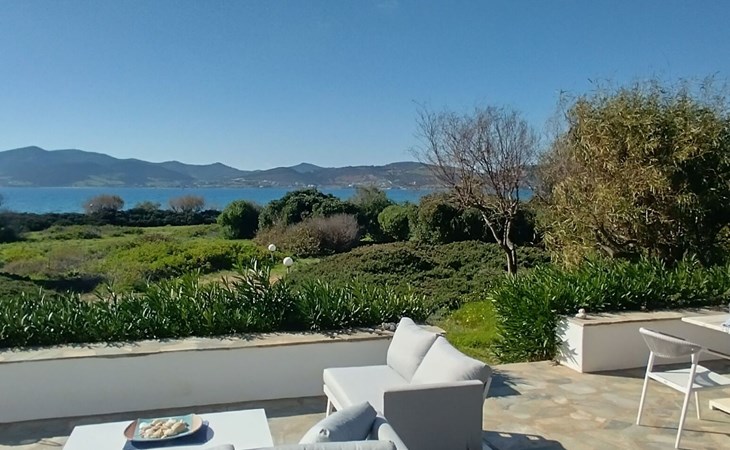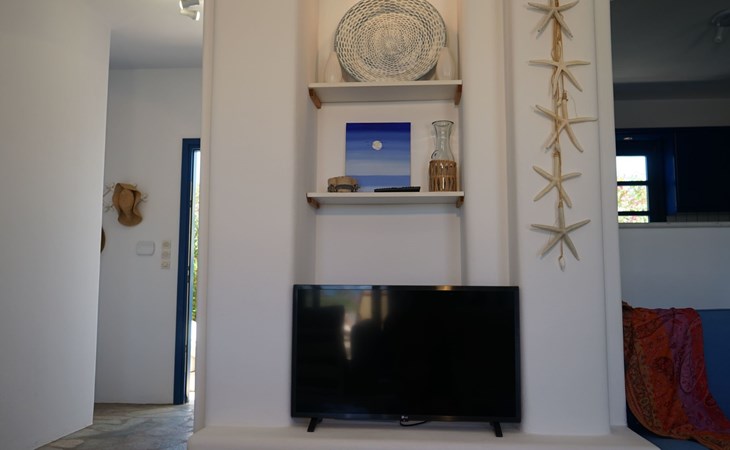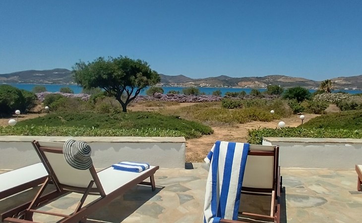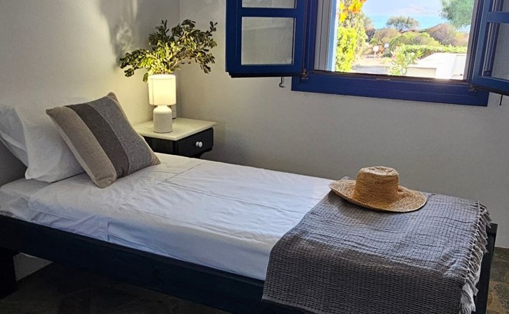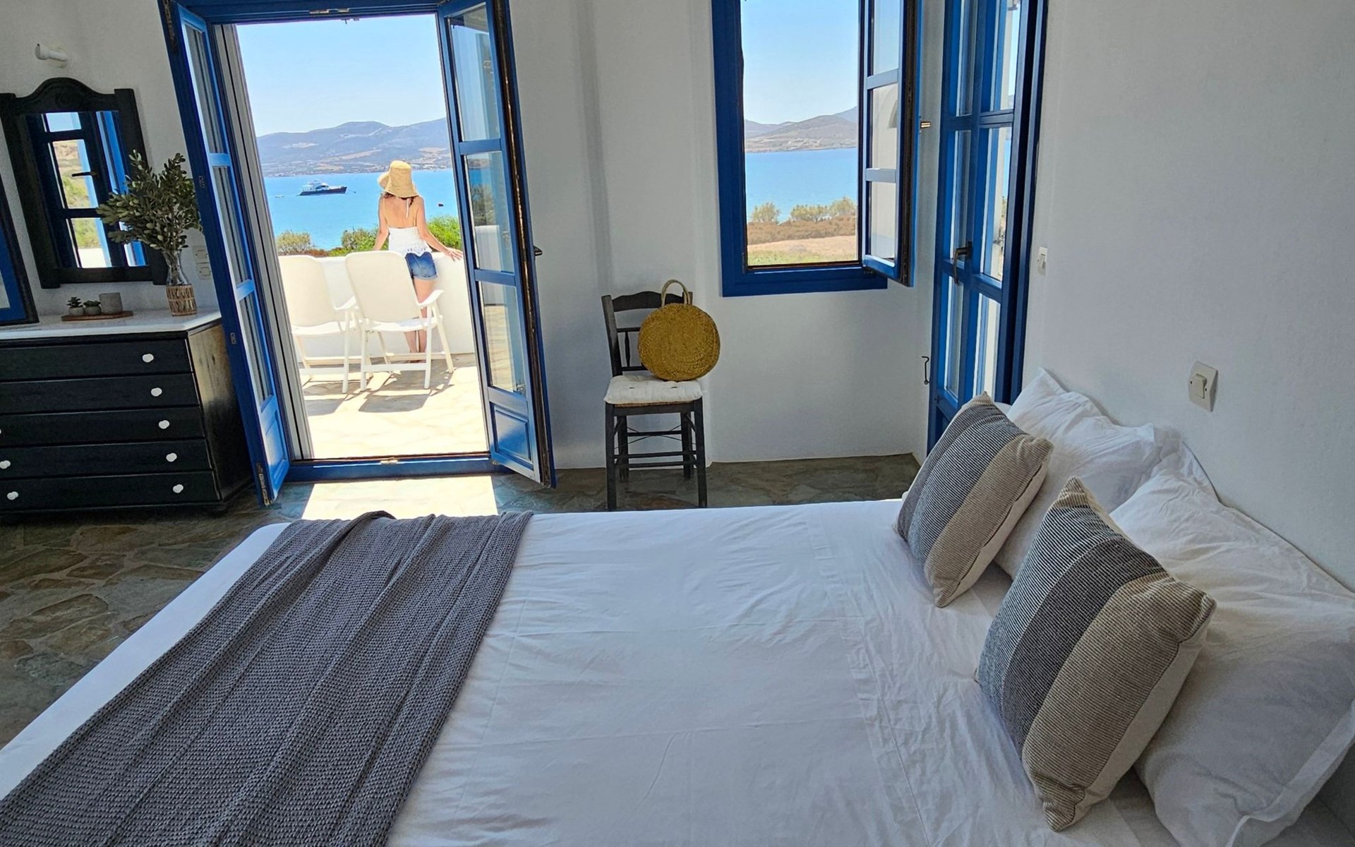 Kampos is een klein dorp op het zuidwesten van Paros, het huis is gelegen aan de kust deel van het dorp, dat is een woonwijk gekenmerkt door grote Cycladische huizen met tuinen en olijfbomen rond. Een klein lokaal strand ligt op slechts 180 m van de villa met enkele tamarisken voor schaduw en kristalhelder water. Het is er nooit te woelig omdat dit het kanaal is tussen Paros en Antiparos waar het water ondiep en kalm is. De kleine kapel van Agios Nikolaos aan de kust ligt op nog eens 7-8 minuten lopen en een kleine baai met vissersboten ligt op 800 m van het huis en kan worden gebruikt om een boot aan te leggen als je er een wilt huren. Het dorp Kambos wordt gekenmerkt door kleine traditionele huizen die met elkaar verbonden zijn door kronkelende straatjes, tuinen en graanvelden rondom. Er is een dorpswinkel, een soort "verkoopt alles" ("pantopolio" in het Grieks) op slechts 1300 m van het huis, dit is het centrum van het dorp. Alyki is een populair dorp met uitstekende tavernes, geweldige stranden, supermarkten, een uitstekende bakker en enkele andere winkels op slechts 5 minuten rijden of een korte fietstocht. Parikia, de hoofdstad van Paros met zijn oude agora, het archeologisch museum en nog veel meer, bereik je in ongeveer 15 minuten met de auto of je kunt de bus nemen, die er ongeveer een half uur over doet. Naoussa, de feesthoofdstad van het eiland, en zijn chique boetiekjes zijn ook gemakkelijk te bereiken, de rit duurt slechts een half uur.