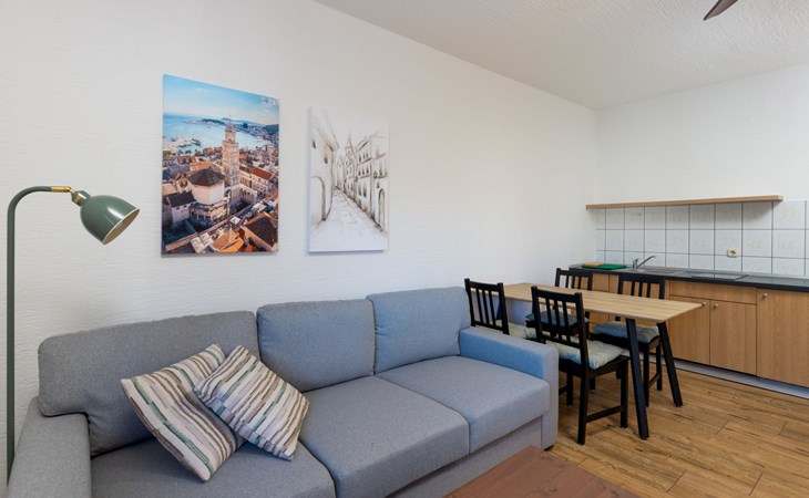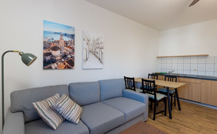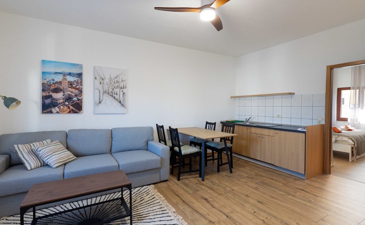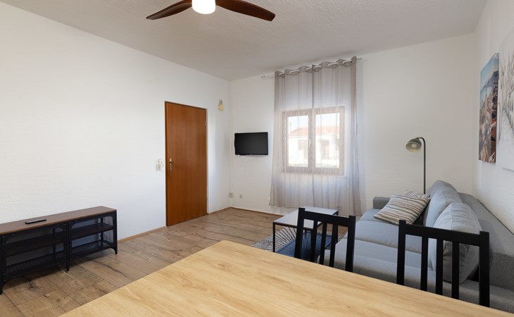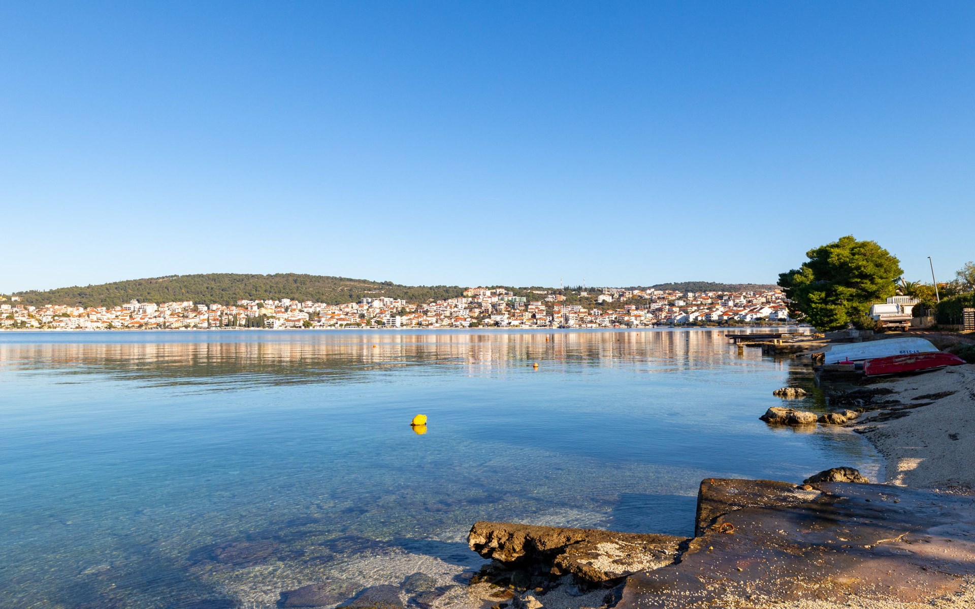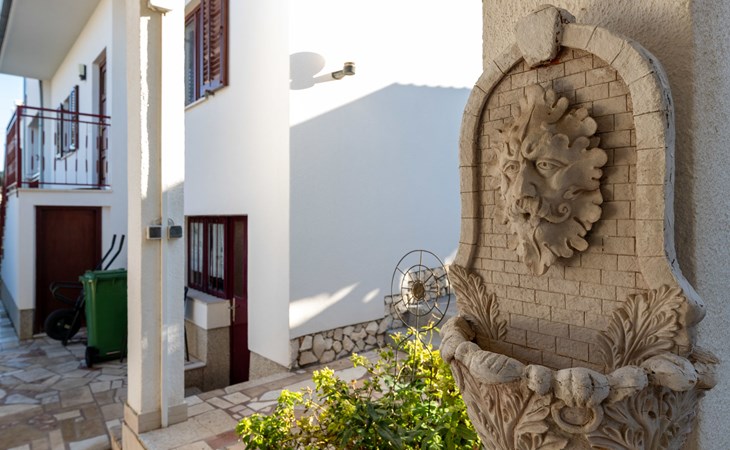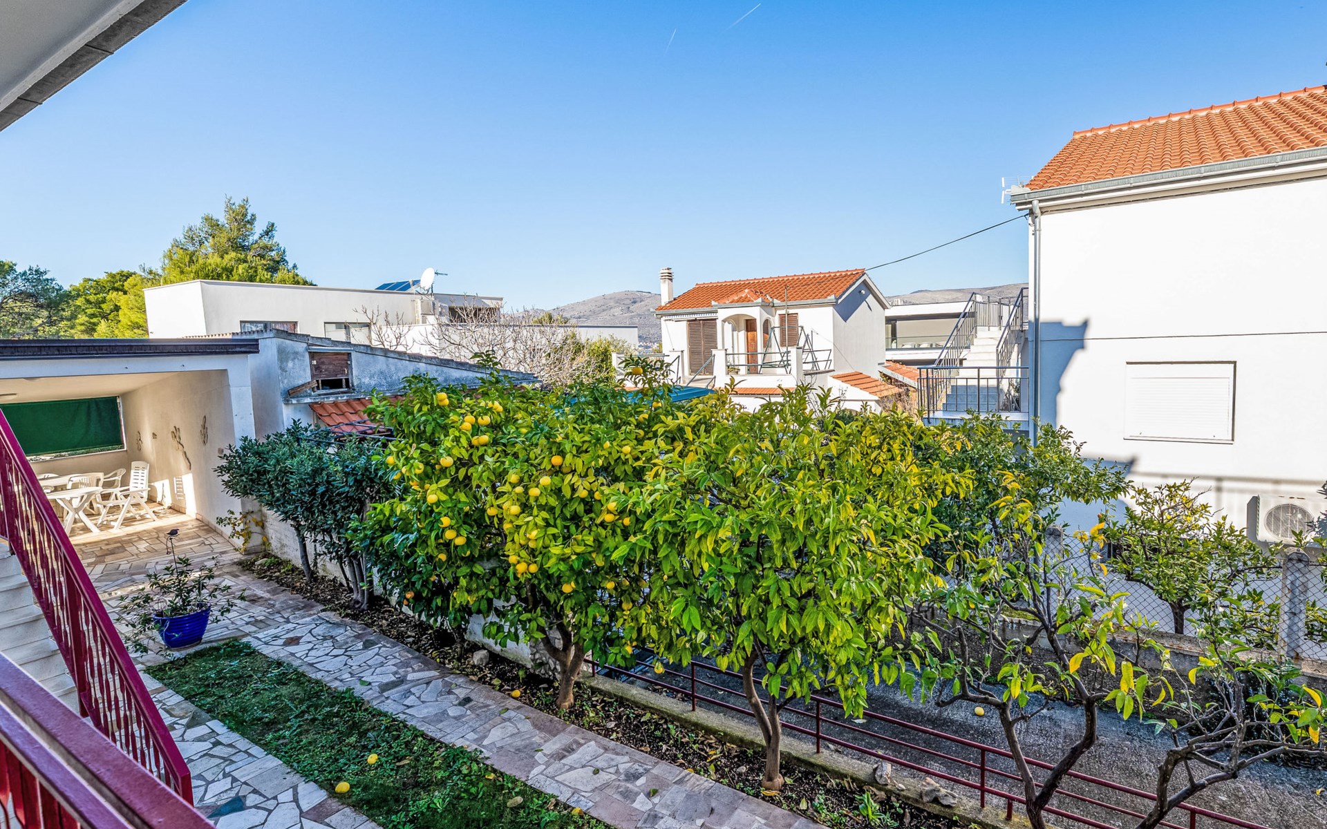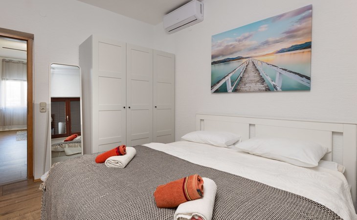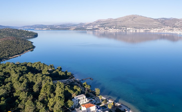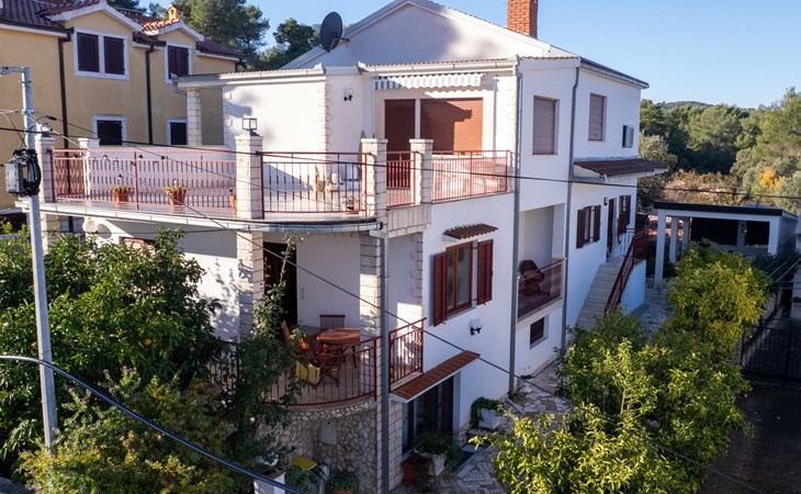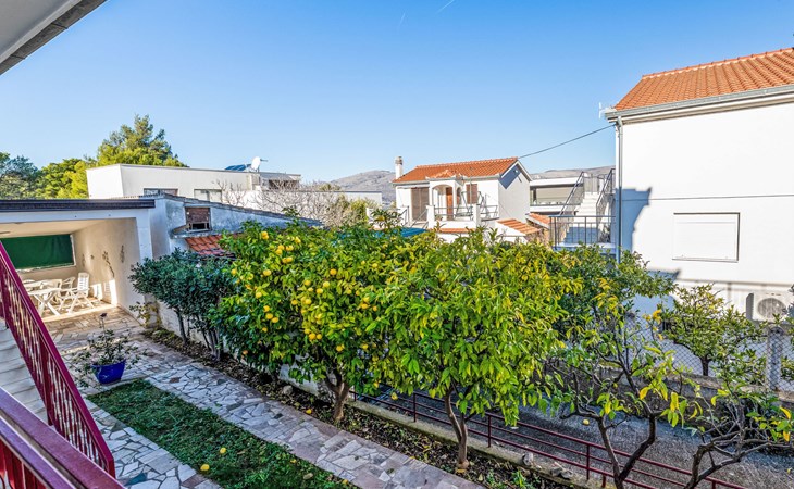 Okrug Gornji (Čiovo) 6 km van Trogir: Appartementencomplex van 3 verdiepingen. 1.5 km van het centrum van Okrug Gornji, rustige, zonnige ligging, 80 m van zee, 80 m van het strand. Voor medegebruik: terrein 450 m2. Terras (20 m2), barbecue. In het huis: internetaansluiting. Parkeerplaats (voor 5 auto's) bij het huis op het terrein. Winkel 1.5 km, restaurant 1.5 km, bushalte 1 km.