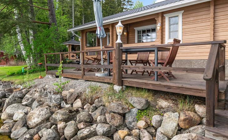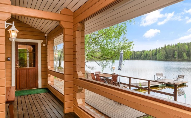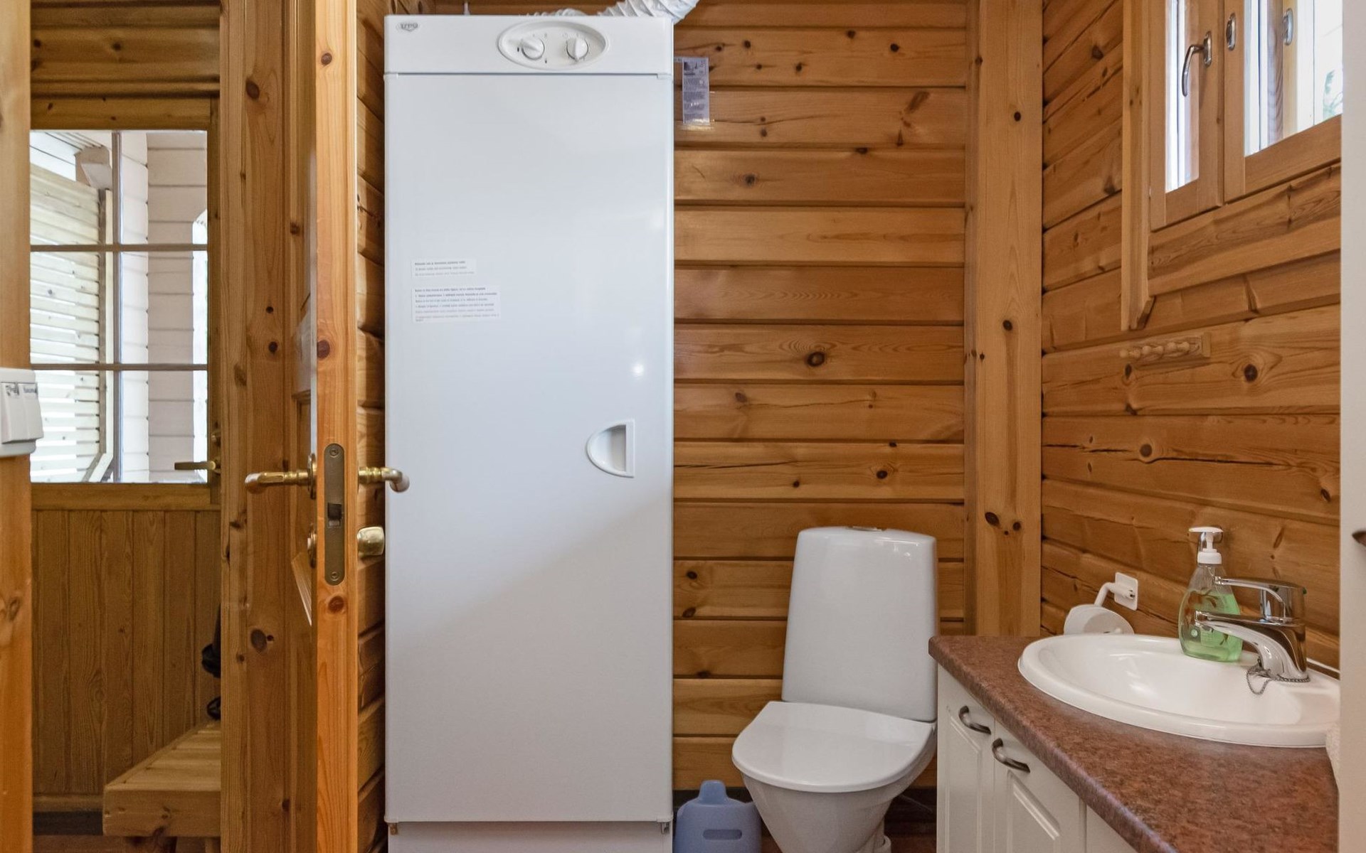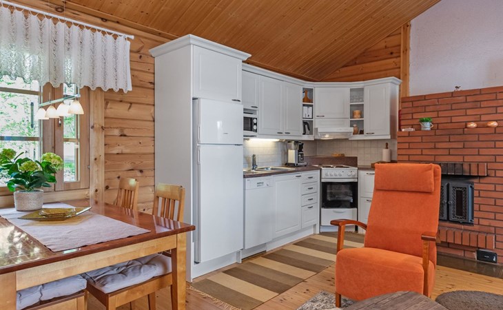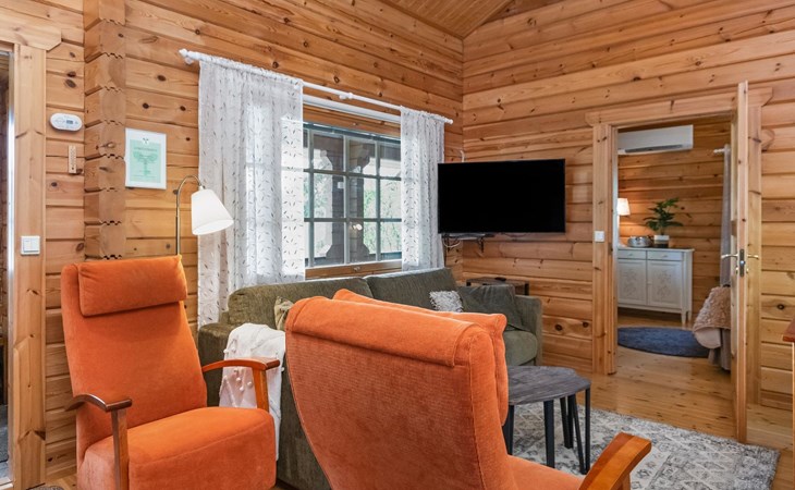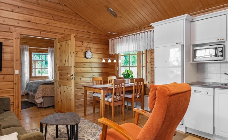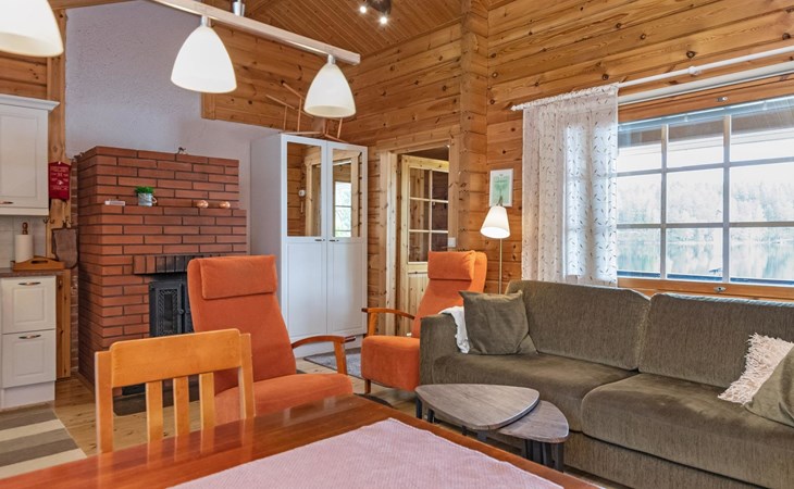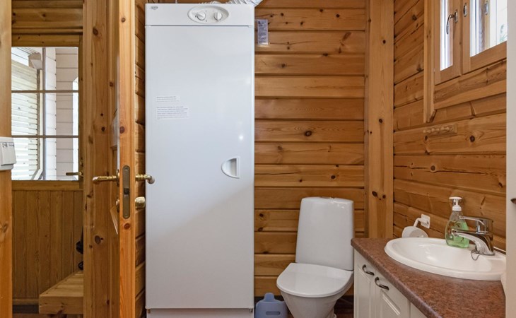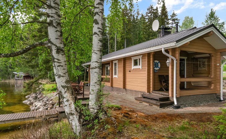 This log cabin, originally built in 1974 and fully renovated/rebuilt in 2007, features a living room/kitchen with a sofa bed for two, a bedroom with two single beds, and a WC with access to the bathroom with a shower. The sauna has a wood-burning stove. Enjoy the covered porch and the open terrace just a few steps from the water.
