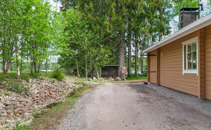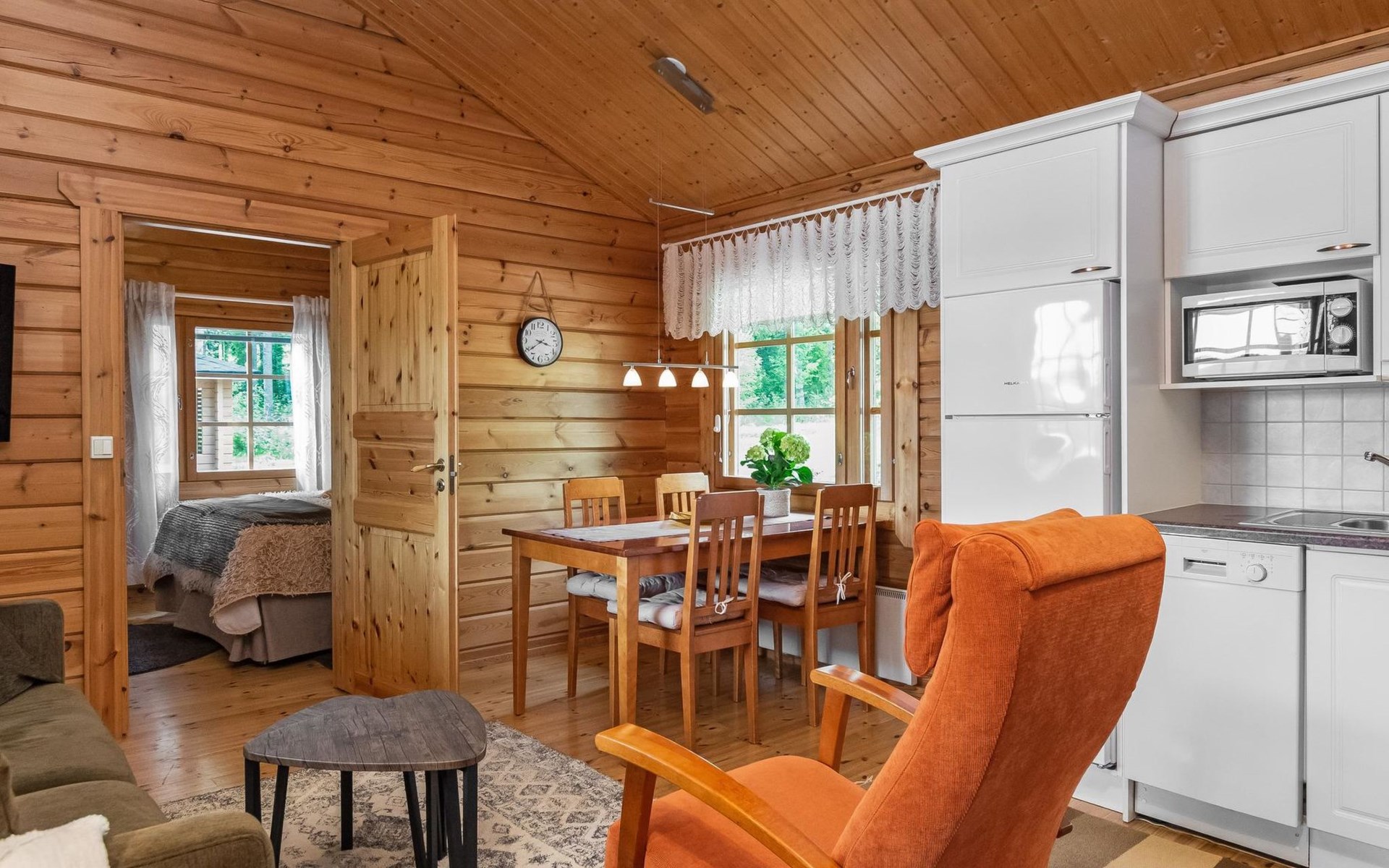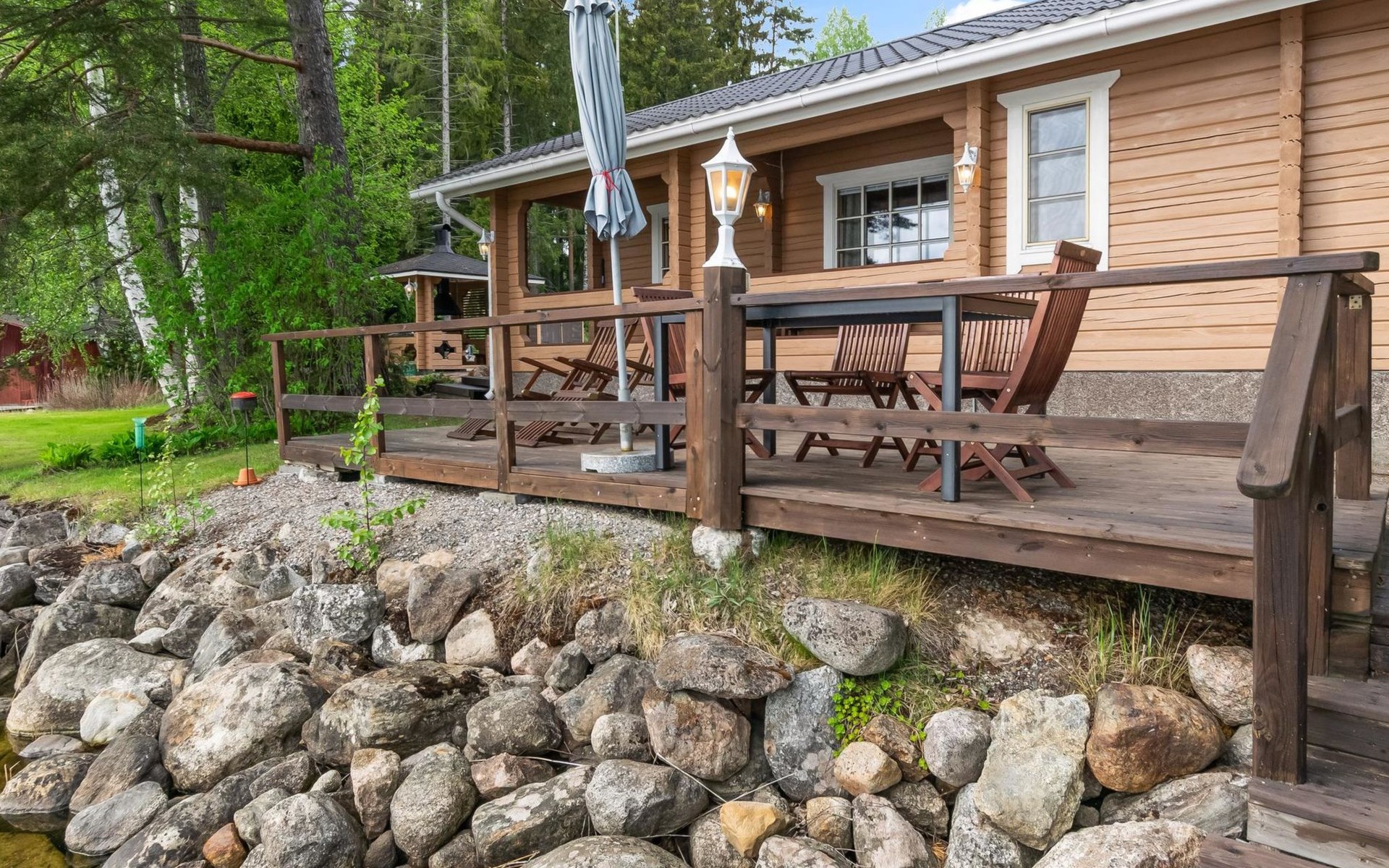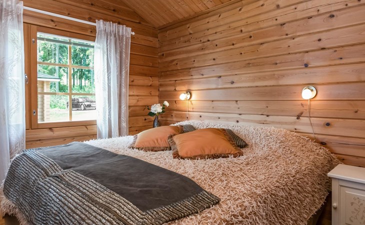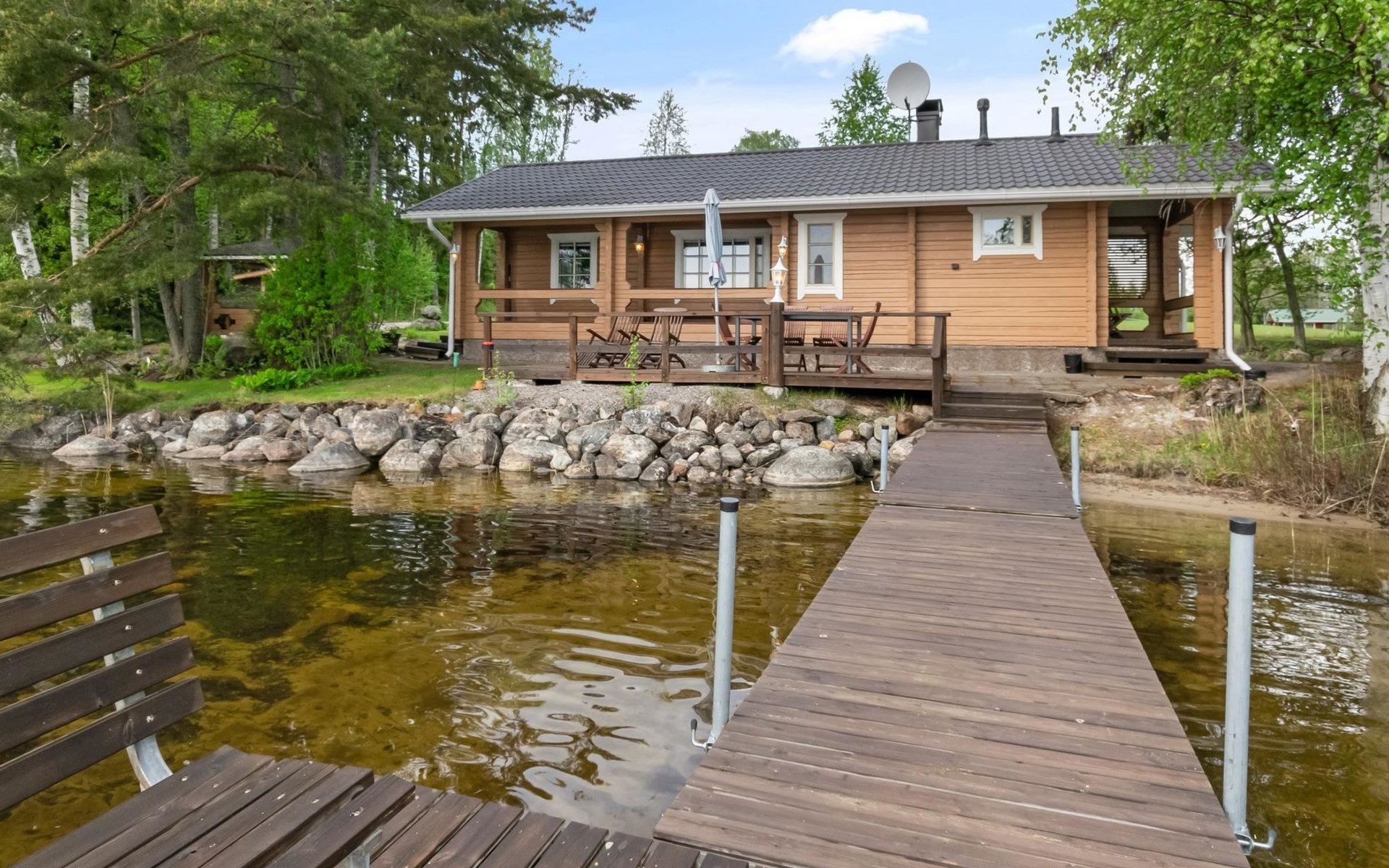This log cabin, originally built in 1974 and fully renovated/rebuilt in 2007, features a living room/kitchen with a sofa bed for two, a bedroom with two single beds, and a WC with access to the bathroom with a shower. The sauna has a wood-burning stove. Enjoy the covered porch and the open terrace just a few steps from the water.