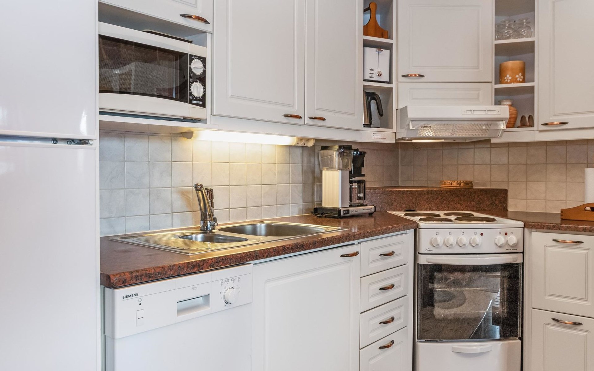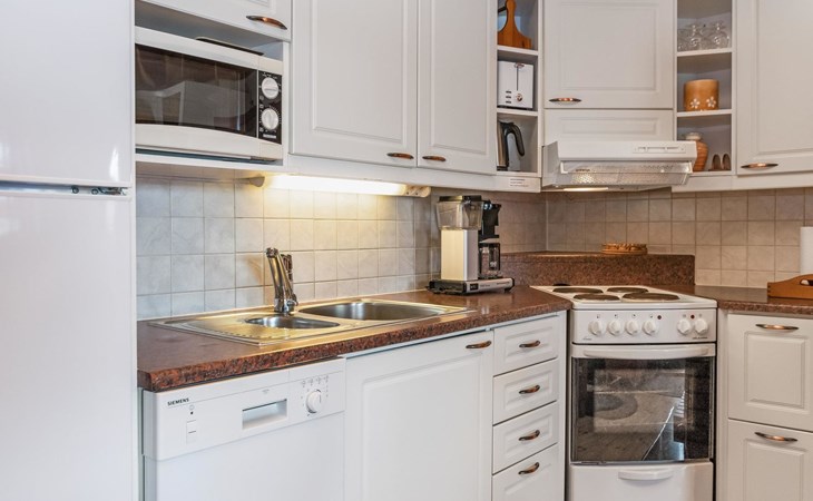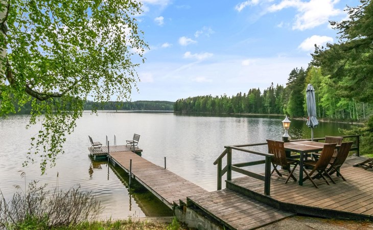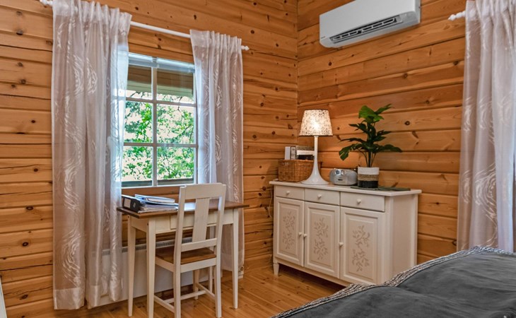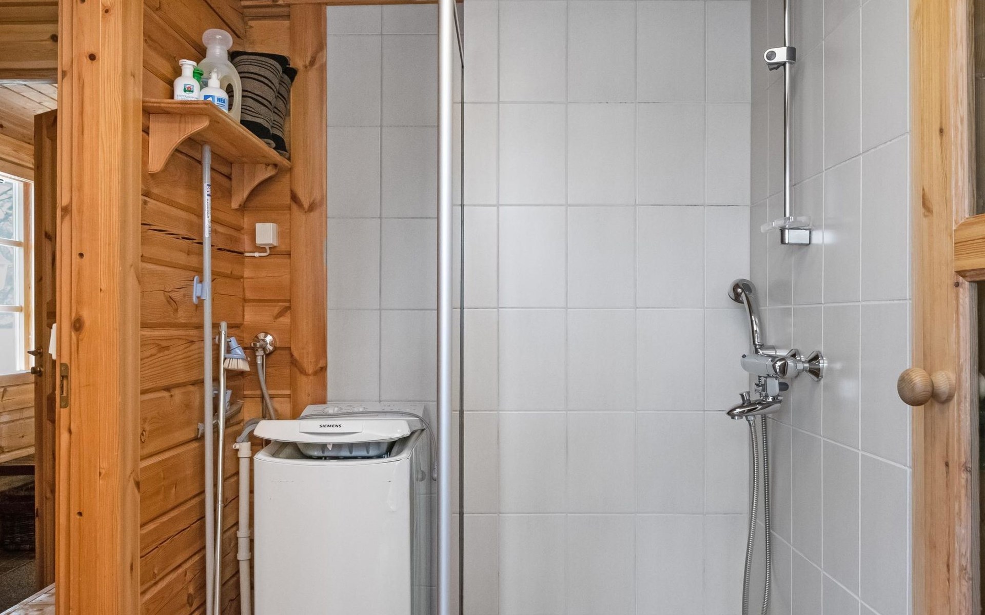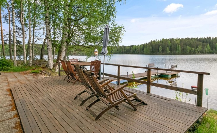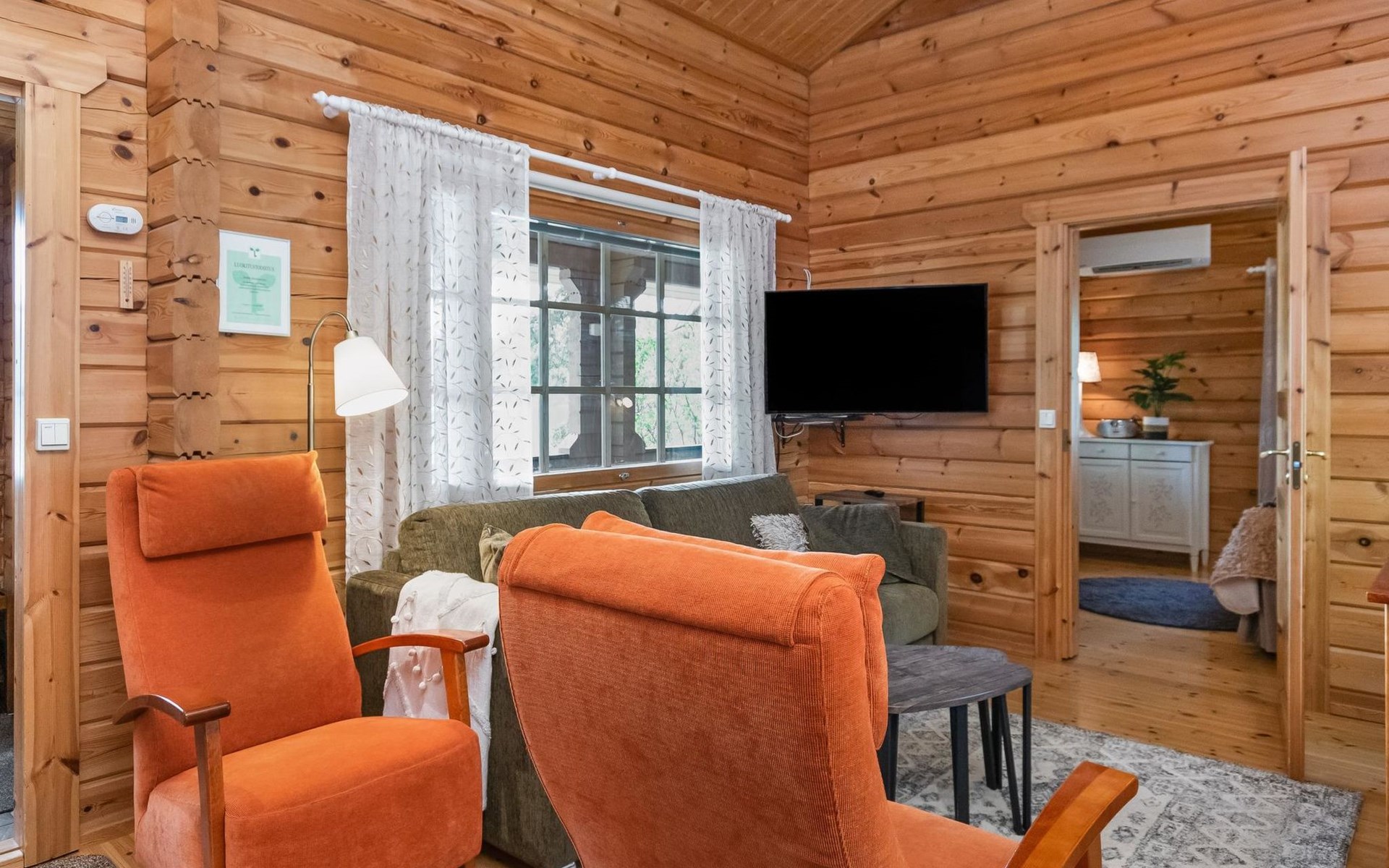 This log cabin, originally built in 1974 and fully renovated/rebuilt in 2007, features a living room/kitchen with a sofa bed for two, a bedroom with two single beds, and a WC with access to the bathroom with a shower. The sauna has a wood-burning stove. Enjoy the covered porch and the open terrace just a few steps from the water.