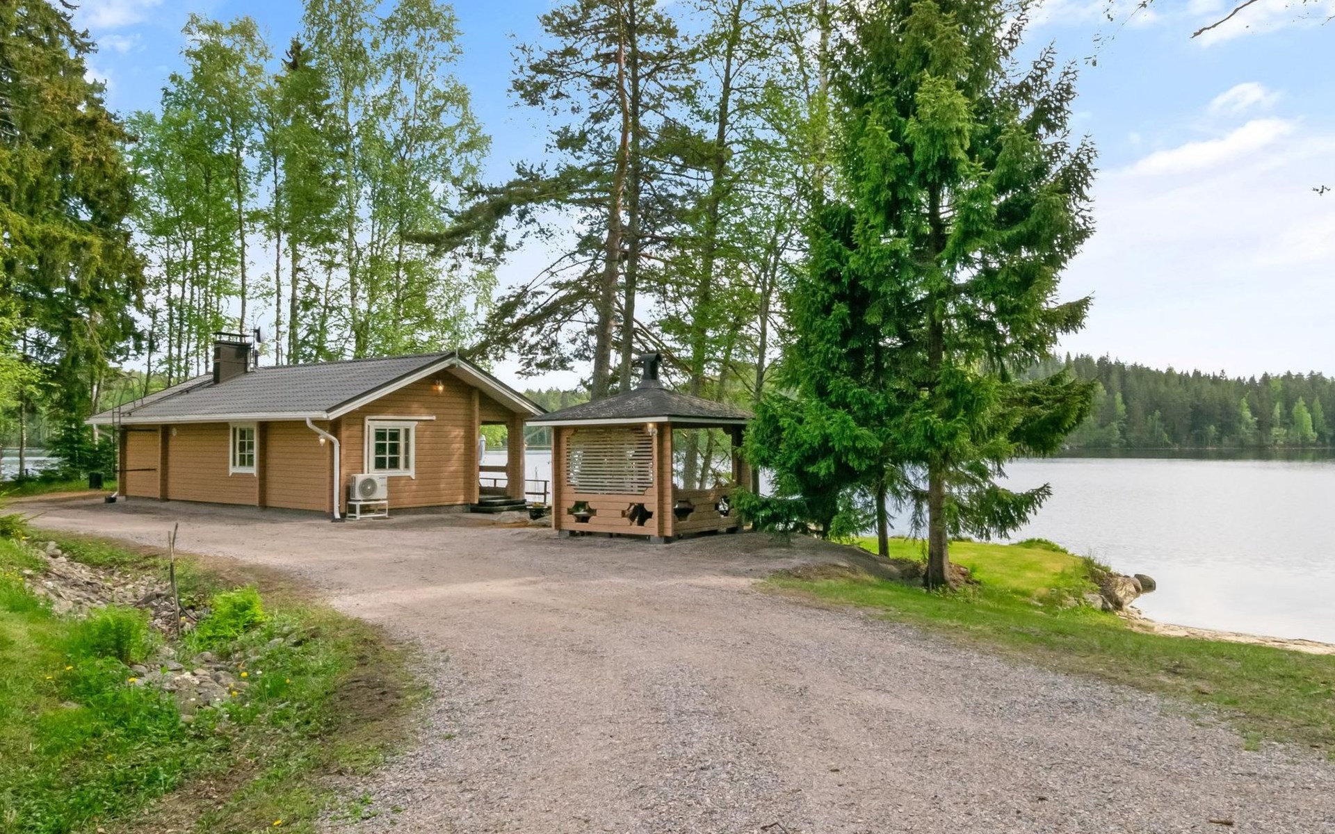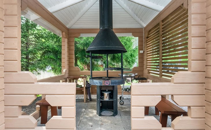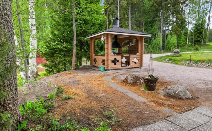 By the shore, a grill shelter with a traditional hut kitchen and an electric Muurikka pan is perfect for outdoor cooking.