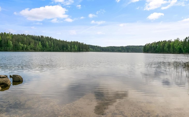 44 km north of Heinola, Lake Ylä-Rääveli (6 km long, 0.3 km wide) 5 m, a firm, gently sloping sandy bottom, a pier, and a rowing boat.
