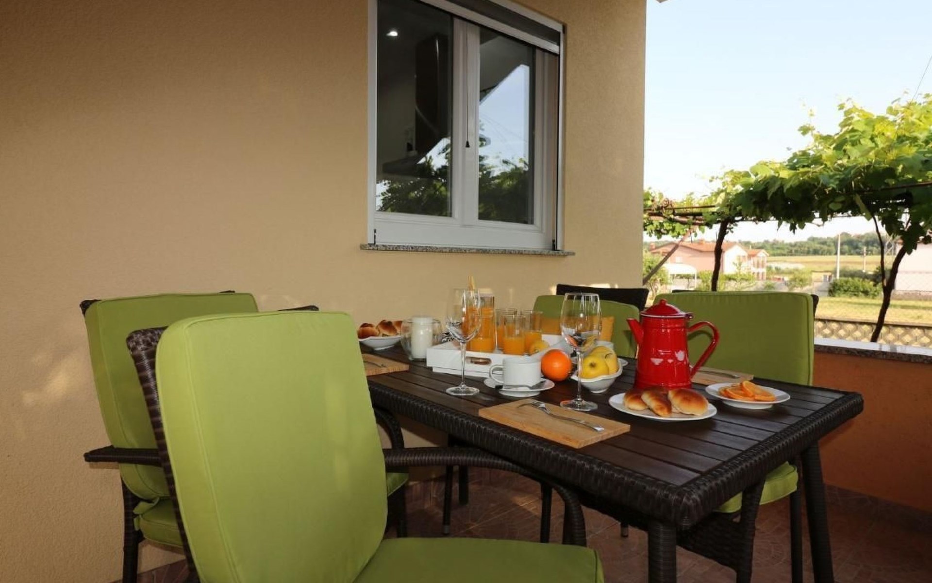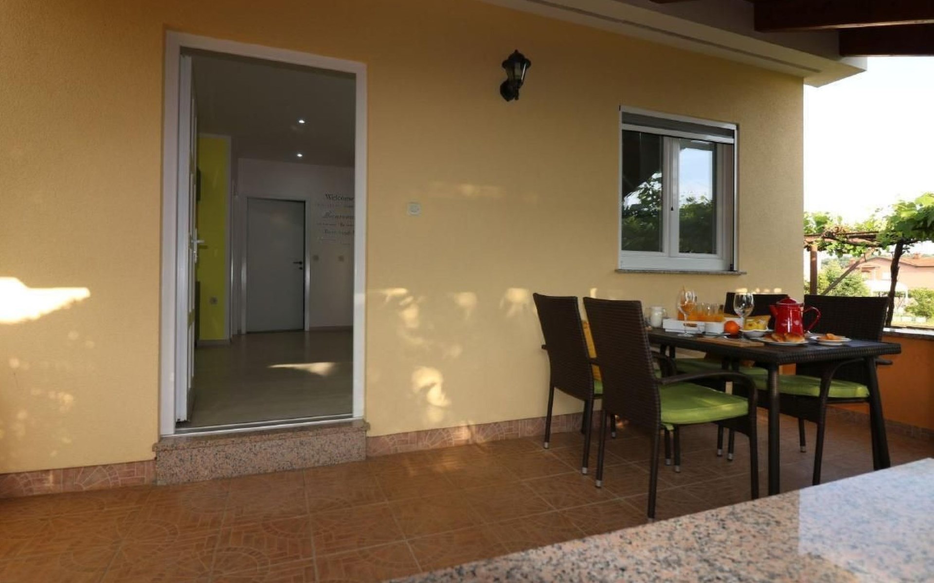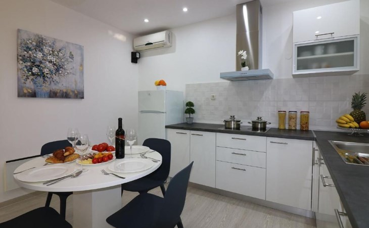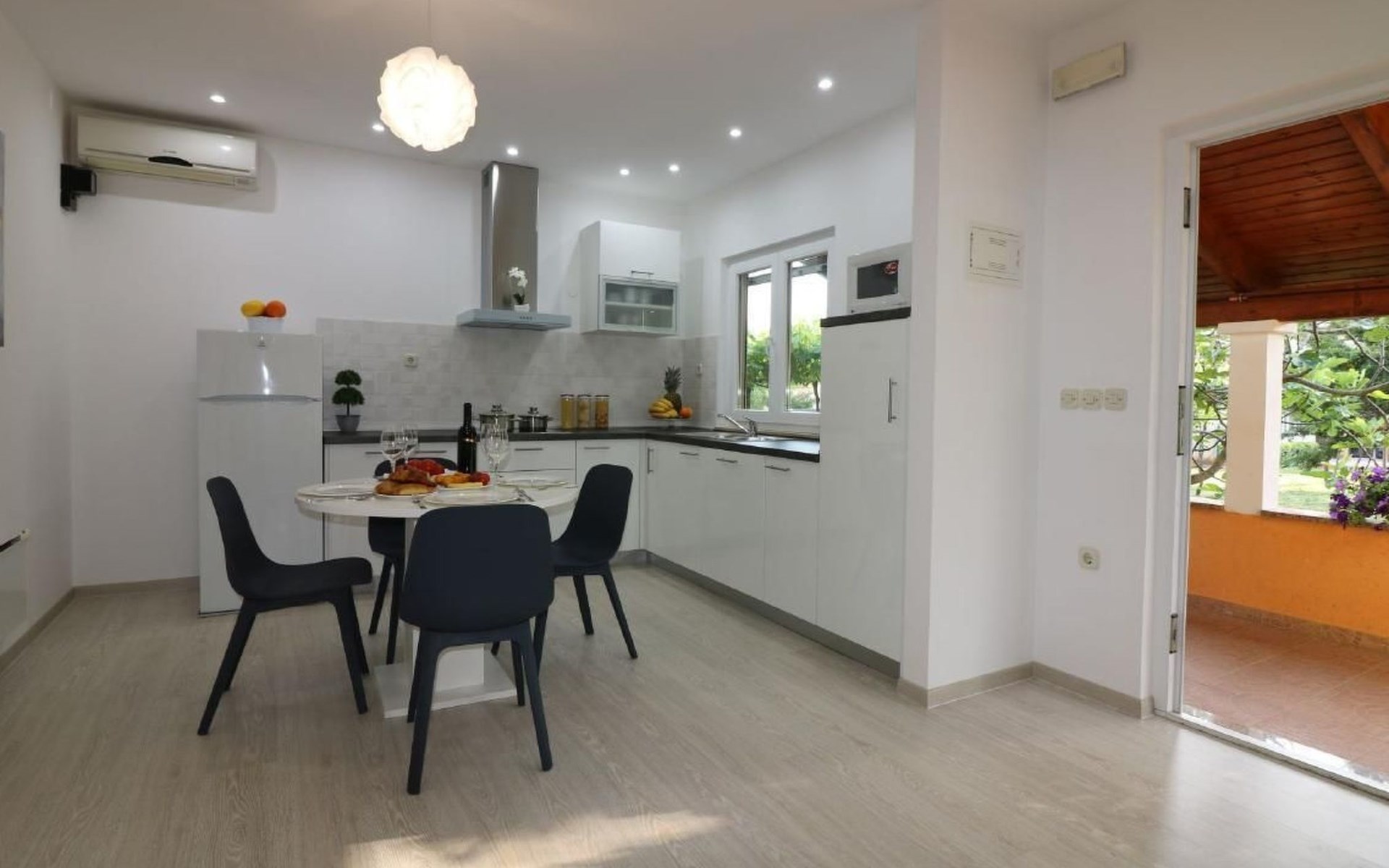 Immerse yourself in the tranquil charm of Residence Lorena, a picturesque bungalow in the holiday apartment complex of Portun, located in the captivating surroundings of Poreč, Istria. For those looking to escape the hustle and bustle of everyday life, this oasis of calm with its sunny, green location, just 2.5 km from the vibrant centre, offers the perfect retreat.Inside, guests will find a modern and attractively designed 62 m² 3-room flat on the ground floor. Equipped with a cosy living/dining room with satellite TV, air conditioning and direct access to the garden and terrace, this unit offers everything for an unforgettable stay. Two bedrooms, one with a double bed and the other with two single beds, guarantee a comfortable night's sleep. The kitchen is fully equipped with everything the modern kitchen heart desires, including a microwave, filter coffee machine, toaster, kettle and dishwasher. Guests also have access to a shower with separate WC and a covered terrace with furniture.The outdoor area sets the standard for relaxation and community with a shared garden, which is fenced and has a lawn, an orchard and a sunbathing area. The highlight is the saltwater pool (9 x 4 m), which is available for refreshment from April to mid-October. The offer is completed by garden furniture, a communal barbecue and private parking spaces, which emphasise the comfort.The area surrounding the Lorena residence promises both adventure and relaxation. There are shops and restaurants just a few steps away, and an attractive lido is only 2.5 km away. Poreč itself, known for its exceptional appeal, invites you to explore its lush vegetation, beautiful beaches and an old town full of ancient monuments and the famous Eufrasiana Basilica. In addition to the countless leisure activities, such as hiking, cycling and tennis, there are fascinating excursions to Venice, the Lim Fjord, Plitvice National Park and other places worth seeing.Discover the irresistible charm of Residence Lorena and treat yourself to an unforgettable holiday in the peaceful, green expanses of Istria. Here, where modern comfort meets idyllic natural landscapes, you are sure to find the perfect balance between relaxation and adventurous exploration. 2163-11-02/2-17-3