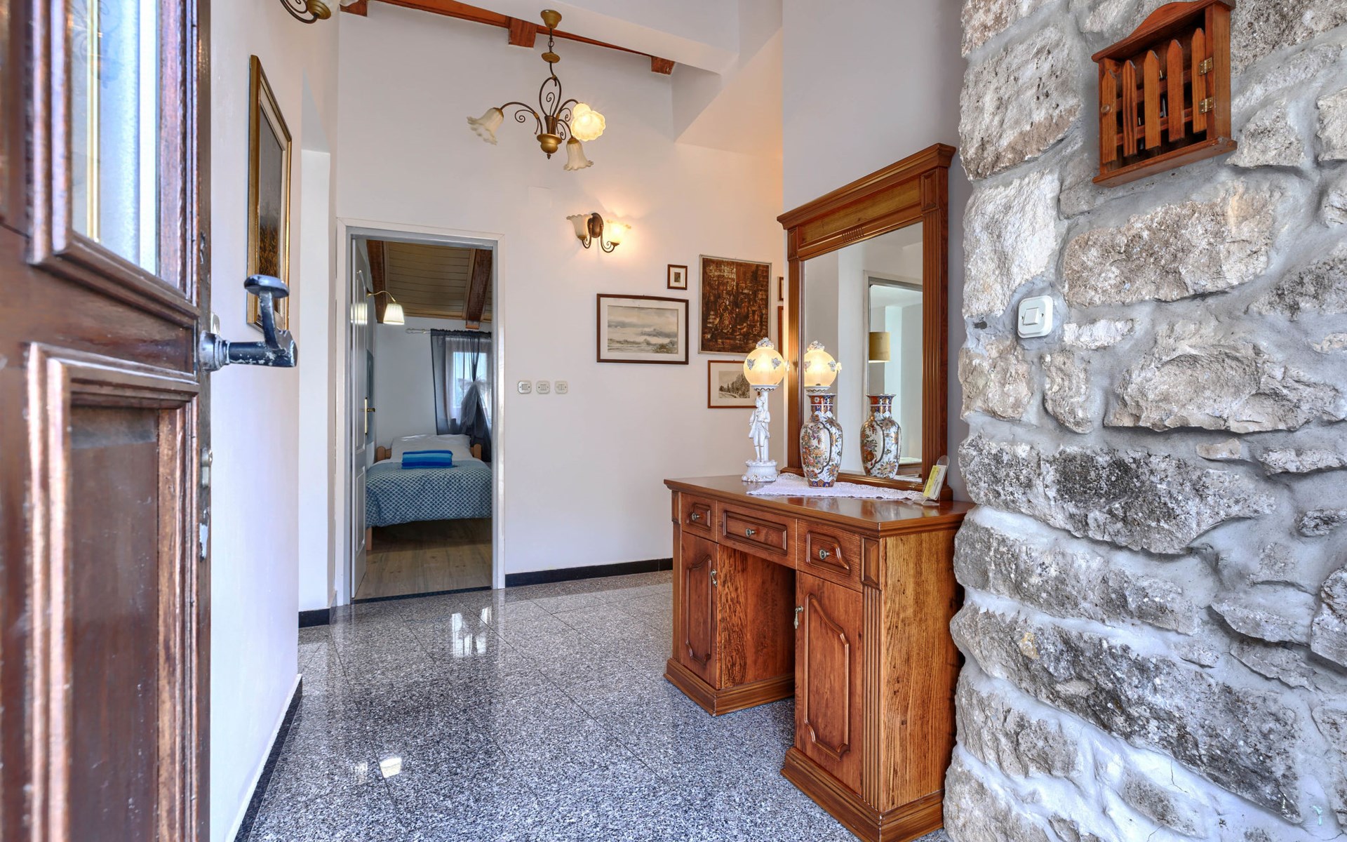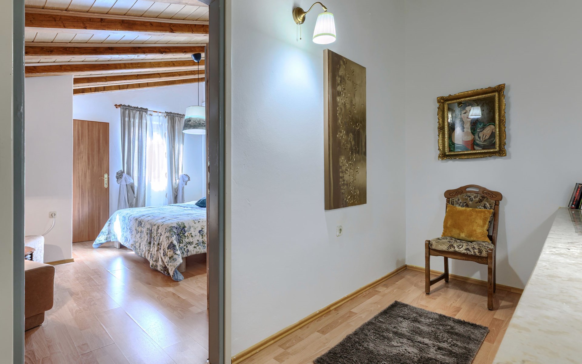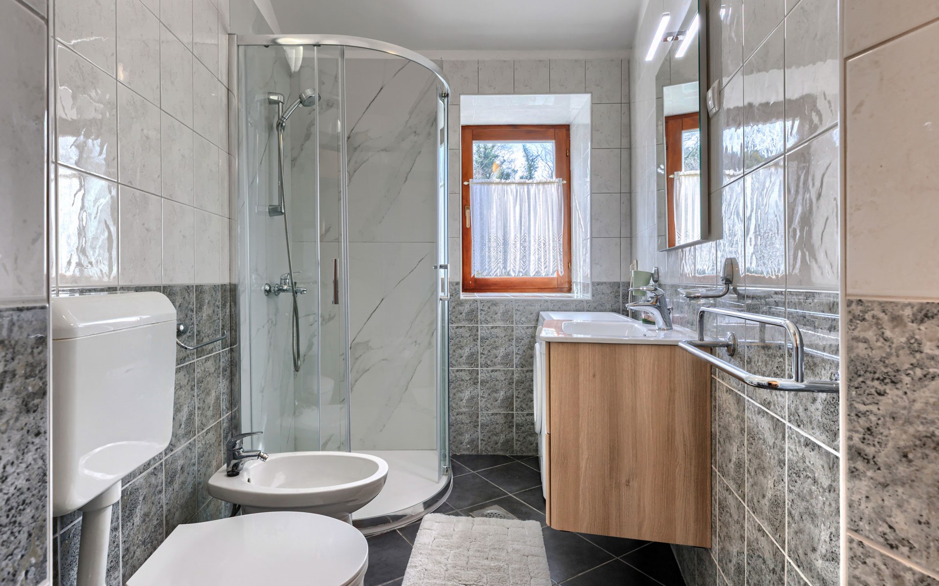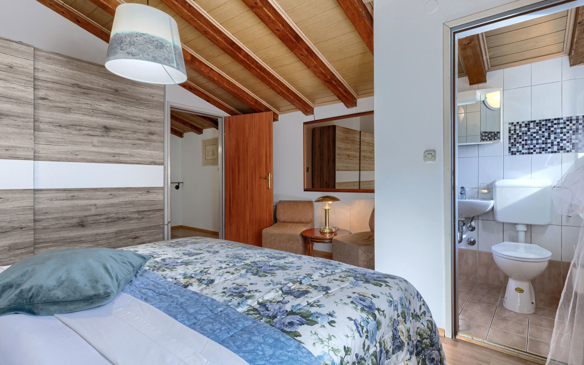 Landhuis, omgeven door bomen en weiden. 8 km van het centrum van Labin, 5 km van zee, aan een doodlopende weg. Voor medegebruik: terrein 6.000 m2 met bomen, weide, openluchtzwembad hoekig (12 x 5 m, 135 cm diepte, seizoensgebonden beschikbaarheid: 15.Mei. - 25.Sep.) met trap. Buitendouche, volleybalveld, prieel, terras, tuinmeubelen, barbecue, kinderspeelplaats (glijbaan, schommel). In het huis: internetaansluiting. Parkeerplaats op het terrein. Winkel 300 m, bushalte 2.9 km, kiezelstrand 5 km, rotsstrand 5 km. De eigenaar woont op hetzelfde terrein.