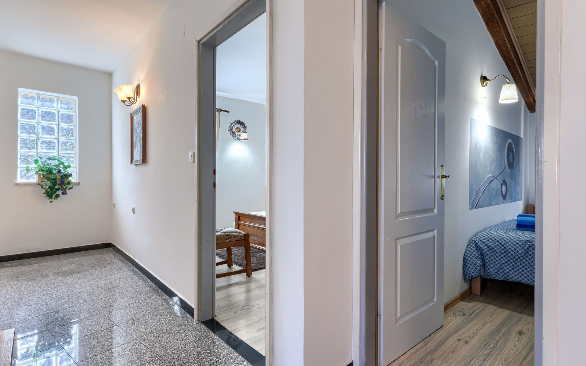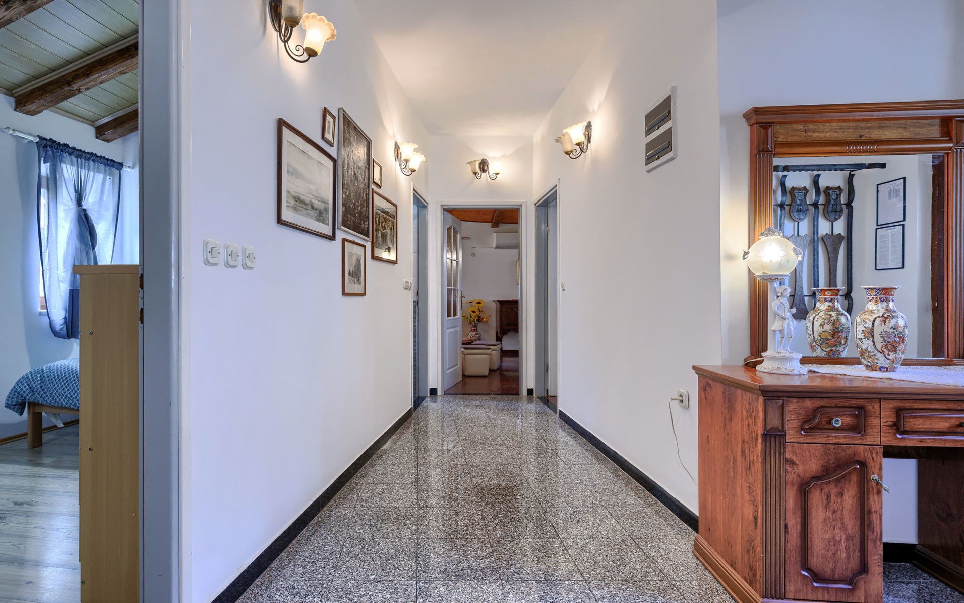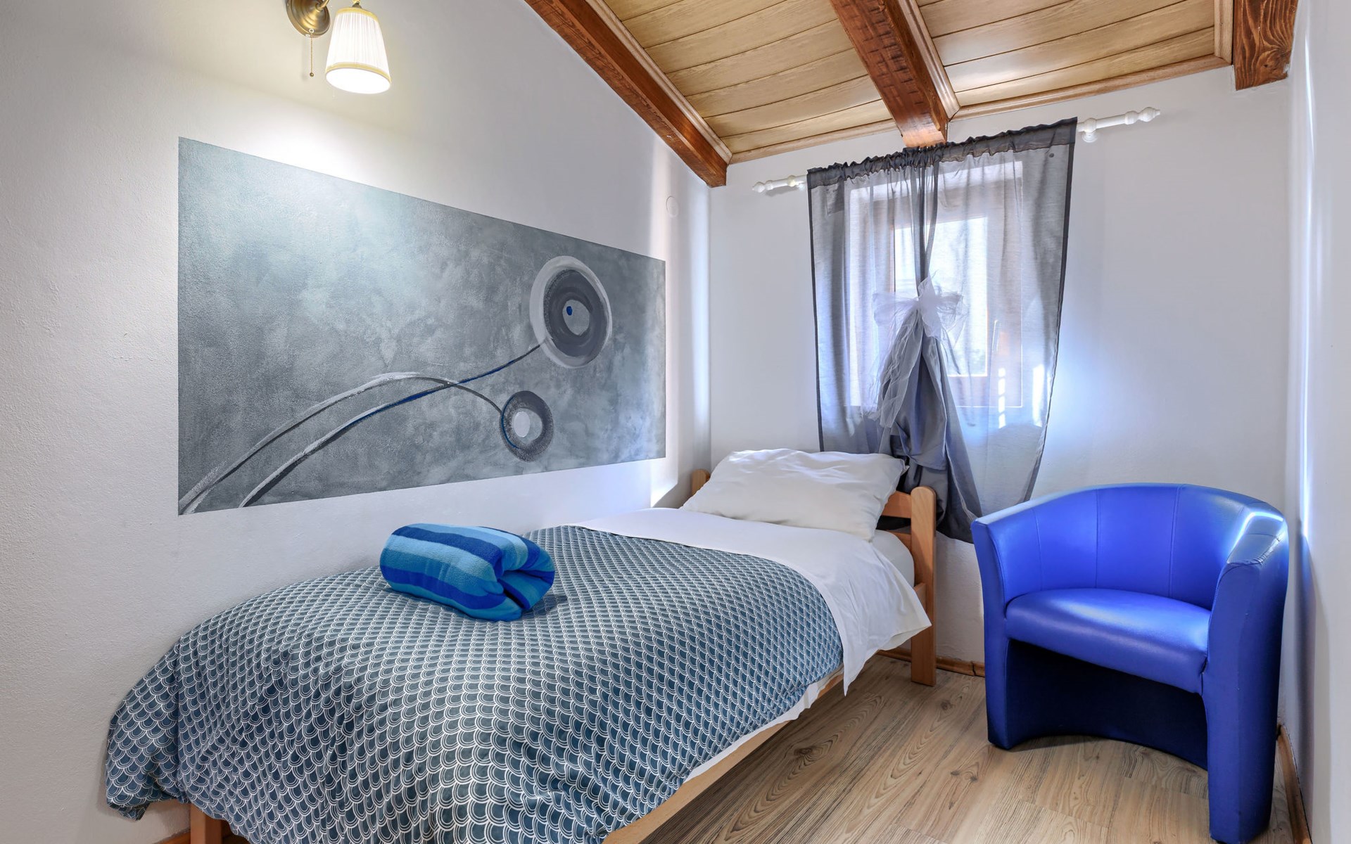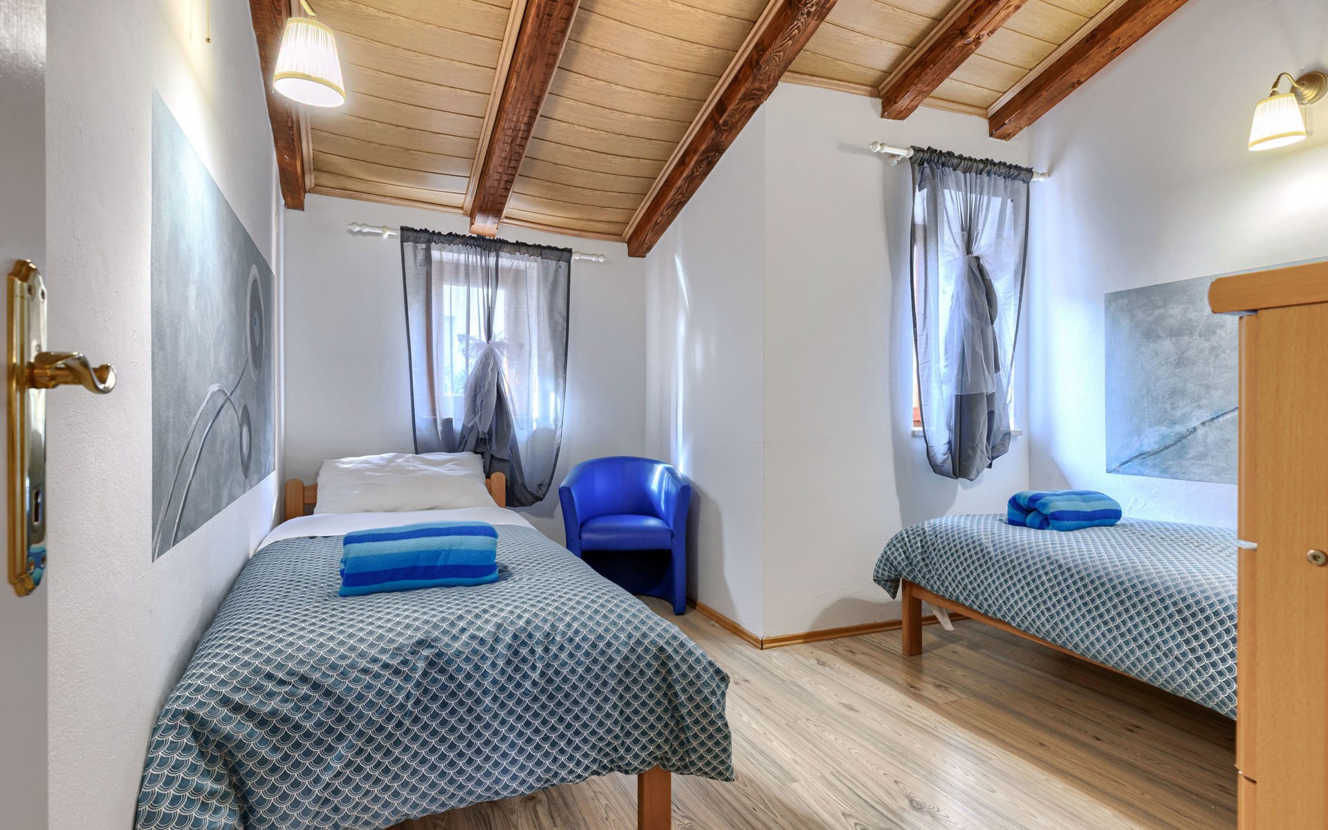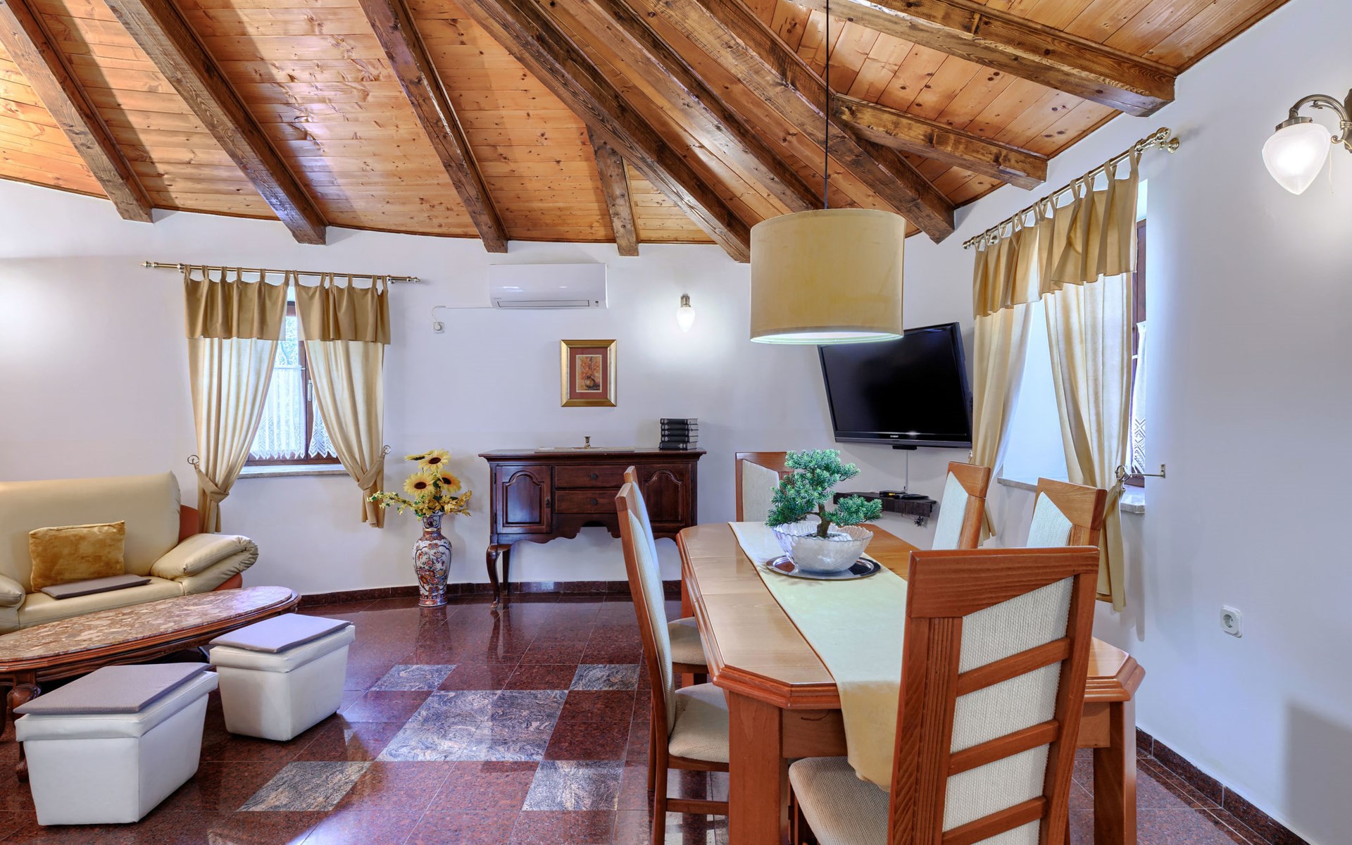 Landhuis, omgeven door bomen en weiden. 8 km van het centrum van Labin, 5 km van zee, aan een doodlopende weg. Voor medegebruik: terrein 6.000 m2 met bomen, weide, openluchtzwembad hoekig (12 x 5 m, 135 cm diepte, seizoensgebonden beschikbaarheid: 15.Mei. - 25.Sep.) met trap. Buitendouche, volleybalveld, prieel, terras, tuinmeubelen, barbecue, kinderspeelplaats (glijbaan, schommel). In het huis: internetaansluiting. Parkeerplaats op het terrein. Winkel 300 m, bushalte 2.9 km, kiezelstrand 5 km, rotsstrand 5 km. De eigenaar woont op hetzelfde terrein.
