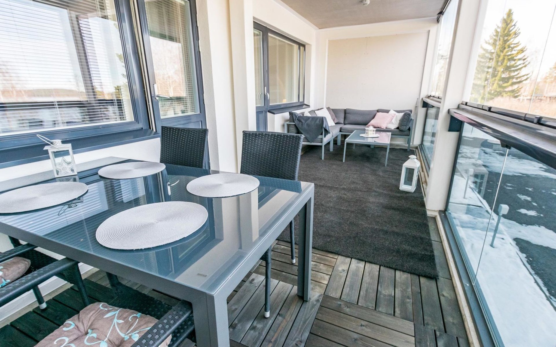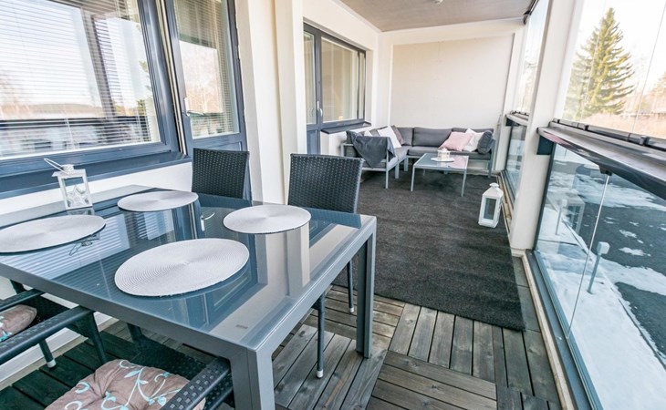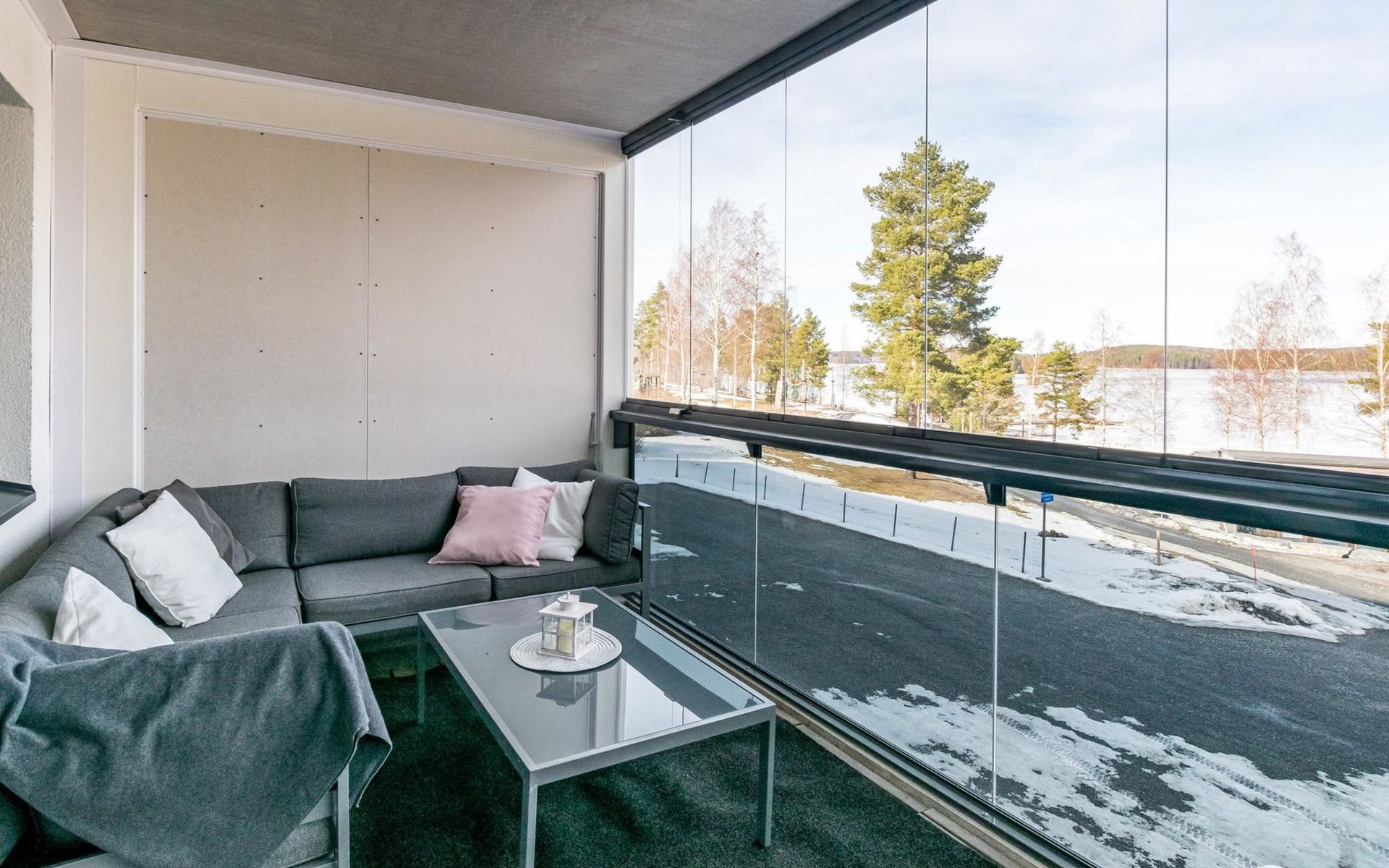 The glazed balcony is very spacious (17 m²), and it has a view to the lake. Access to living room and bedroom from the balcony.
