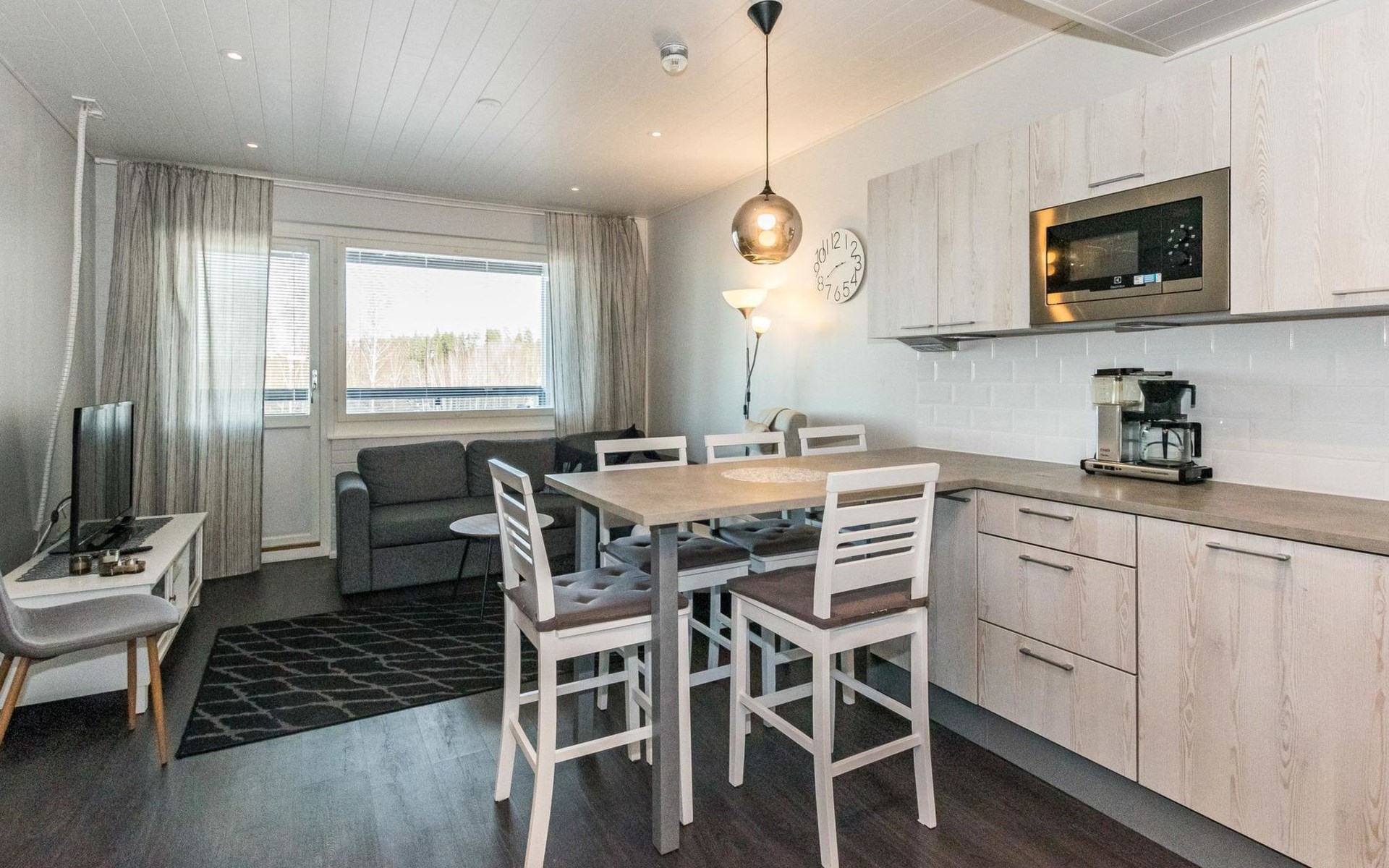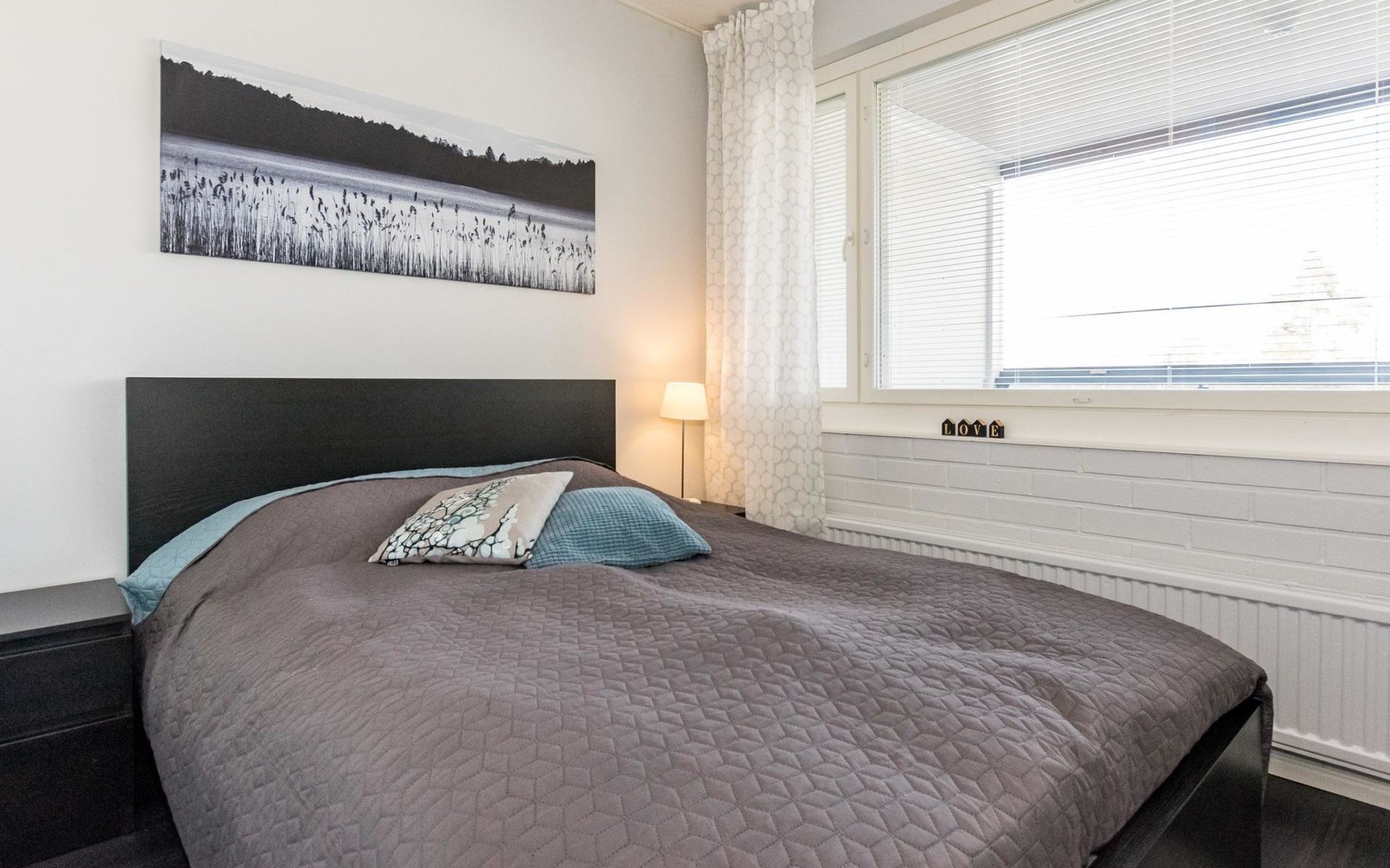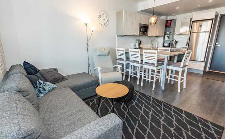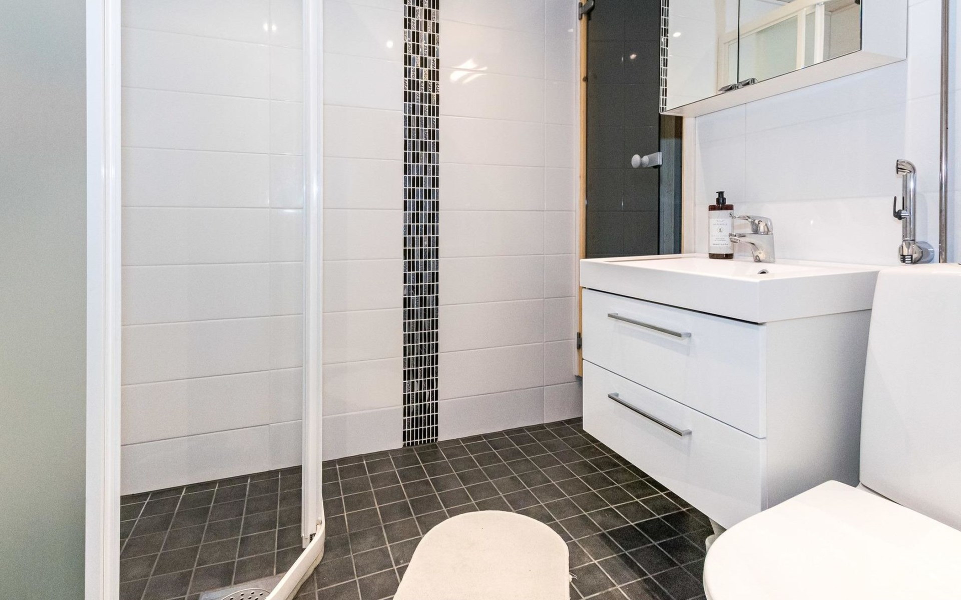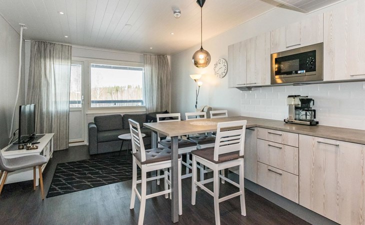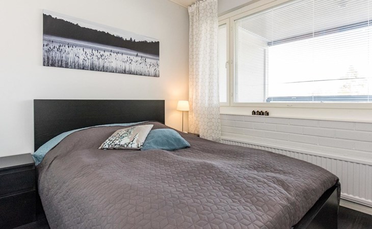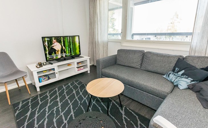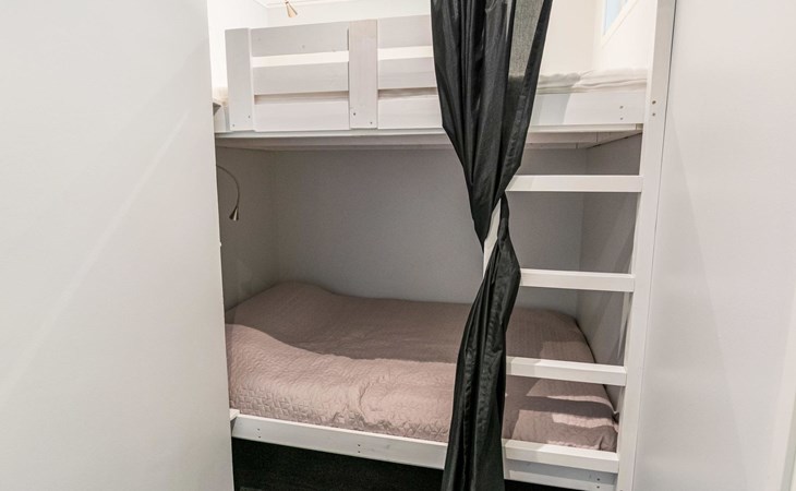 You will find a well-equipped living room/kitchen in the living area. The bedroom has a double bed and a bunk bed (width 140 cm) in a lockable space. There is an entrance to the shower room from the lockable space, where you will find a toilet, a shower and an electric sauna.