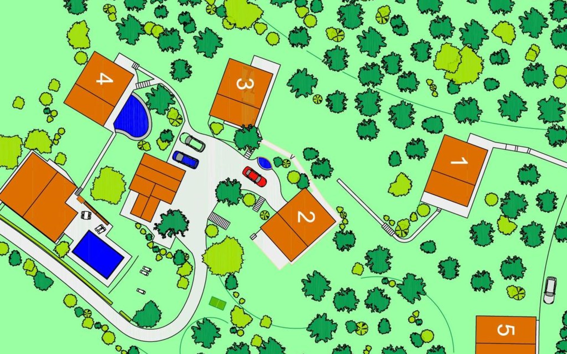 Vanuit de woonkamer bereikt u het overdekte terras dat is uitgerust met tuinmeubelen, terras en barbecue. Het huis is omgeven door een grote open vlakte waar zich ook een parkeerplaats bevindt. Een zonne-energie verwarmd zwembad van 8 x 5 meter is beschikbaar voor gemeenschappelijk gebruik. Ook een sauna in het buurthuis is beschikbaar tegen een vergoeding.