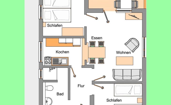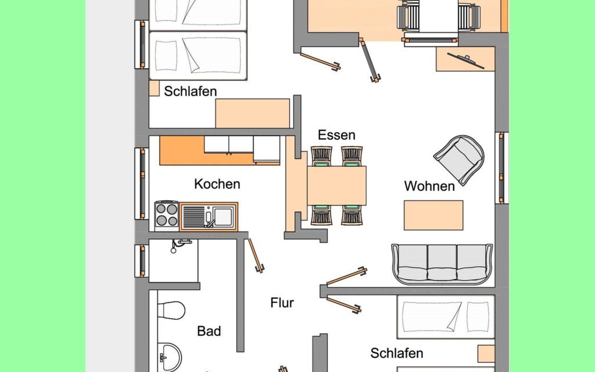 De 72 m² grote, massieve bungalows zijn identiek en het interieur is vergelijkbaar. Ze hebben elk een woonkamer, twee slaapkamers, keuken, badkamer met douche evenals een hal met garderobe. De 20 m² grote woonkamer bestaat uit hoekbank met slaapfunctie voor een eventuele vijfde persoon, sideboard met satteliet-TV, radio, en een eethoek. Een van de slaapkamers heeft een tweepersoonsbed en de tweede slaapkamer heeft twee eenpersoonsbedden. Er is ook een kinderbed en een kinderstoel aanwezig. De keuken is volledig uitgerust met elektrisch fornuis en oven, magnetron, koelkast met vriesvak, koffiezetapparaat, broodrooster, waterkoker, en een doorgeefluik naar de eethoek in de woonkamer.