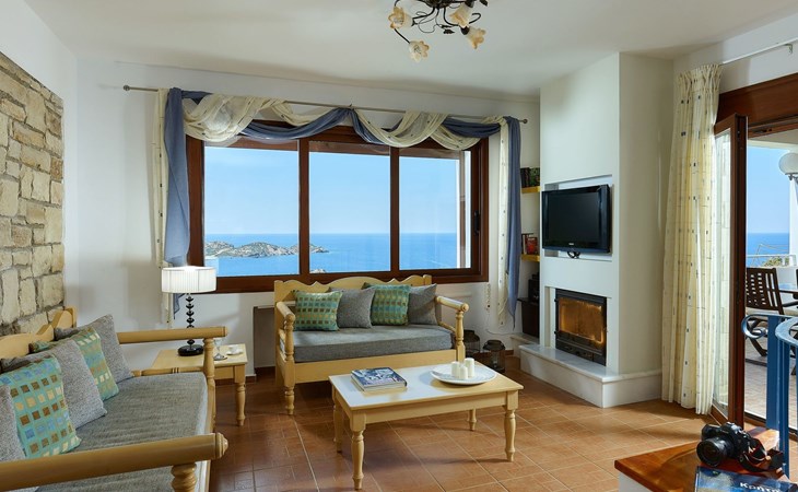 This two-storey villa has three bedrooms and can accommodate six persons. The spacious living area offers comfortable sofas and a fireplace. The modern kitchen is fully equipped. There are two bathrooms, one with a bath tub and one with a shower. The sauna is another highlight. There's WLAN throughout the property.The villa offers access to many tourist attractions, beaches, big cities, airports, harbours/ports, etc. You can visit on foot or by car the calm beach at the bay of “Kalo Chorafi” which is at a distance of only 600 m from the Villas. You can swim at the light blue transparent waters of the secluded beach enjoying the Cretan sun under the umbrellas and the sunbeds provided by us.Please note: the rental fee includes breakfast and cleaning (every 2 days):