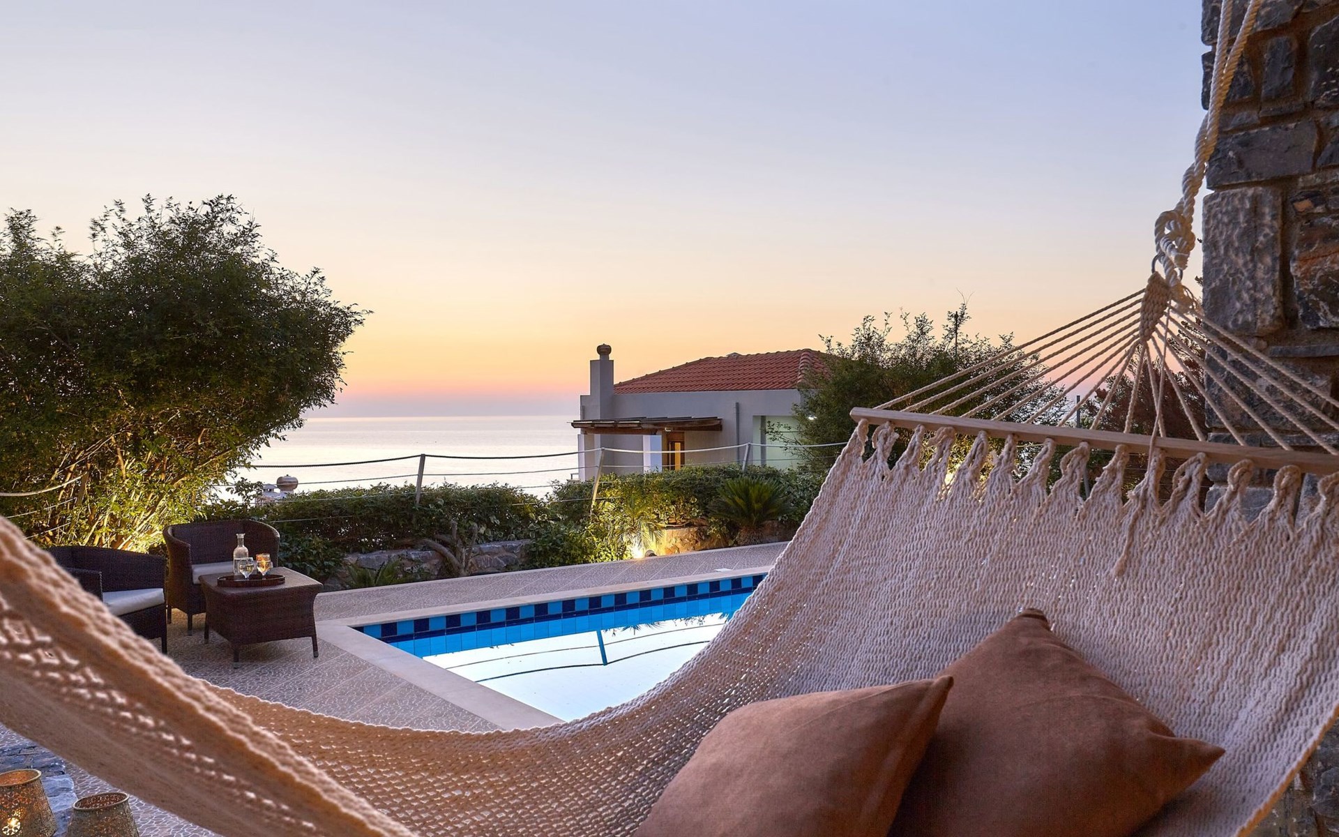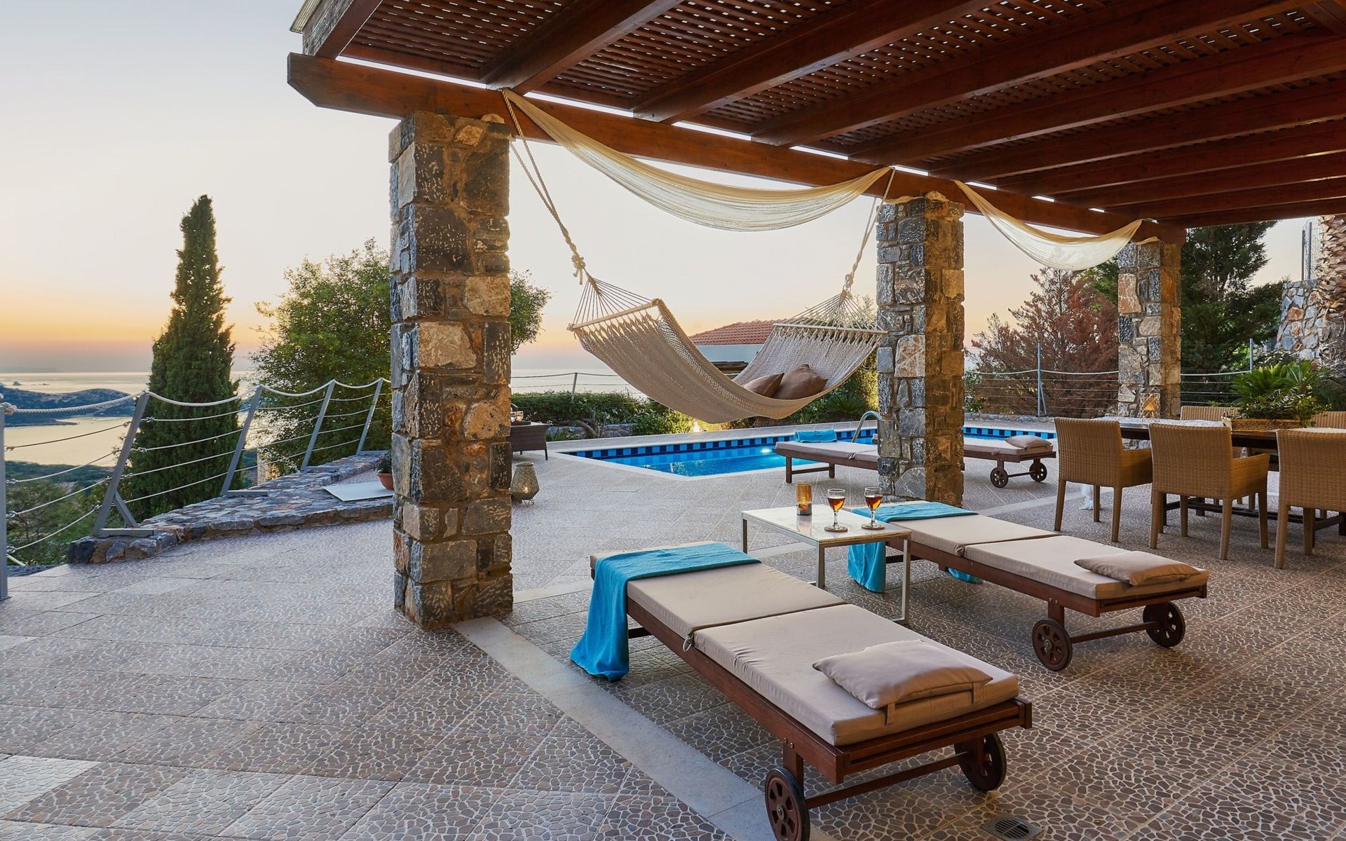 They are within the great region of the beautiful bay of Bali, one of the most favourite tourist resorts of the sunny Greek island of Crete. They are close, as well, to the Northern Highway of Crete at a distance of 39,5 km from Heraklion and of 37,5 km form Rethymno. Thus, they offer access to many tourist attractions, beaches, big cities, airports, harbours/ports, etc. You can visit on foot or by car the calm beach at the bay of “Kalo Chorafi” which is at a distance of only 600 m from the Villas. You can swim at the light blue transparent waters of the secluded beach enjoying the Cretan sun under the umbrellas and the sunbeds provided by us.Newly built (2010), fully detached sea view holiday villa with a private swimming pool, sunny terrace with a traditional stone grill and a beautiful gardenEnjoy your private pool and gaze at the sea views daily, you can dream, you can travel with the Nymphs of the Ocean and enjoy the spectacular sunset at the bay of Bali wherever you are in the Villa.This is a complex of four luxurious villas, ideal to host couples, families, friends and in general up to 20 people at the same time. The villas are designed to be independent, each with a private pool and a parking lot, a garden and furnished verandas, where you can enjoy the sea, the sun, a drink or a meal throughout the day.