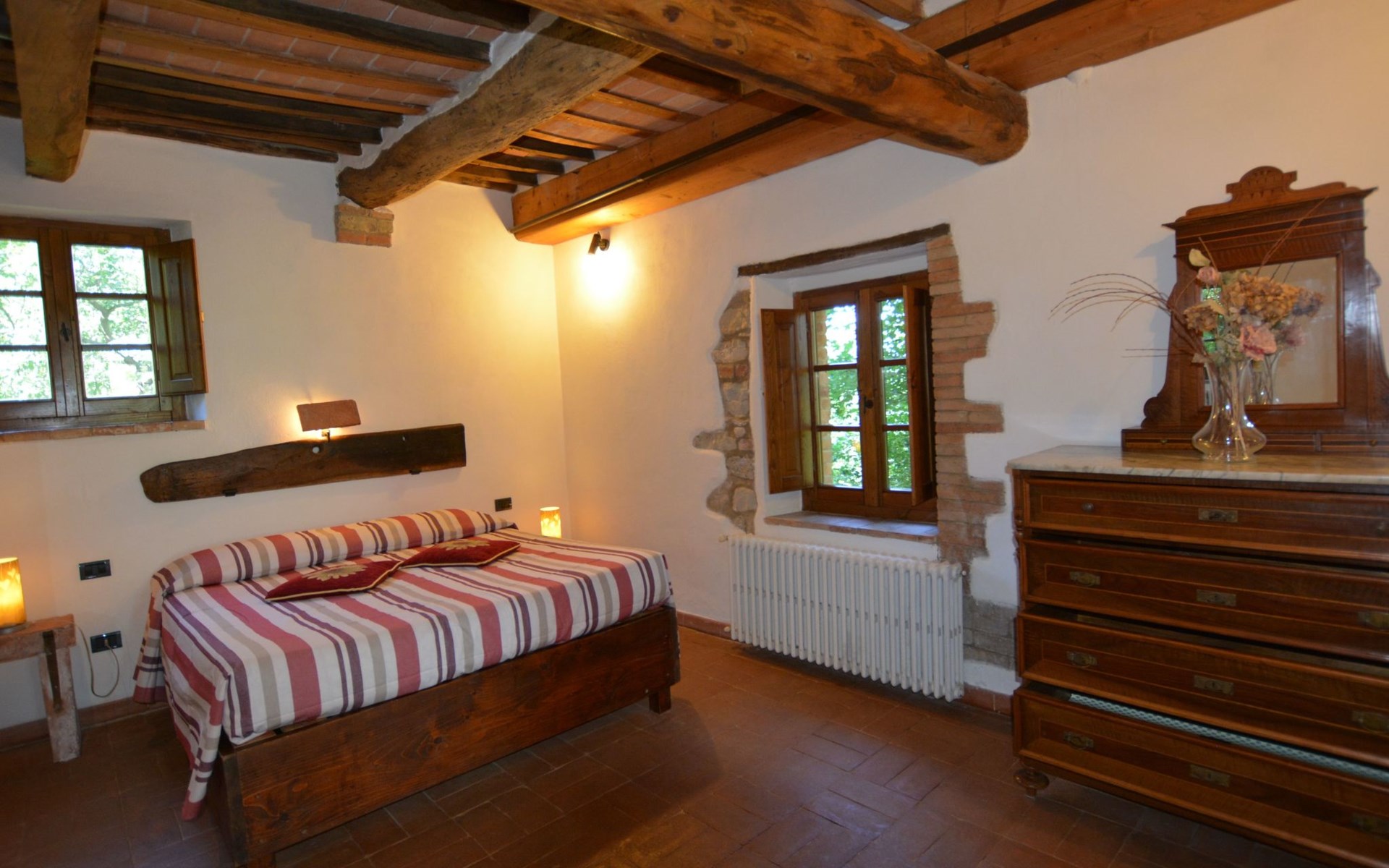 The flat LA CASINA is one of the three flats that make up IL CASETTINO - TOURIST LETTINGIL CASETTINO - TOURIST RENTAL is an old farmhouse in Radicondoli, in the province of Siena, immersed in the green countryside of the Tuscan hills and in the centre of a natural wildlife reserve. It offers a completely relaxing stay, but also the possibility of reaching the main Tuscan art cities in a short time: Siena, Florence, Pisa, Lucca, Volterra, San Gimignano, San Galgano Abbey, as well as attractive seaside resorts on the Tyrrhenian coast.Il Casettino has three flats for 2/4 persons, each with independent entrance and independent panoramic garden.The swimming pool is very welcoming, surrounded by lavender, olive and cypress trees (round, diameter 8.00 m, depth 1.30 m). Il Casettino is 1.5 km from the medieval village of Radicondoli, where you can find restaurants, pizzerias, and a tennis court. Pets are allowed.IN THE SUMMER MONTHS OF JUNE, JULY, AUGUST AND SEPTEMBER WE ONLY ACCEPT BOOKINGS FROM SATURDAY TO SATURDAY.LA CASINA is one of the three flats of which IL CASETTINO is composed and derives from the renovation of the rural outbuildings of the main building, it has been carefully carried out leaving unaltered the characteristics of the original structure, enhancing its architectural value, preserving typical spaces of the rural life of the past, such as the manger that has become a lovely feature of the living room.Features: Three-room apartment for 2+2 persons (63 m²)Ground floorTerracotta floor and ceiling with original wooden beams and terracotta tiles Kitchen - with hob, fridge, freezer, electric oven, washing machine and crockeryLiving room - with double sofa bed, satellite TV and DVD playerBedroom - with double bed, wooden slats and orthopaedic mattress, furnished with wardrobe and chest of drawers typical of rural furnishings Bathroom - with shower cubicle LPG heating system which feeds the hot water system Independent independent garden which overlooks the valley like a natural terrace, with characteristic barbecue, for pleasant al fresco dining, with views over the valleyFree parkingFree wi-fi internet connectionKitchen, bed and bathroom linen is provided (any further changes of linen, after the first, will be supplied on request, they are not included in the rate).IL CASETTINO is near the small village of Radicondoli. It is located in a strategic position, such that the main Tuscan art cities can be reached in a short time: Siena, Florence, Pisa, Lucca, Volterra, San Gimignano, Monteriggioni. For art lovers, a must-see is the suggestive Basilica of San Galgano, which, thanks to its special acoustics, is the venue for numerous classical music concerts. Also within easy reach of Radicondoli are the Chianti vineyards and attractive seaside resorts on the Tyrrhenian coast, including: Follonica, Castiglione della Pescaia, the Etruscan Gulf of Baratti, to name but a few. Also worth mentioning is the possibility of reaching, via the port of Piombino, the Island of Elba, which, together with the other islands of the Tuscan Archipelago, is part of Europe's largest Marine Park, the largest protected area in the European seas. The Park is characterised by a great variety of habitats, populated by a variety of life forms. From the beaches of Elba to the rocky cliffs of western Capraia, a myriad of plant and animal species live in every crevice of one of the most fascinating natural environments: the sea. Those who wish to take a plunge into the past, with all its history, have the opportunity to walk along the Via Francigena. It represents another great wealth that belongs to this territory. In fact, the Via Francigena has been declared a 'Great Cultural Route' by the Council of Europe, passing through Great Britain, France, Switzerland, Italy and the Vatican State. It was started by the Longobards and later incorporated into a pilgrimage route. In Tuscany, it passes through the province of Massa Carrara, Pisa, Lucca, Florence and Siena. The connection point to the Via Francigena, closest to Radicondoli, is near Monteriggioni, at Badia ad Isola and leads to Siena. For those who want to undergo physical cures, but also to regain their physical form and beauty, the ideal is to spend a day of relaxation and pleasure at the Petriolo Thermal Baths (40 minutes by car) or at the Terme di San Giovanni in Rapolano Terme (1 hour by car) surrounded by unspoilt nature. Cycling enthusiasts also have routes and itineraries for all needs, which develop in the nature of the Radicondolo hills. IT052025C2SULGAZCG