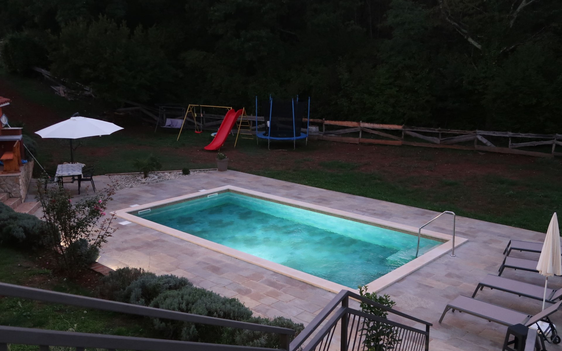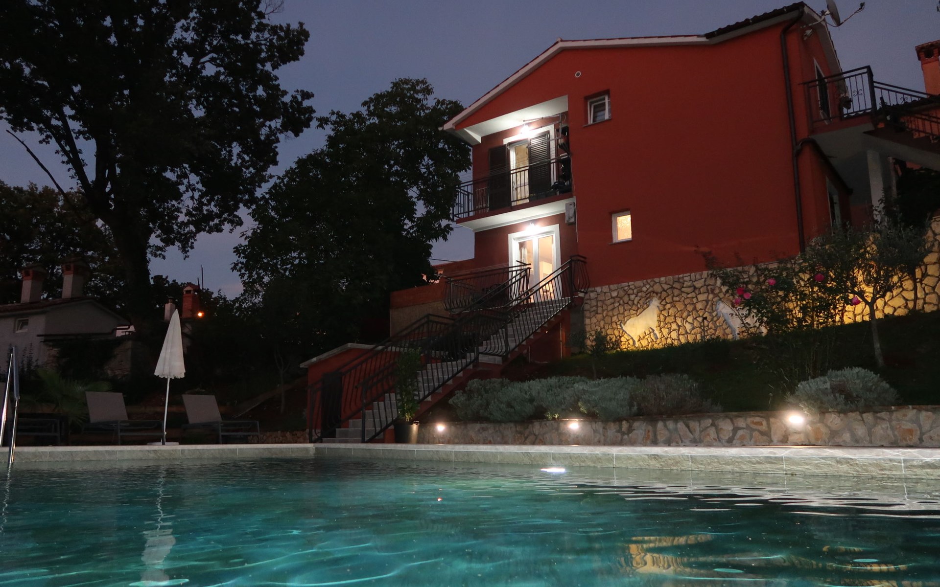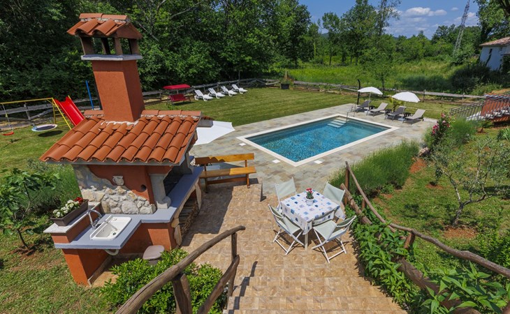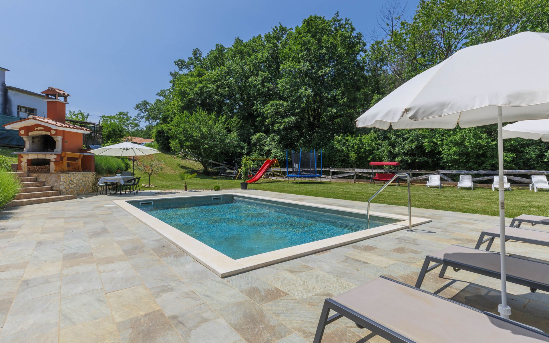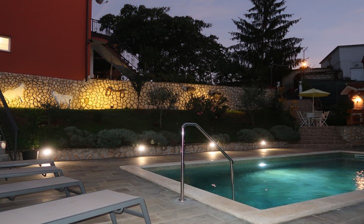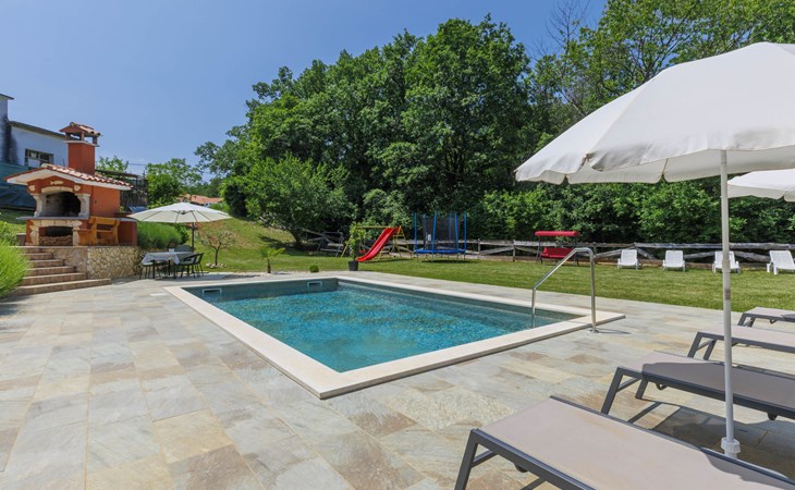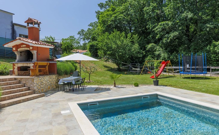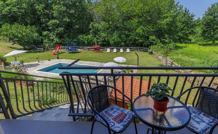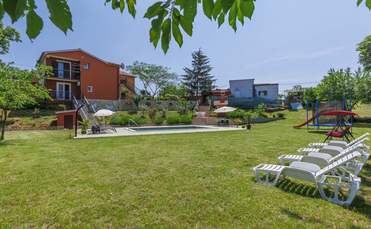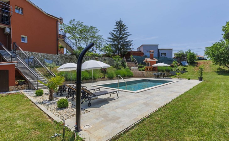Huis met 3 woningen "Korina". In het gehucht Sveti Bartul, 4 km van het centrum van Labin, 9 km van zee. Voor alleengebruik: terrein 800 m2 met planten en bomen, openluchtzwembad hoekig (4 x 8 m, 135 cm diepte, seizoensgebonden beschikbaarheid: 04.Jun. - 08.Okt.) met trap. Buitendouche, terras, tuinmeubelen, barbecue (glijbaan, schommel), onderhoud zwembad door de eigenaar/tuinman. In het huis: internetaansluiting, trampoline. Parkeerplaats bij het huis op het terrein. Winkel 2.5 km, supermarkt 4 km, restaurant 4 km, bushalte 4 km, kiezelstrand 9 km. Vliegveld 45 km van het huis.