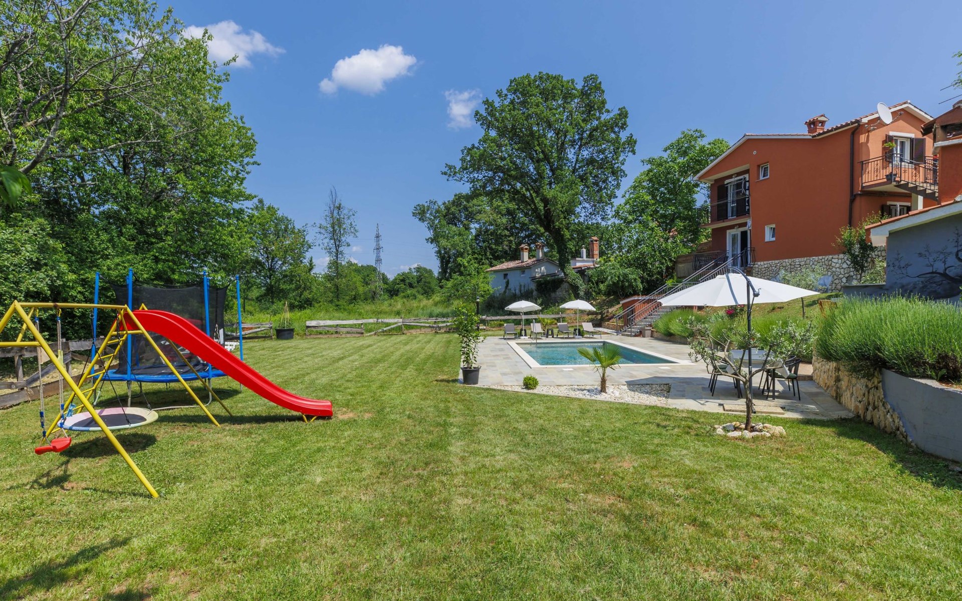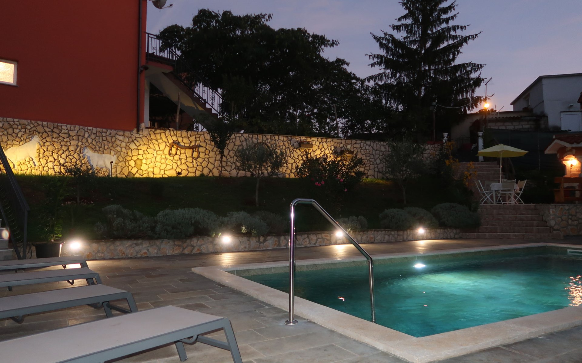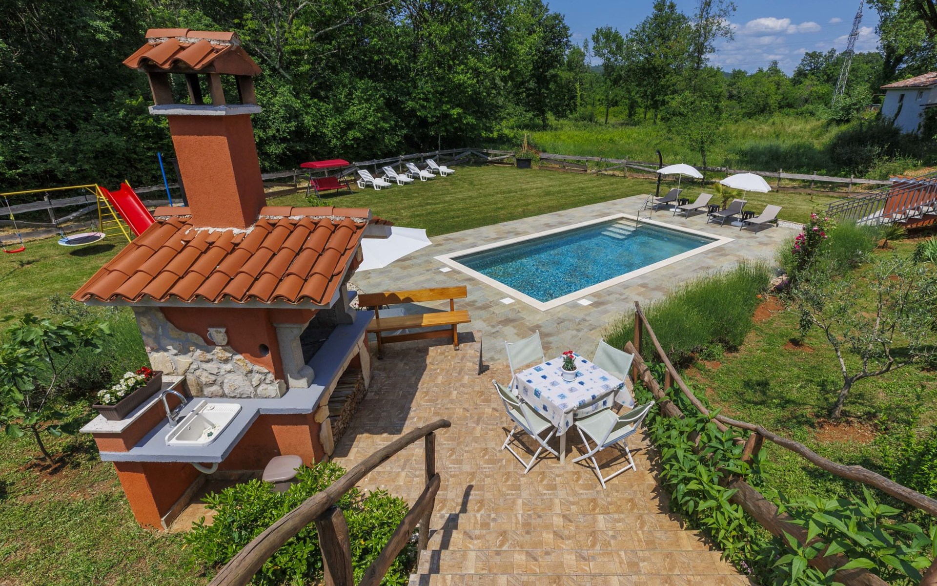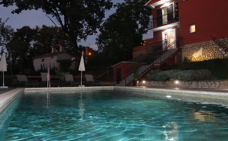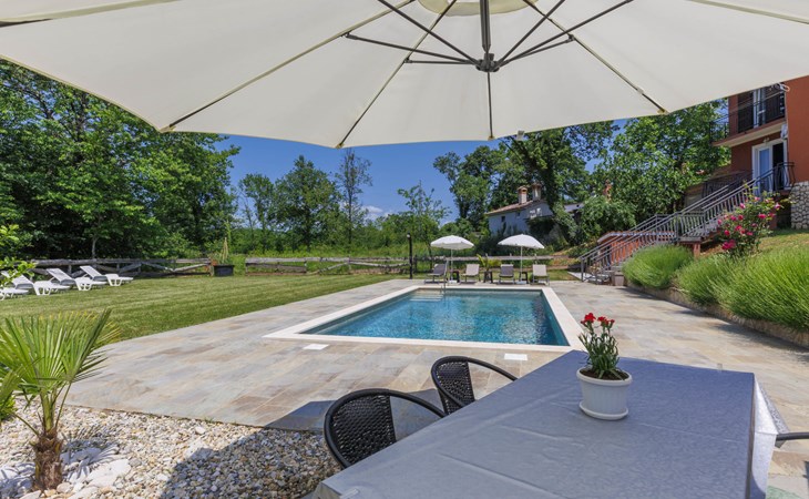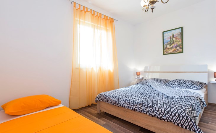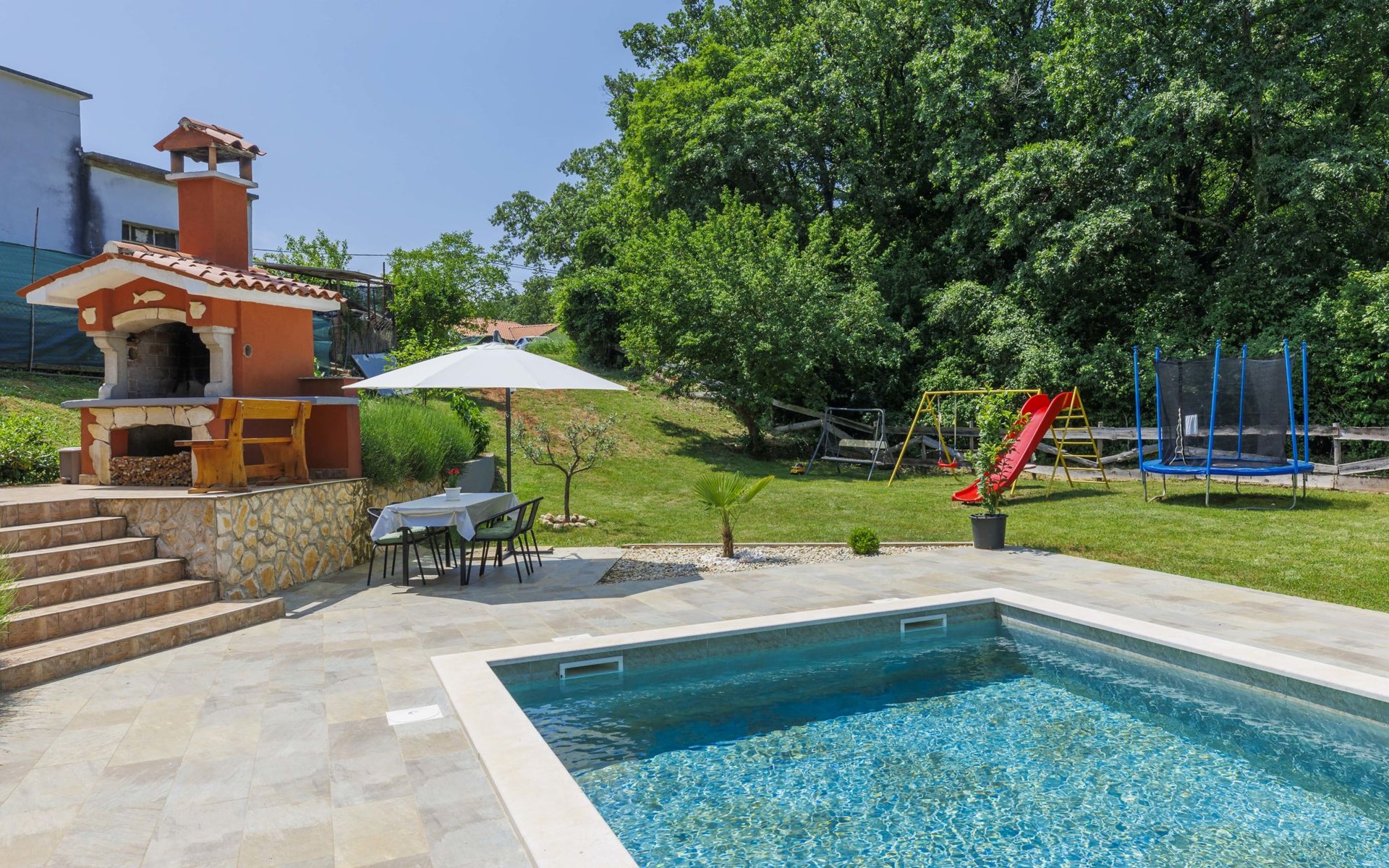 Huis met 3 woningen "Korina". In het gehucht Sveti Bartul, 4 km van het centrum van Labin, 9 km van zee. Voor alleengebruik: terrein 800 m2 met planten en bomen, openluchtzwembad hoekig (4 x 8 m, 135 cm diepte, seizoensgebonden beschikbaarheid: 04.Jun. - 08.Okt.) met trap. Buitendouche, terras, tuinmeubelen, barbecue (glijbaan, schommel), onderhoud zwembad door de eigenaar/tuinman. In het huis: internetaansluiting, trampoline. Parkeerplaats bij het huis op het terrein. Winkel 2.5 km, supermarkt 4 km, restaurant 4 km, bushalte 4 km, kiezelstrand 9 km. Vliegveld 45 km van het huis.