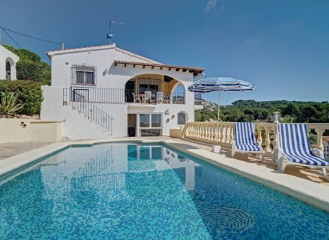 Comfortabel vakantiehuis met gemeenschappelijk zwembad in Moraira, Costa Blanca, Spanje voor 6 personen. Het huis is gelegen in een kust-, bosrijke en residentiële omgeving en ligt op 3 km van het strand.