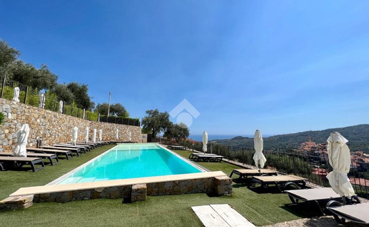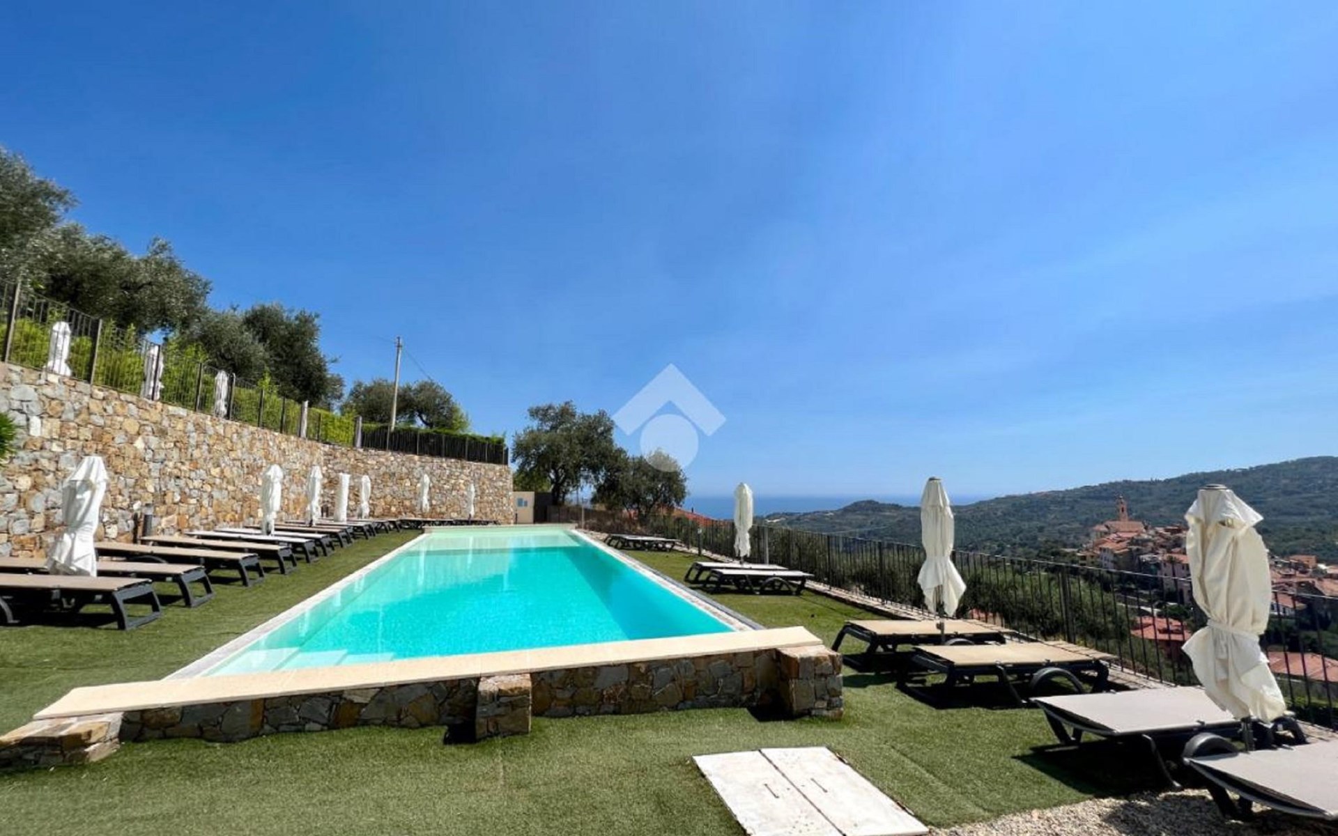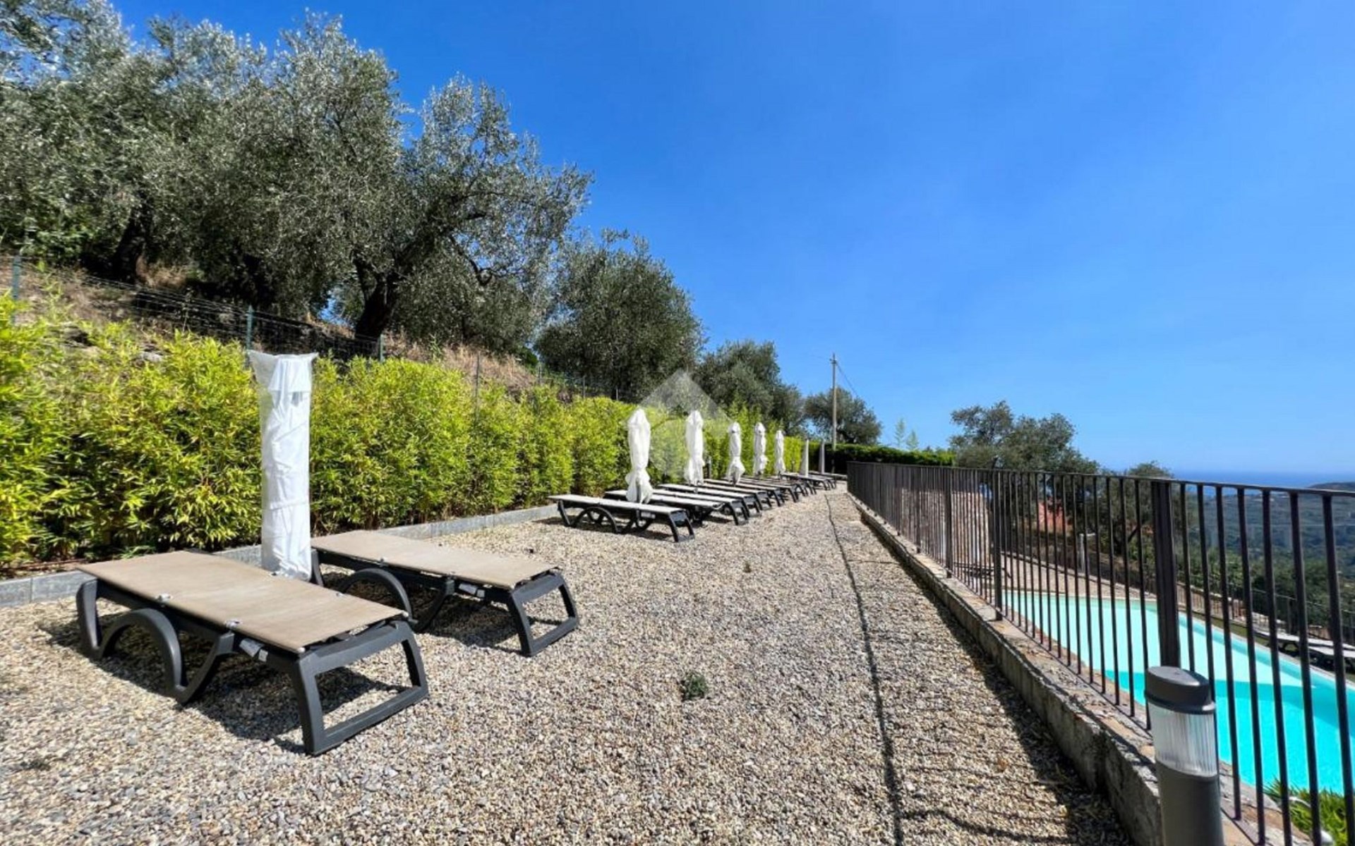 Twee ligbedden en parasol voor het zwembad comfortabele residentie "Antica Torre", van 2 verdiepingen. In het centrum van Civezza, 4 km van het centrum van San Lorenzo al Mare, 7 km van het centrum van Riva Ligure, 14 km van het centrum van Sanremo, verhoogde ligging, 4 km van zee, aan een doodlopende weg. Voor medegebruik: openluchtzwembad (12 x 4 m, 100 - 140 cm diepte, seizoensgebonden beschikbaarheid: 15.Jun. - 15.Sep.). Buitendouche. Trappenweg (8 treden) naar het huis. Parkeerplaats bij het huis. Supermarkt, restaurant, bar 400 m, fietsverhuur 4 km, bushalte 400 m, treinstation "Imperia Oneglia" 7 km, zandstrand 4 km. Jachthaven 4 km. Auto noodzakelijk. Badmuts verplicht.