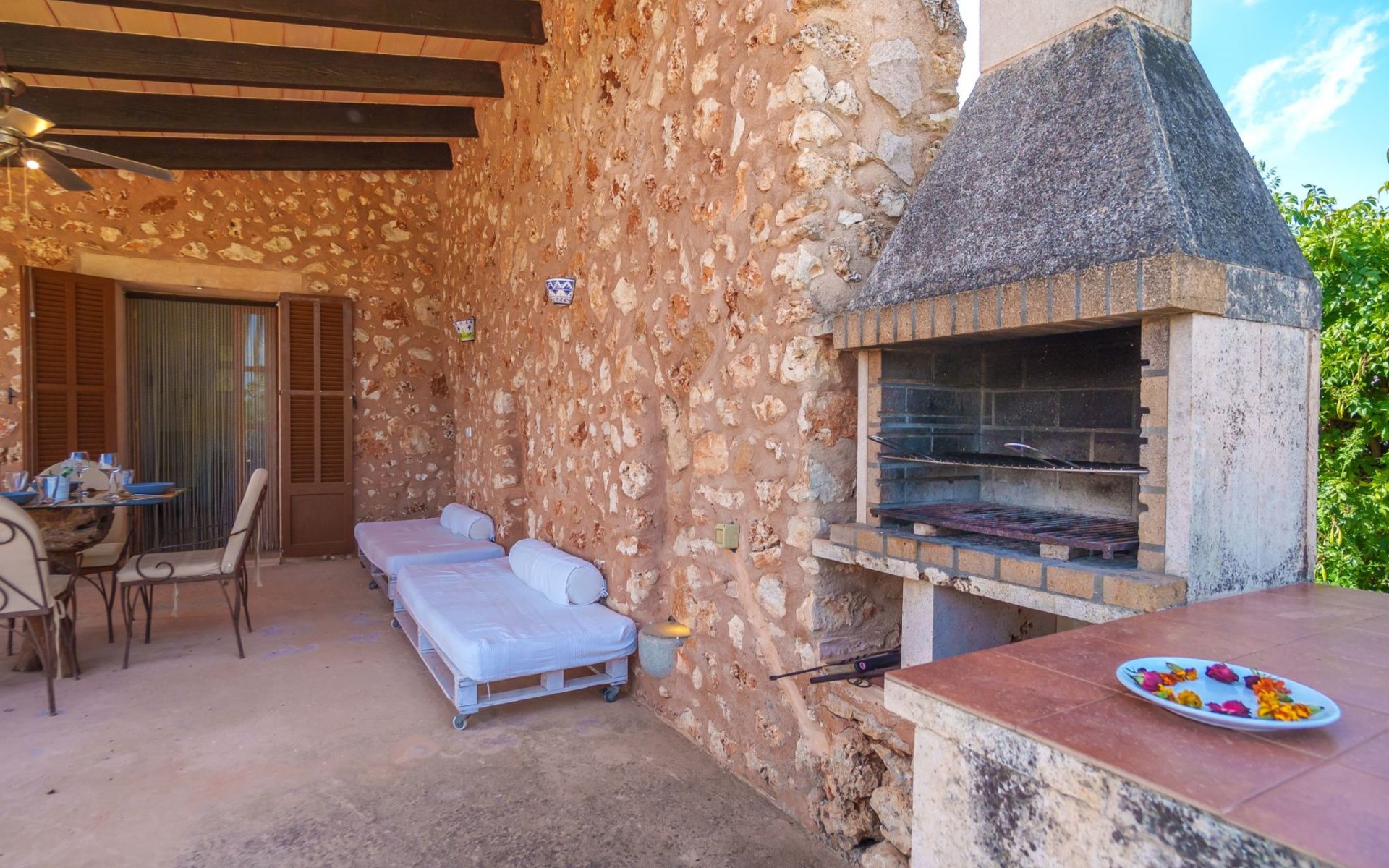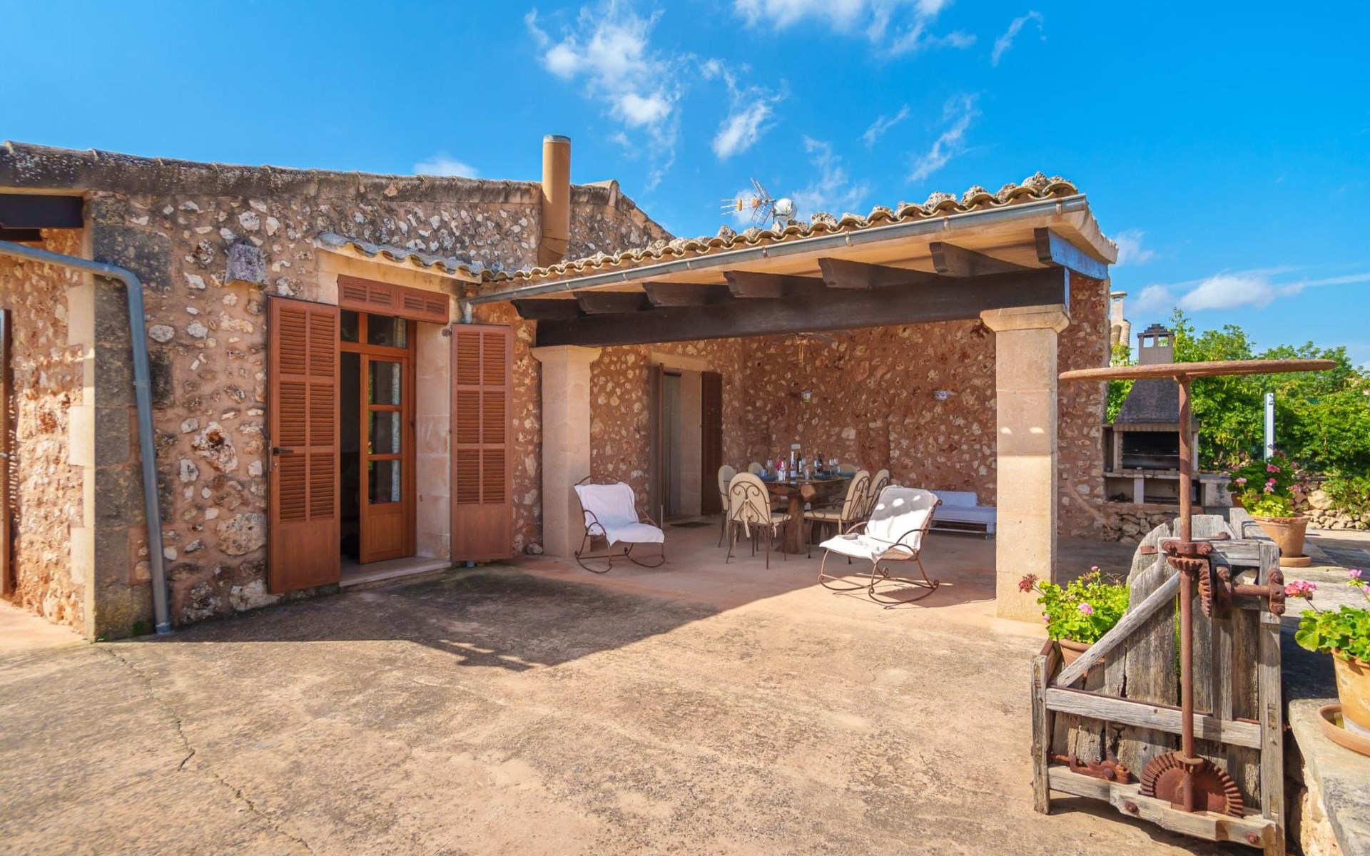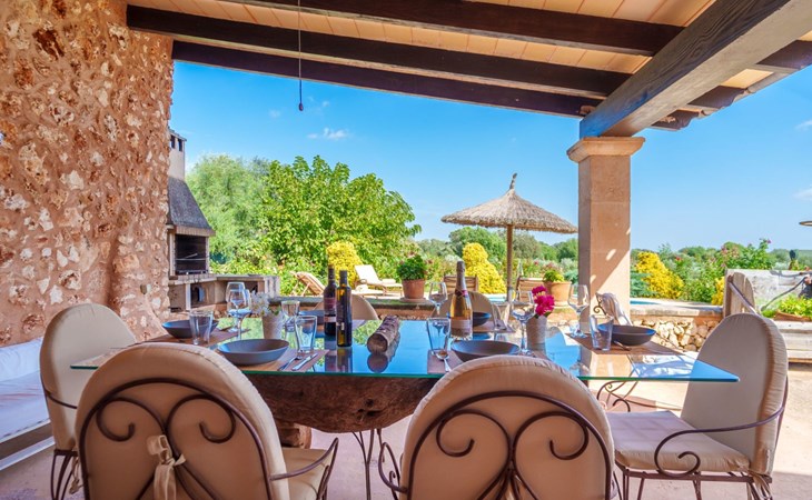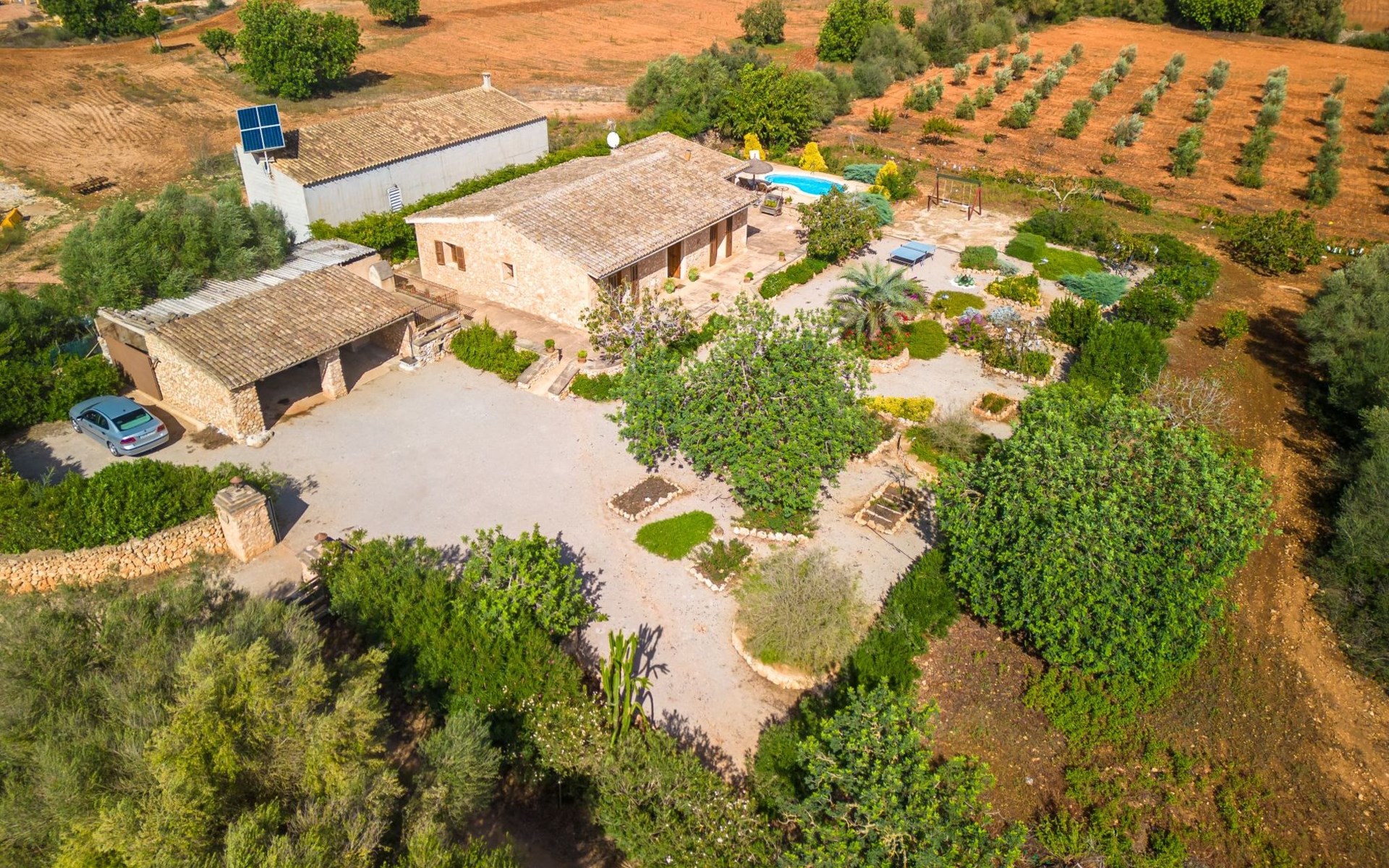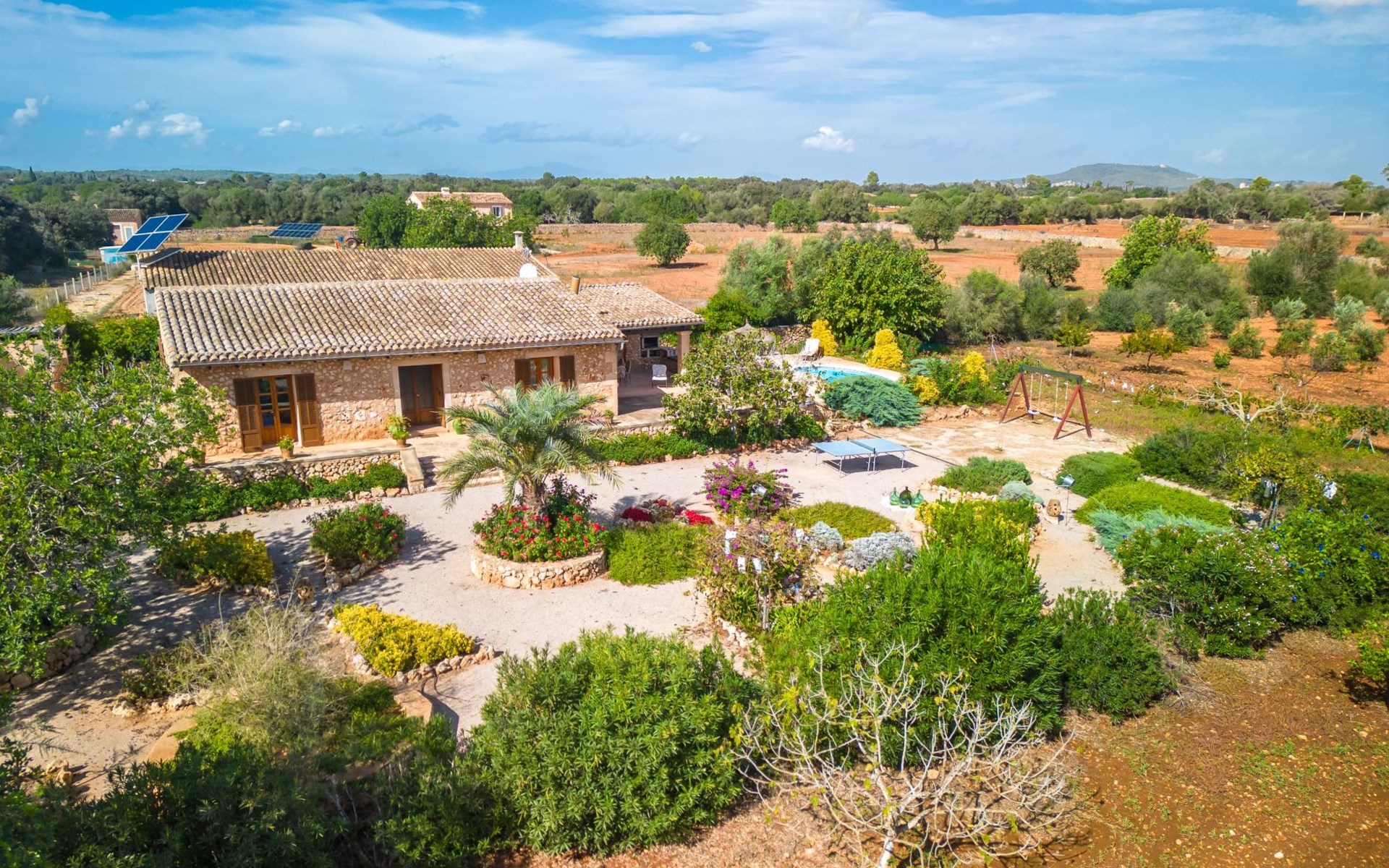Porreres: Gezellig, rustieke landgoed "Los Geranios", omgeven door bomen, weiden en velden. Buiten de plaats, 6 km van het centrum van Porreres, rustige ligging, gebied met weinig verkeer, aan een doodlopende weg. Voor alleengebruik: wild terrein, mooie, verzorgde tuin, boomgaard, ligweide, openluchtzwembad niervormig (6 x 3 m, 60 - 150 cm diepte, seizoensgebonden beschikbaarheid: 01.Mrt. - 31.Okt.). Buitendouche, prieel, prieel, terras, tuinmeubelen, barbecue. In het huis: internetaansluiting, Internet (WiFi), air-conditioning, wasmachine. Parkeerplaats op het terrein. Bushalte "Porreras" 7 km. Auto noodzakelijk. Geschikt voor families, geschikt voor senioren baby uitrusting op aanvraag (incl.). Het objekt is geschikt voor 6 volwassenen. De eigenaar accepteert geen jeugdgroepen. Laden en lossen van de baggage is mogelijk bij het huis. Vliegveld 40 km van het huis.