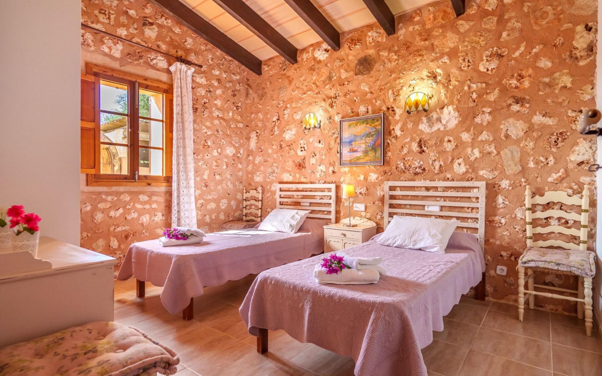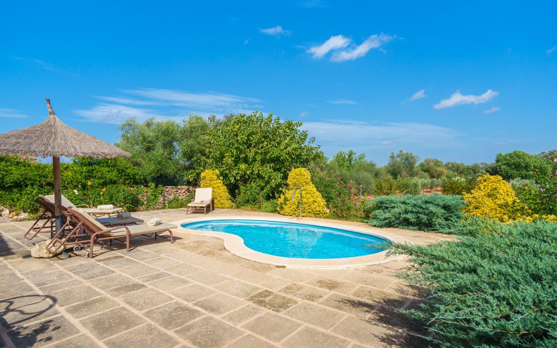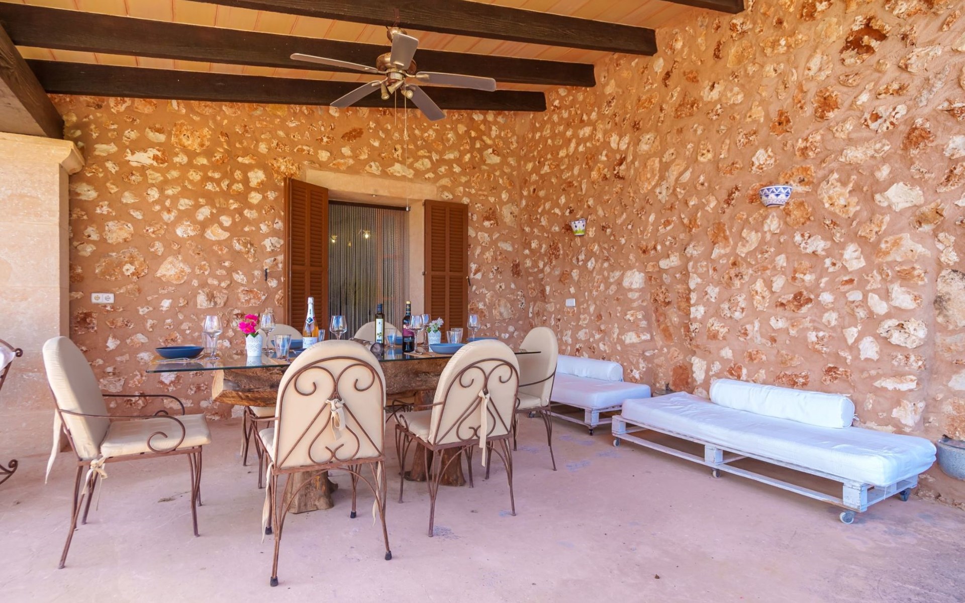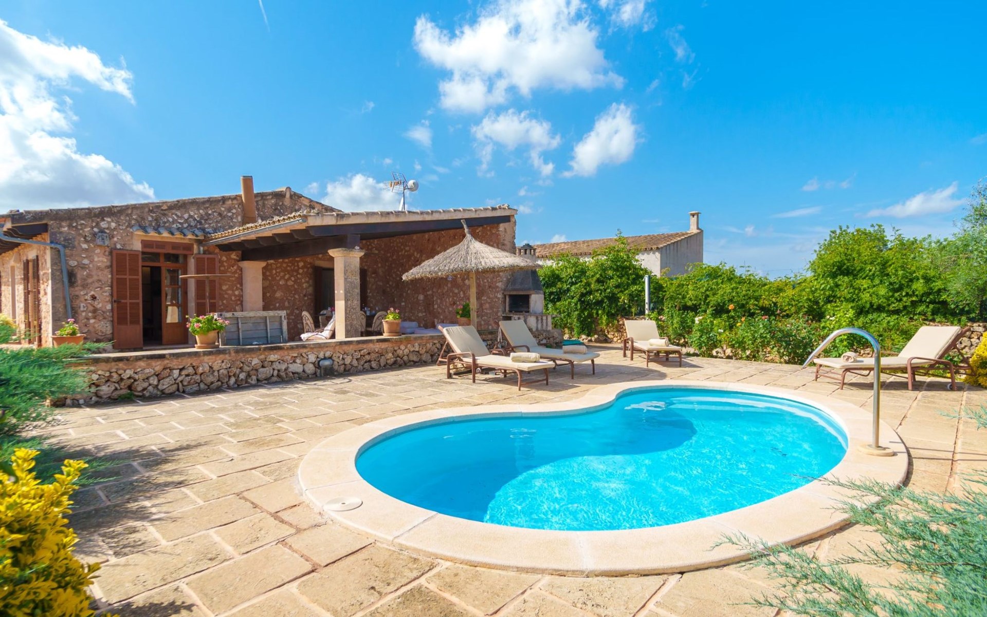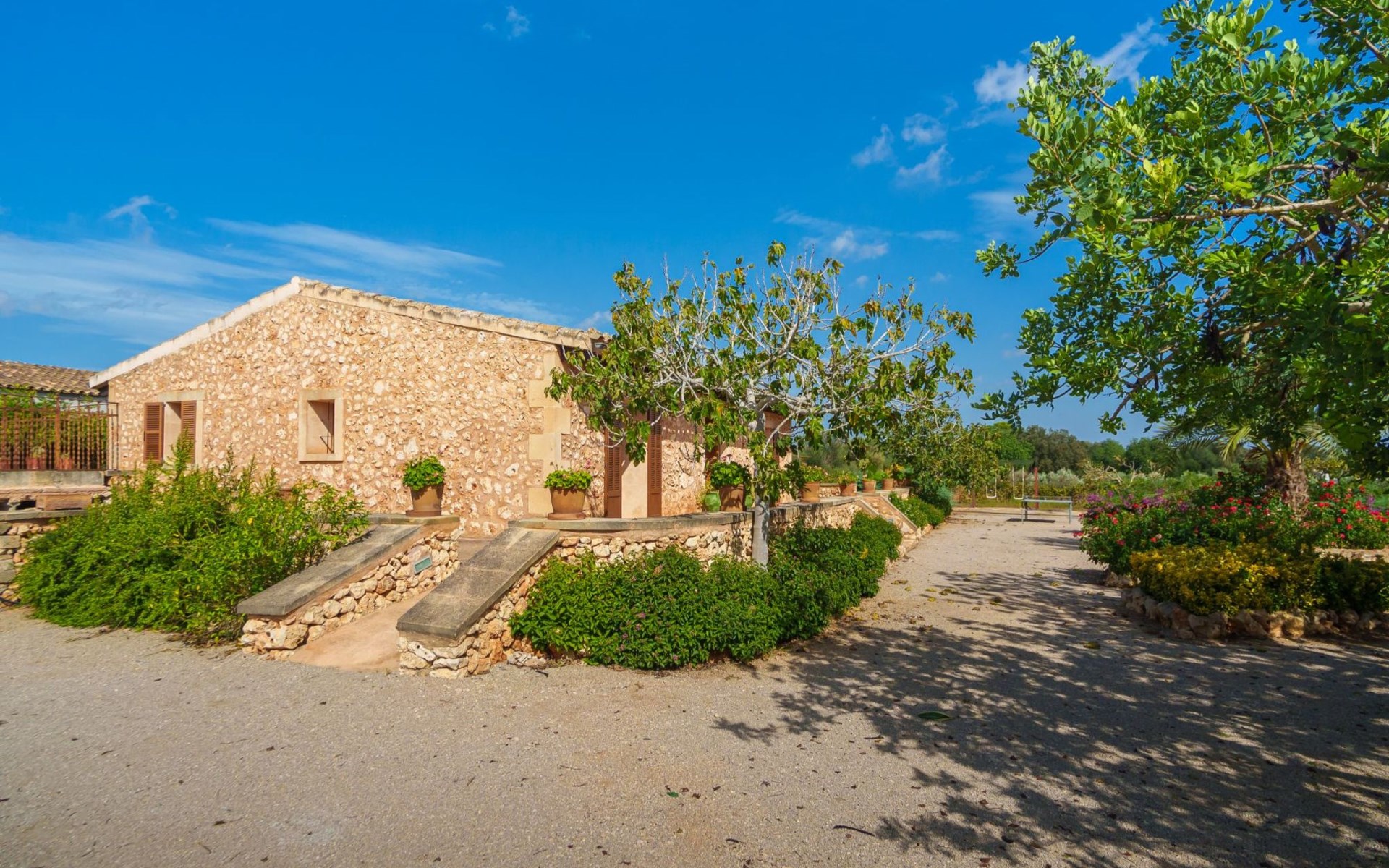 Porreres: Gezellig, rustieke landgoed "Los Geranios", omgeven door bomen, weiden en velden. Buiten de plaats, 6 km van het centrum van Porreres, rustige ligging, gebied met weinig verkeer, aan een doodlopende weg. Voor alleengebruik: wild terrein, mooie, verzorgde tuin, boomgaard, ligweide, openluchtzwembad niervormig (6 x 3 m, 60 - 150 cm diepte, seizoensgebonden beschikbaarheid: 01.Mrt. - 31.Okt.). Buitendouche, prieel, prieel, terras, tuinmeubelen, barbecue. In het huis: internetaansluiting, Internet (WiFi), air-conditioning, wasmachine. Parkeerplaats op het terrein. Bushalte "Porreras" 7 km. Auto noodzakelijk. Geschikt voor families, geschikt voor senioren baby uitrusting op aanvraag (incl.). Het objekt is geschikt voor 6 volwassenen. De eigenaar accepteert geen jeugdgroepen. Laden en lossen van de baggage is mogelijk bij het huis. Vliegveld 40 km van het huis.