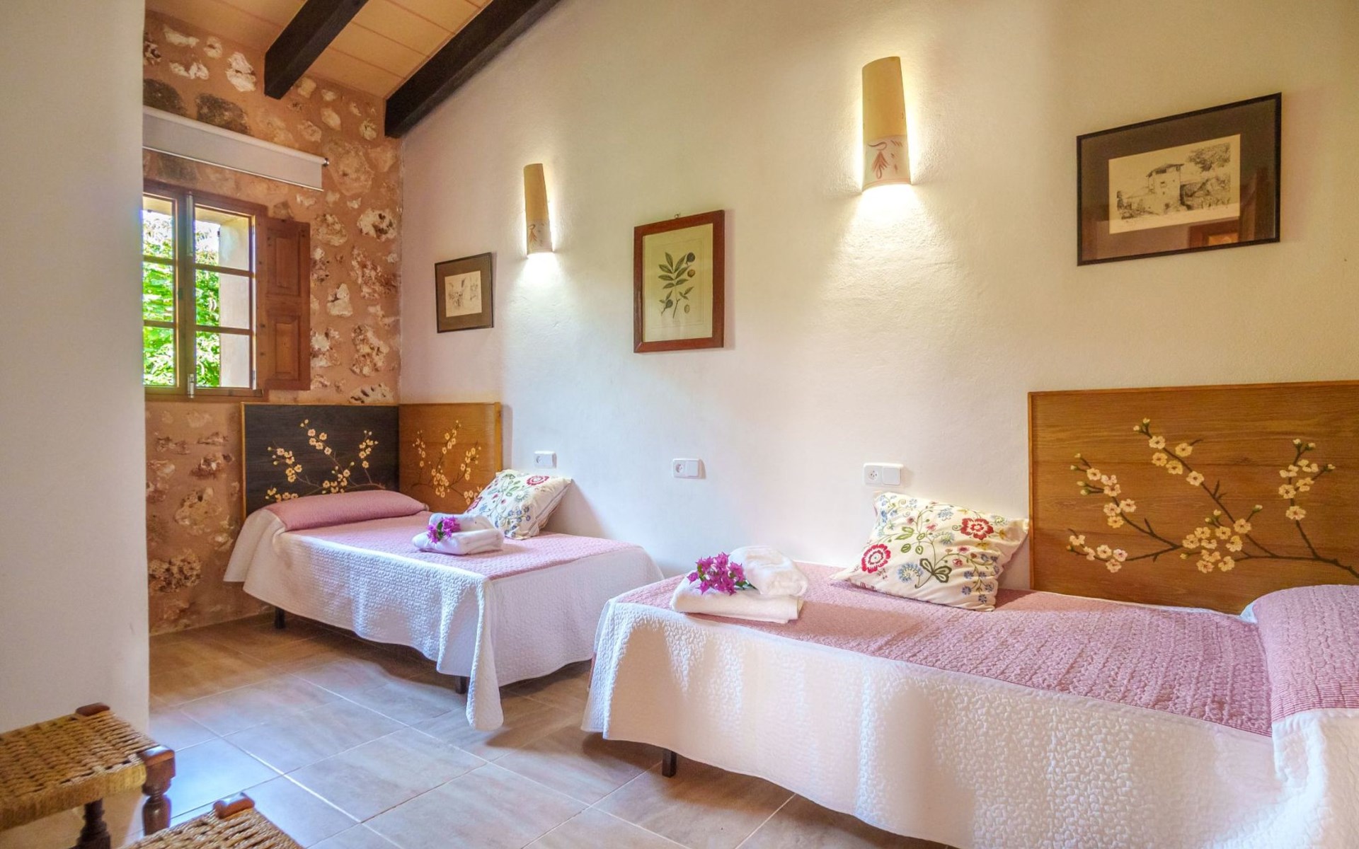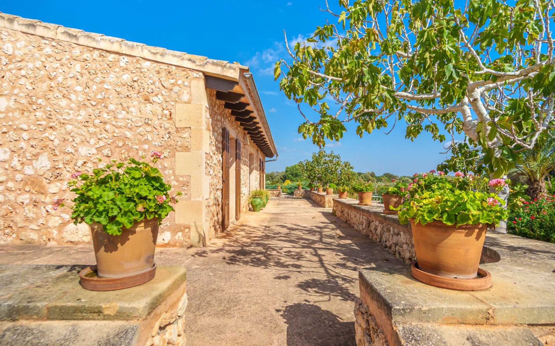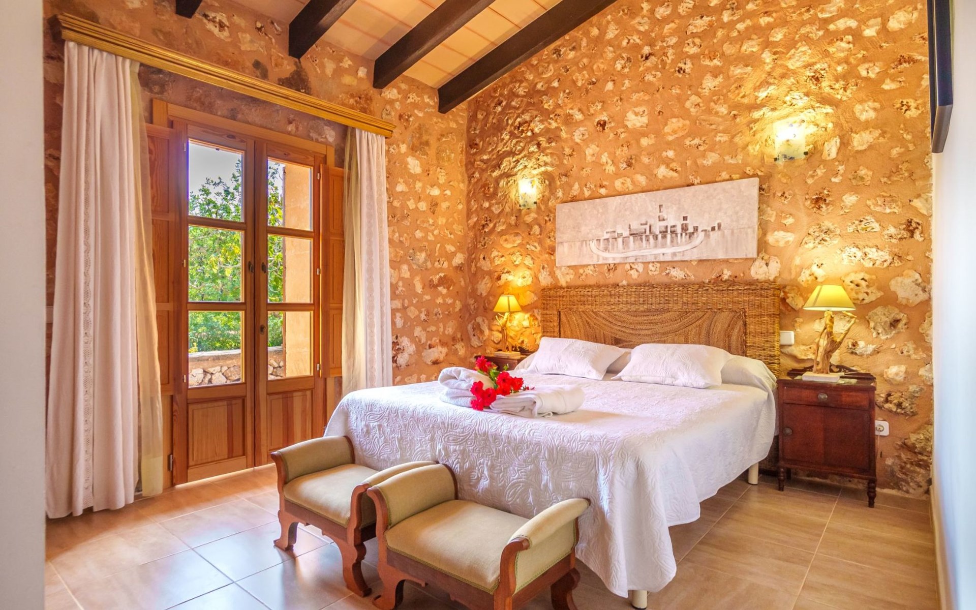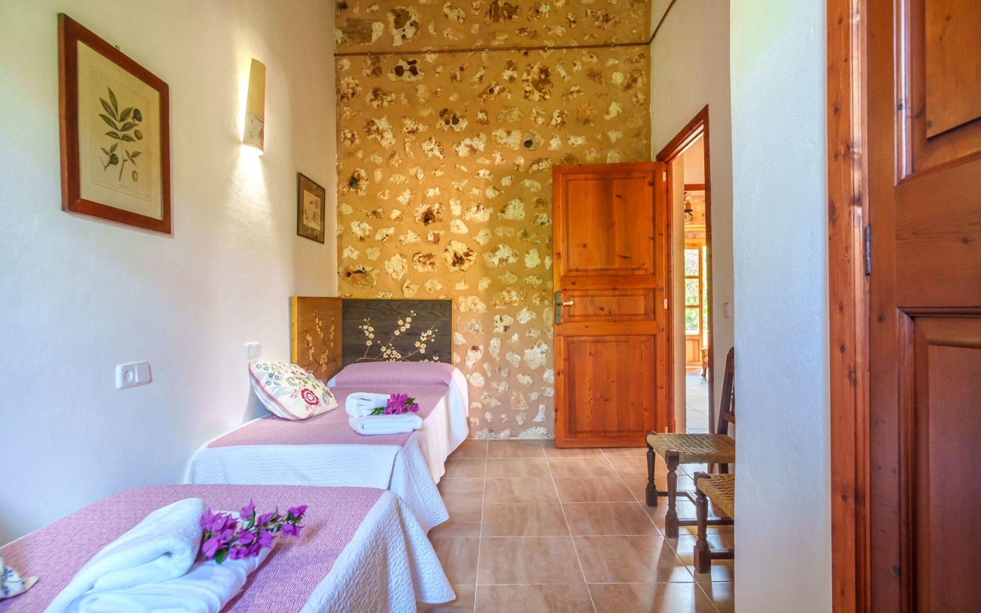 Porreres: Gezellig, rustieke landgoed "Los Geranios", omgeven door bomen, weiden en velden. Buiten de plaats, 6 km van het centrum van Porreres, rustige ligging, gebied met weinig verkeer, aan een doodlopende weg. Voor alleengebruik: wild terrein, mooie, verzorgde tuin, boomgaard, ligweide, openluchtzwembad niervormig (6 x 3 m, 60 - 150 cm diepte, seizoensgebonden beschikbaarheid: 01.Mrt. - 31.Okt.). Buitendouche, prieel, prieel, terras, tuinmeubelen, barbecue. In het huis: internetaansluiting, Internet (WiFi), air-conditioning, wasmachine. Parkeerplaats op het terrein. Bushalte "Porreras" 7 km. Auto noodzakelijk. Geschikt voor families, geschikt voor senioren baby uitrusting op aanvraag (incl.). Het objekt is geschikt voor 6 volwassenen. De eigenaar accepteert geen jeugdgroepen. Laden en lossen van de baggage is mogelijk bij het huis. Vliegveld 40 km van het huis.