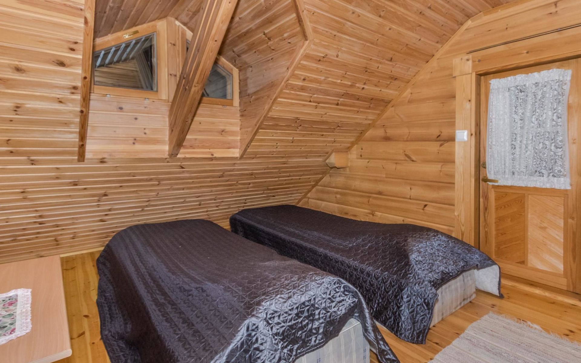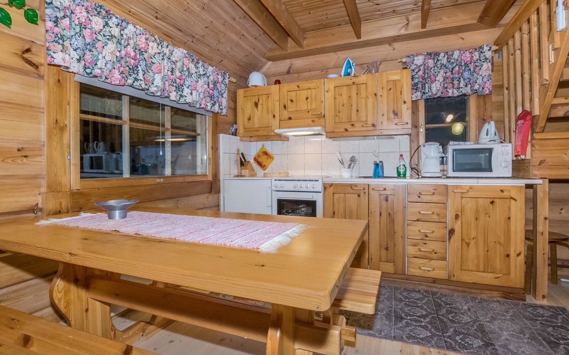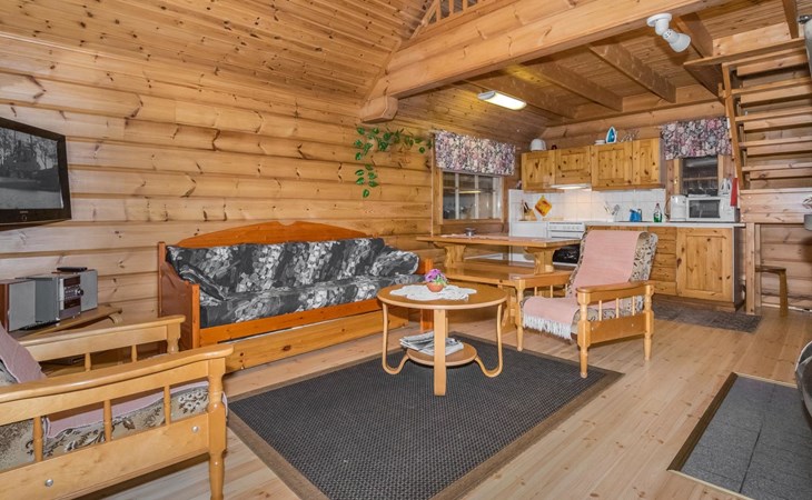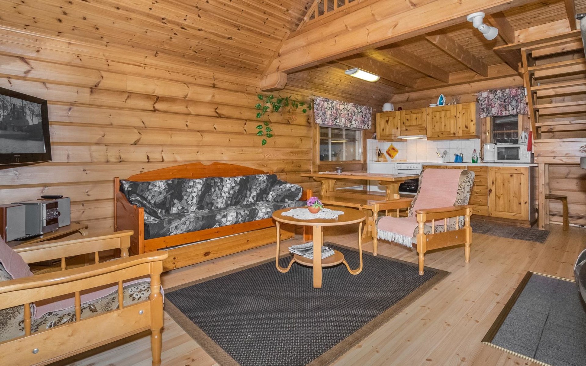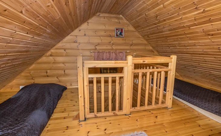 Planed log cabin (1998) living room/kitchen, bedroom with double bed, loft with four mattresses, living room, washroom, sauna and WC.
