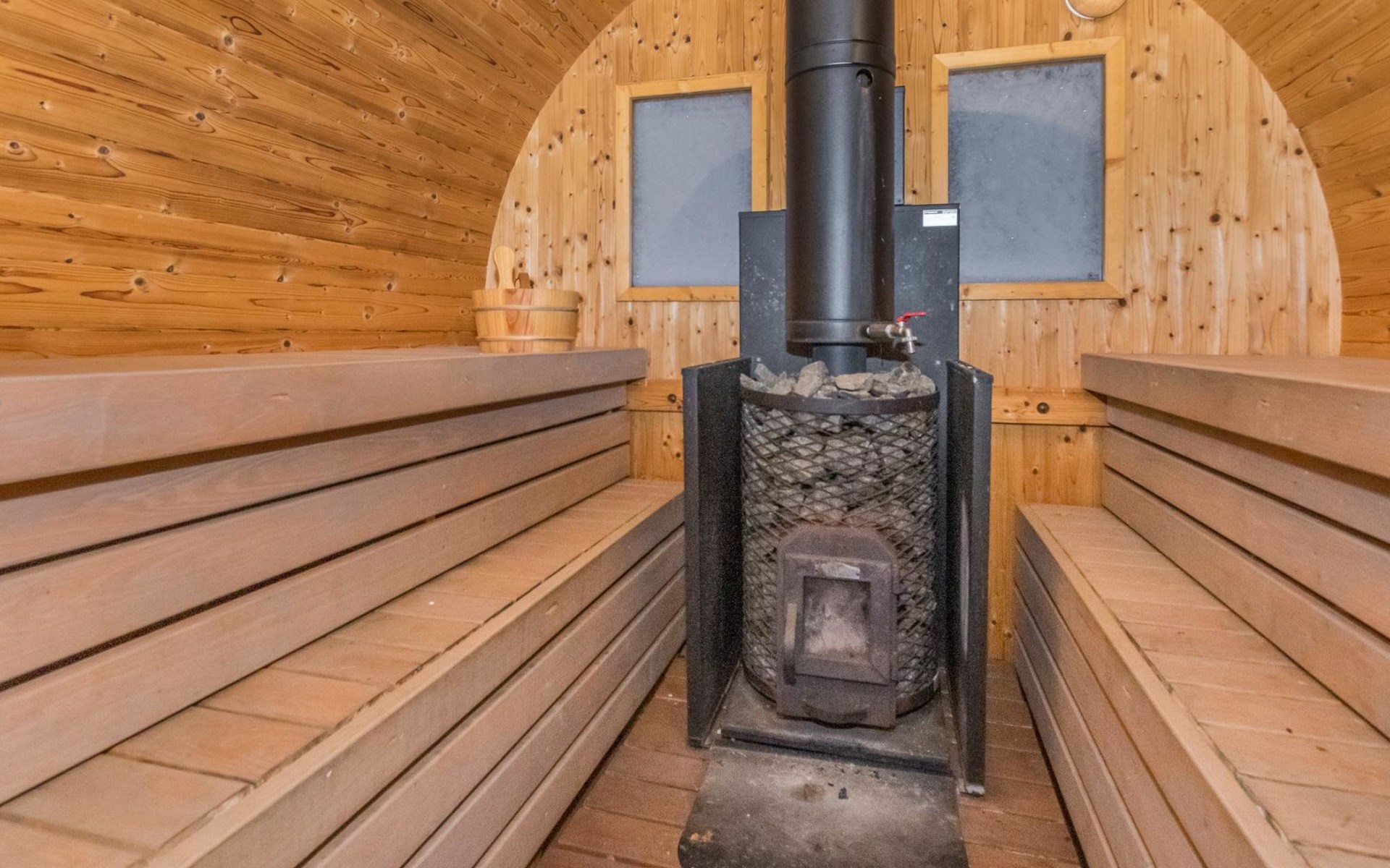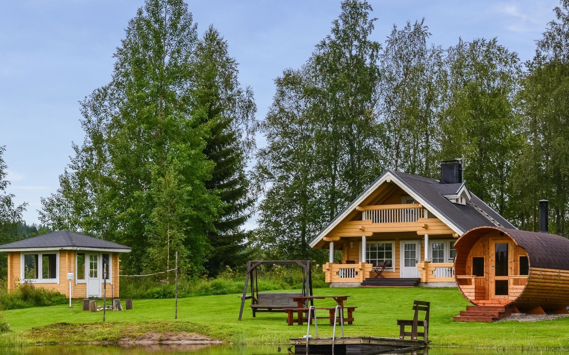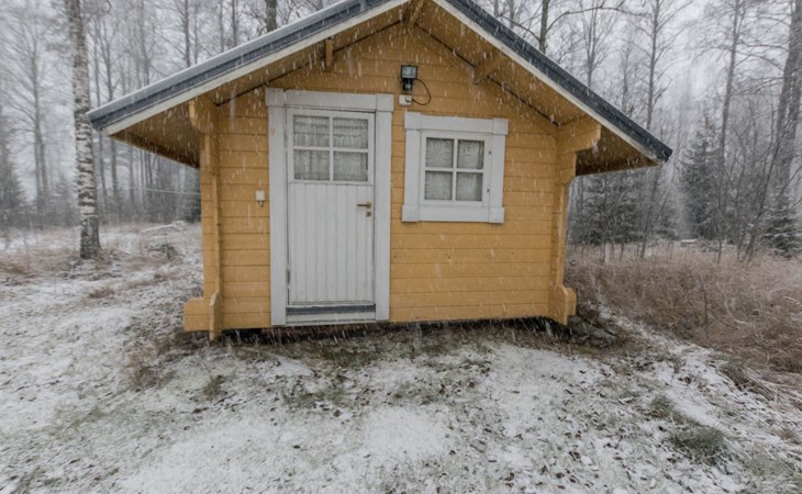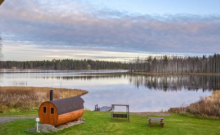 There is also an outbuilding, summerhouse and barrel sauna with wood burning sauna stove in the yard. Air source heat pump in the cabin.
