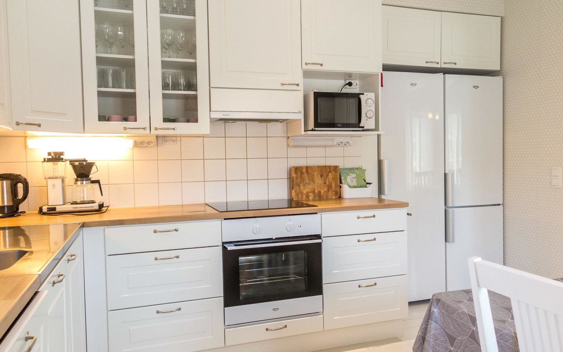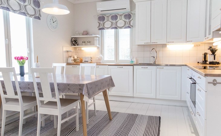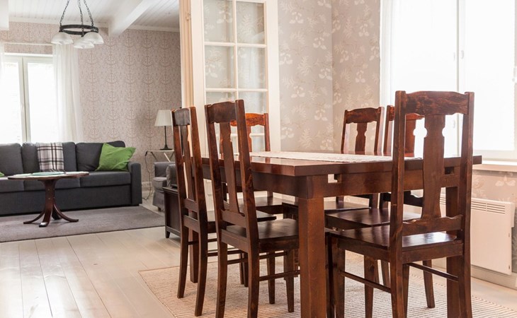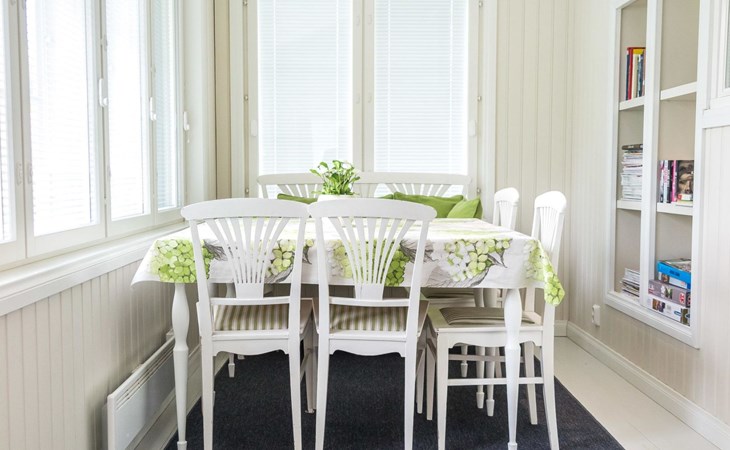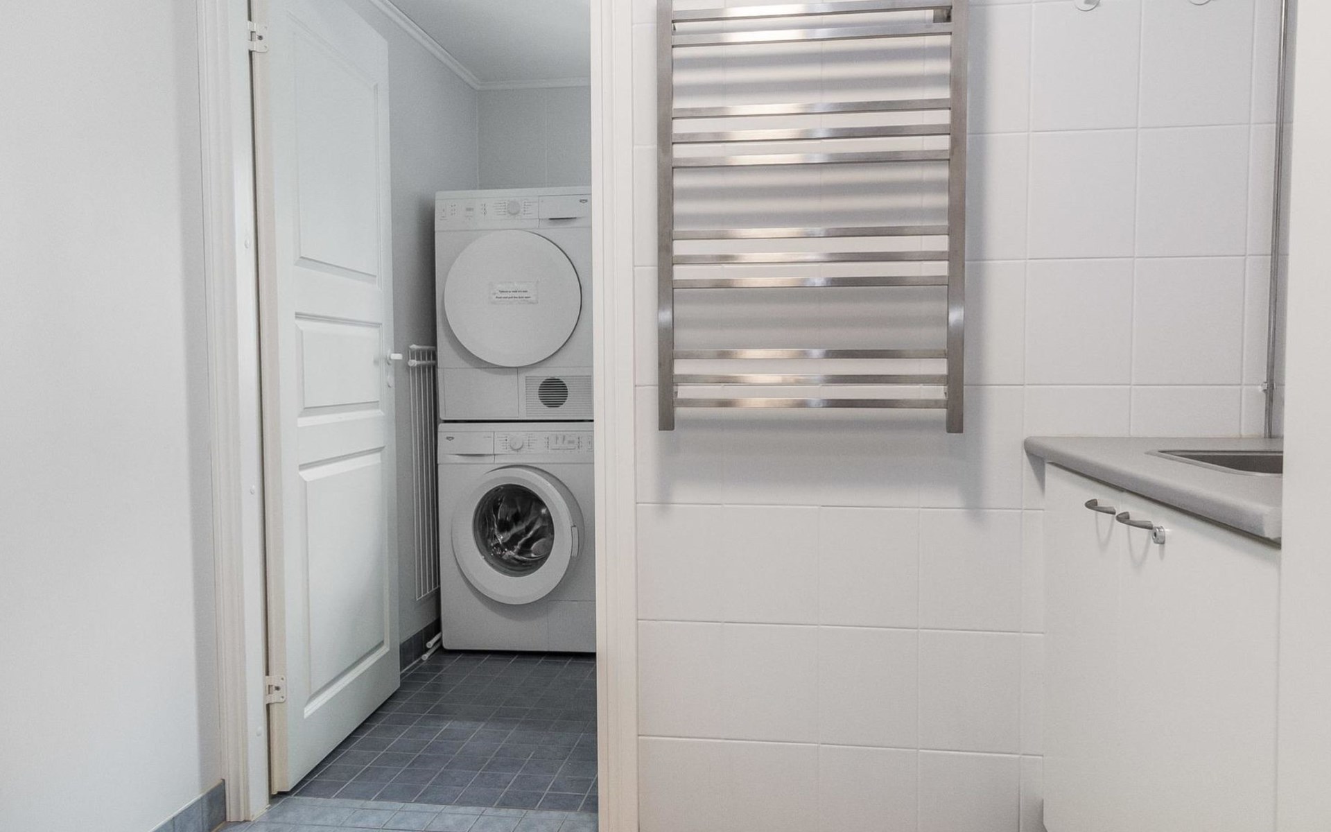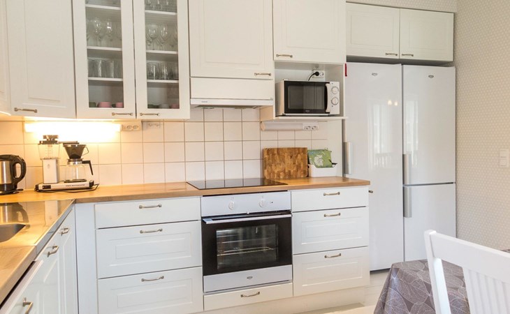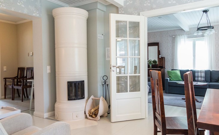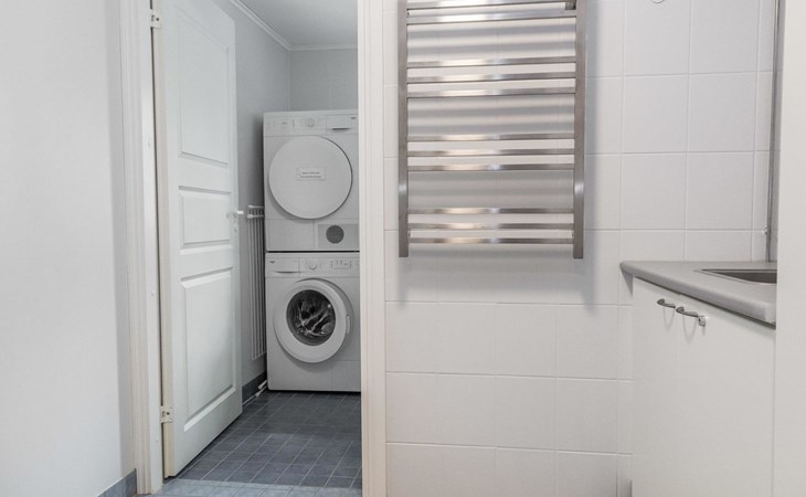 Downstairs: kitchen, dining area and living room, possibility to made 2 extra bed in sofa-bed (140 cm). Covered veranda, utility room (washmachine and tumble-dryer), washroom, sauna (electric stove) and 2 toilets. In dining room is wooden warming oven.