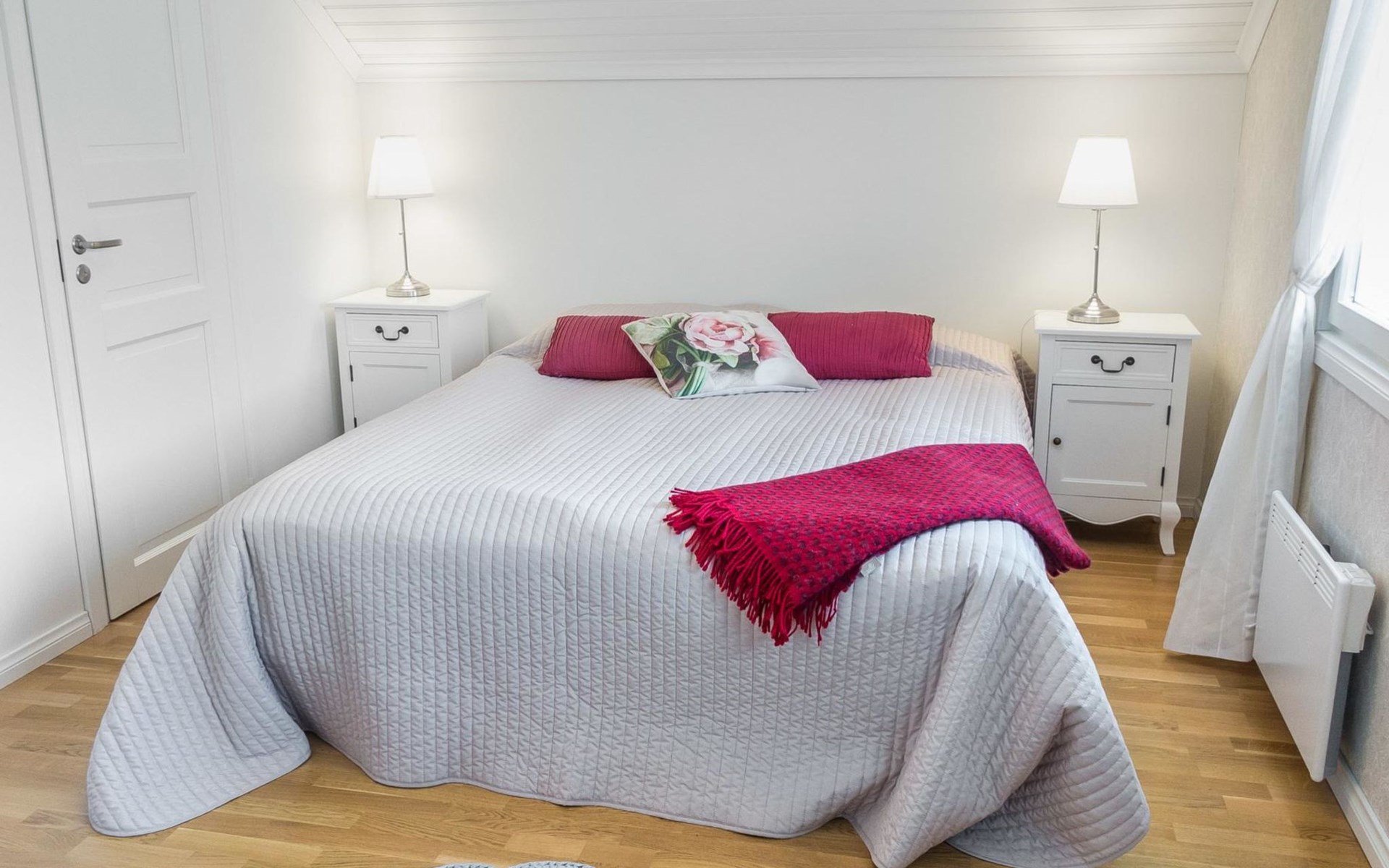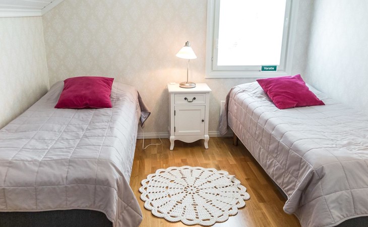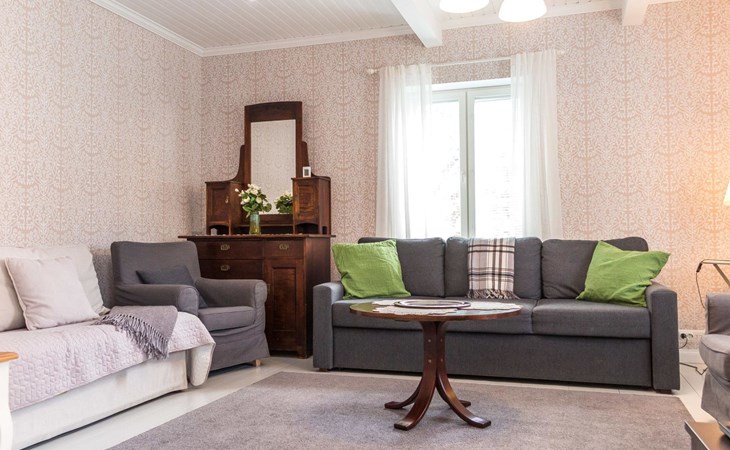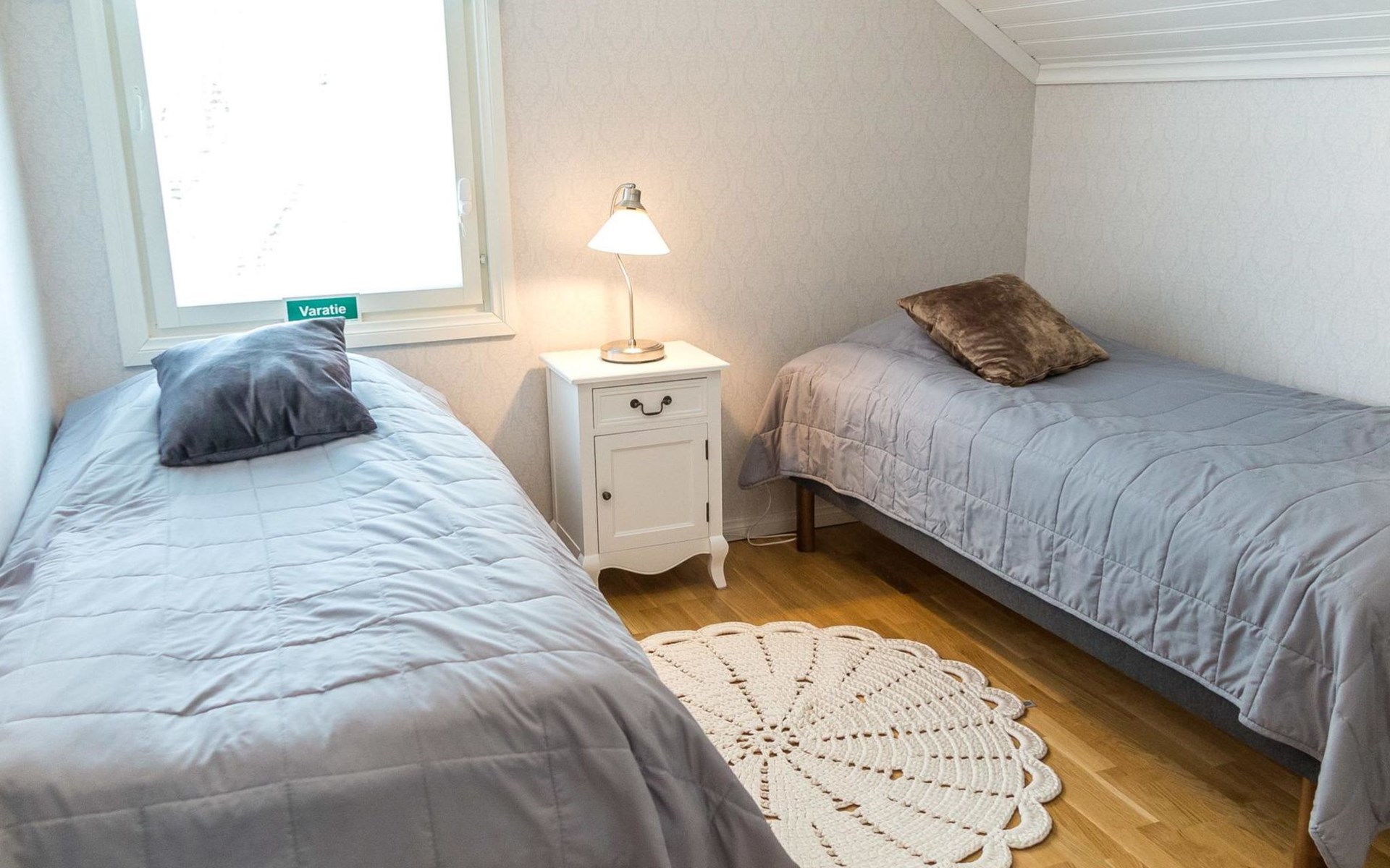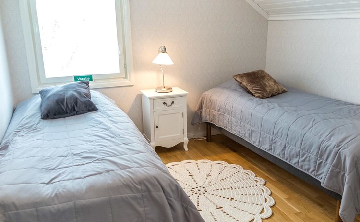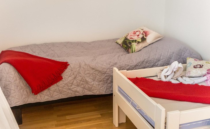 Upstairs: 1 bed room with double bed and child bed (75 cm x 190 cm) and 2 bed rooms with 2 separate beds. WC, shower and lounge area with kitchen and sofa-bed (140 cm) for 2 persons. Upstairs there is also dishwahser, fridge/freezer, electric stove, microwave oven and TV. In house mechanical ventilation.
