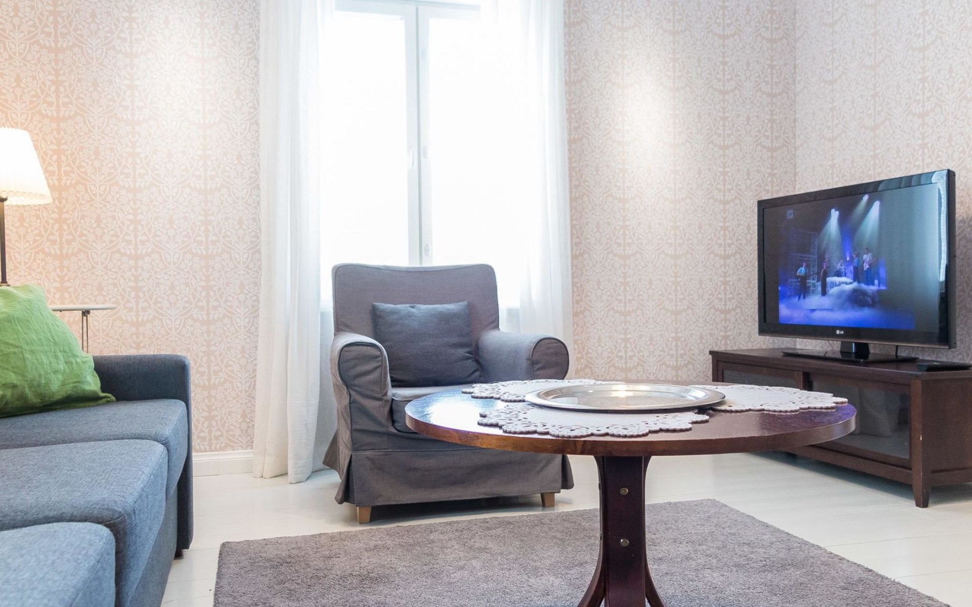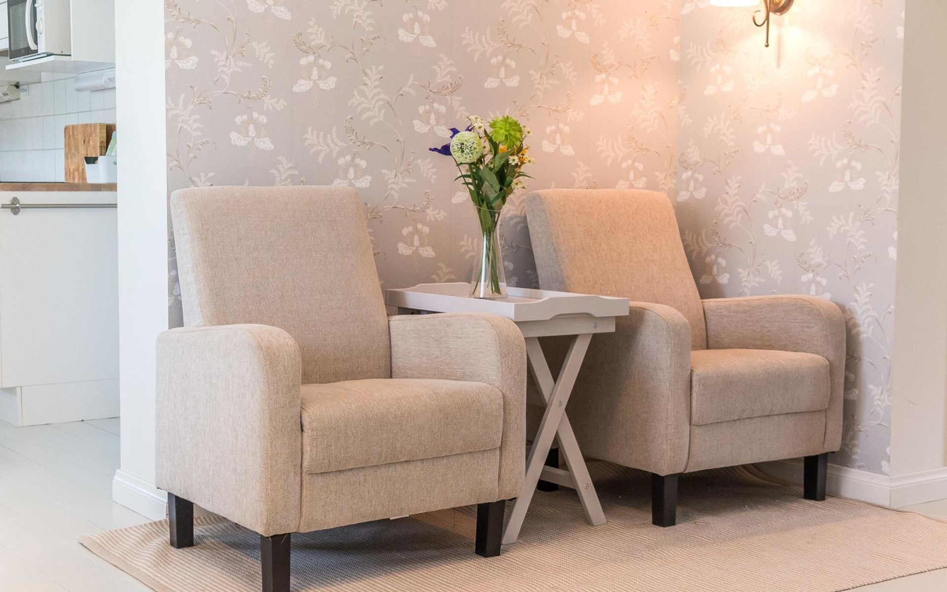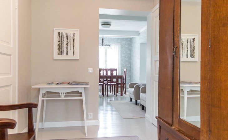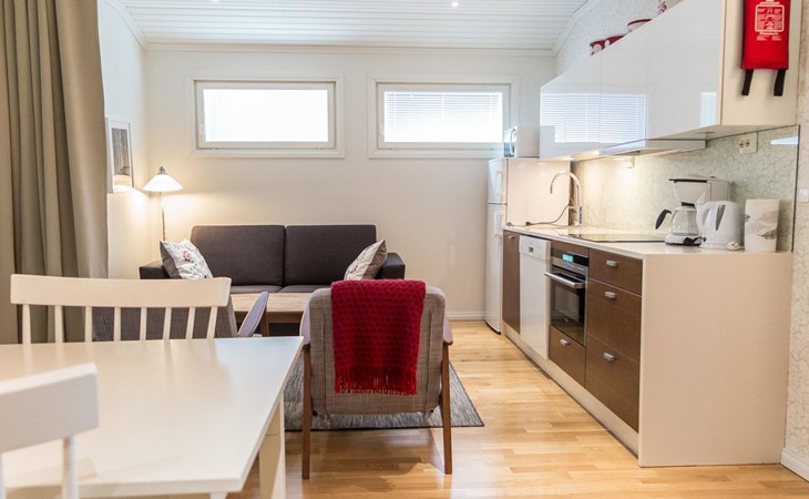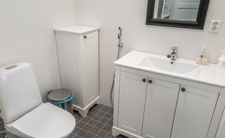 Upstairs: 1 bed room with double bed and child bed (75 cm x 190 cm) and 2 bed rooms with 2 separate beds. WC, shower and lounge area with kitchen and sofa-bed (140 cm) for 2 persons. Upstairs there is also dishwahser, fridge/freezer, electric stove, microwave oven and TV. In house mechanical ventilation.