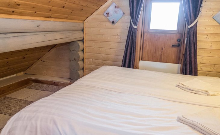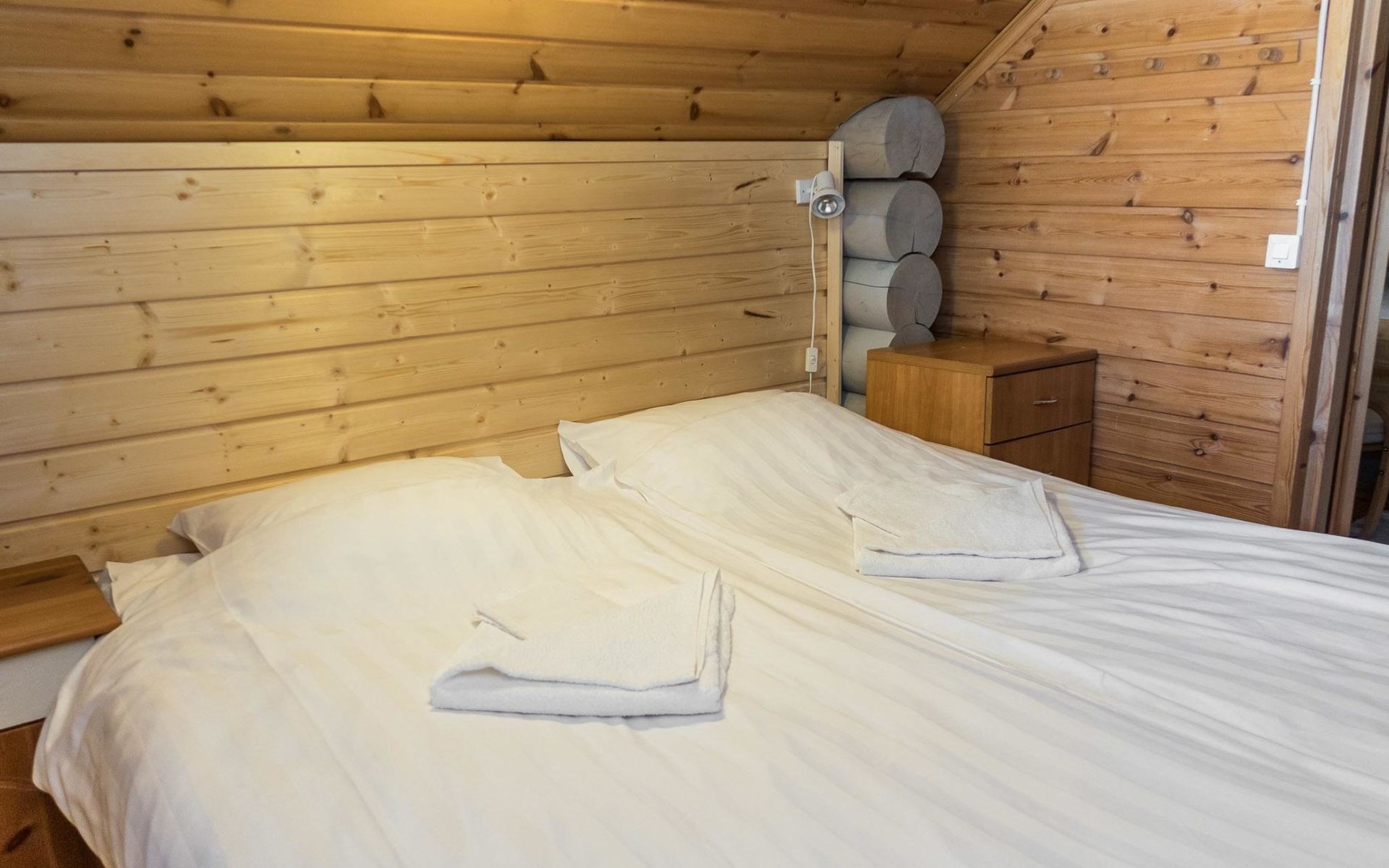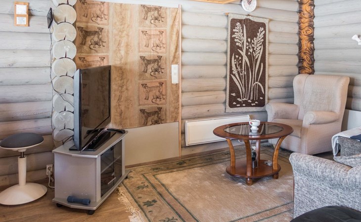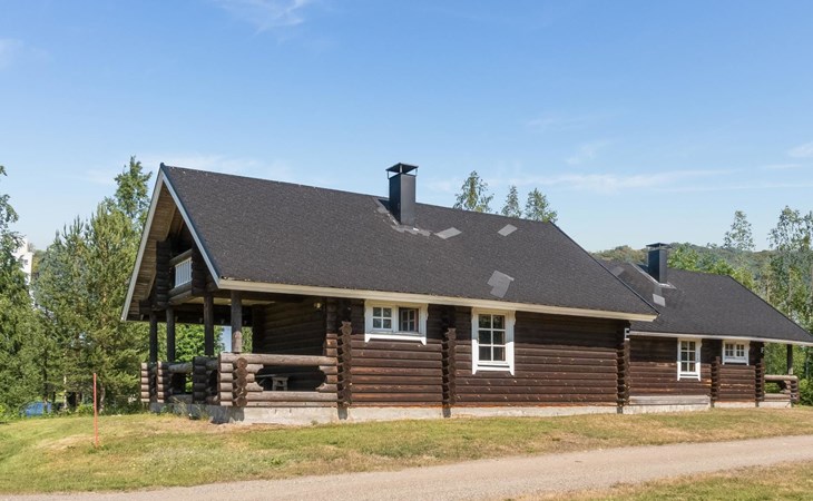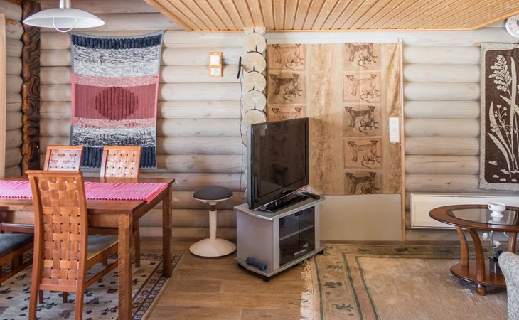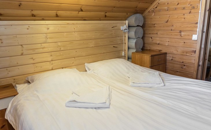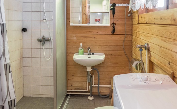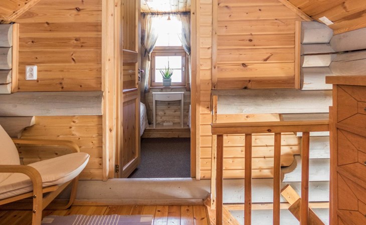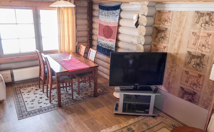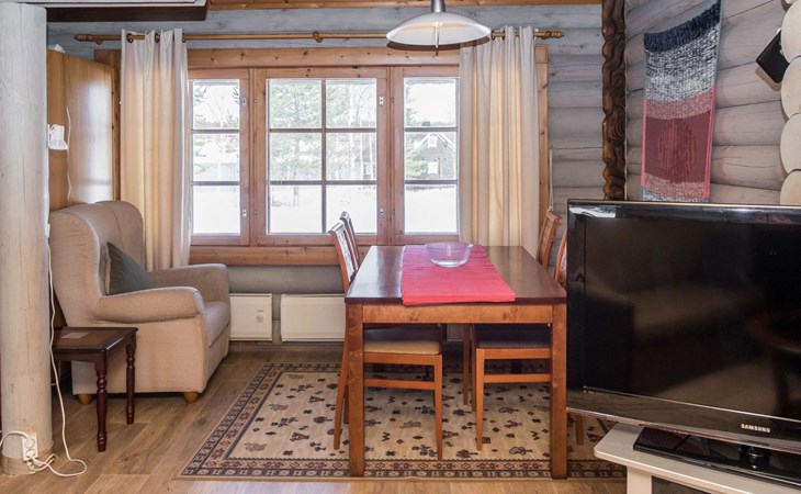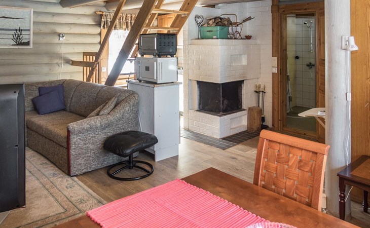 Vuokatticottage E living area 57 m², on two floors. Kitchenette, bright living room with dining table, sofa, TV 42 ", fireplace. Shower/toilet, sauna with electric stove. Loft with steep stairs, small lobby with access to both bedrooms, one with double bed (access to balcony), one with twin beds for 2. Small terrace.