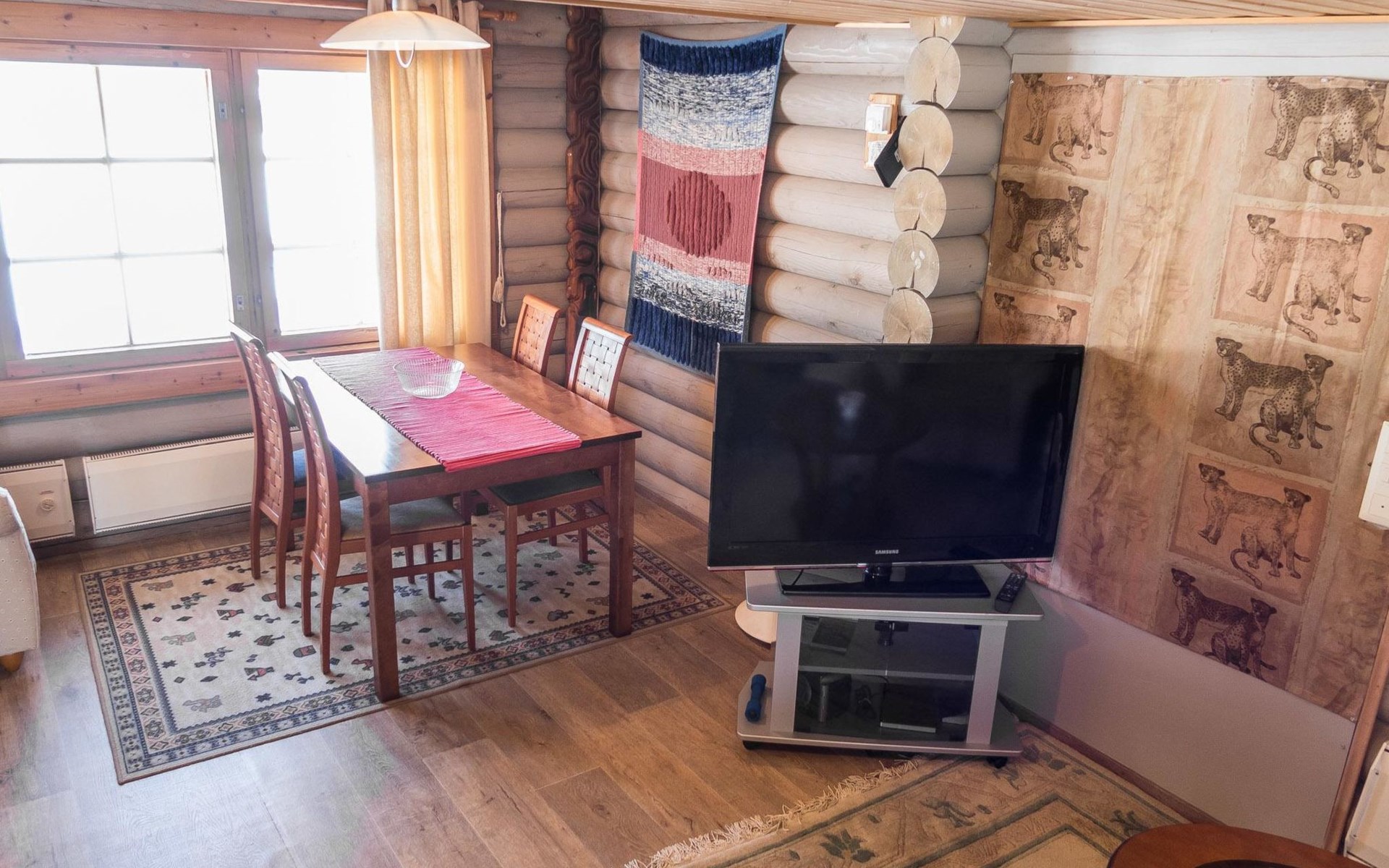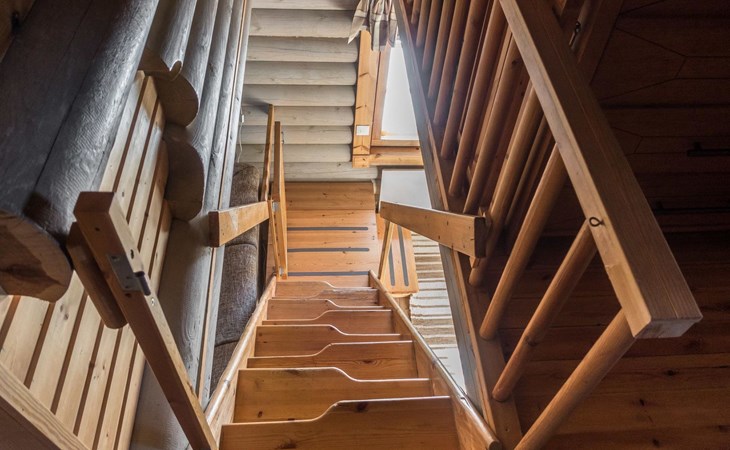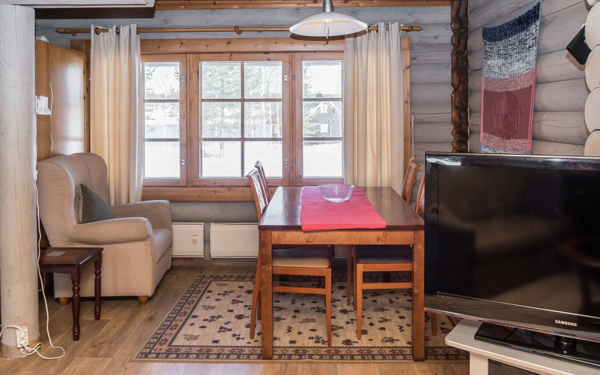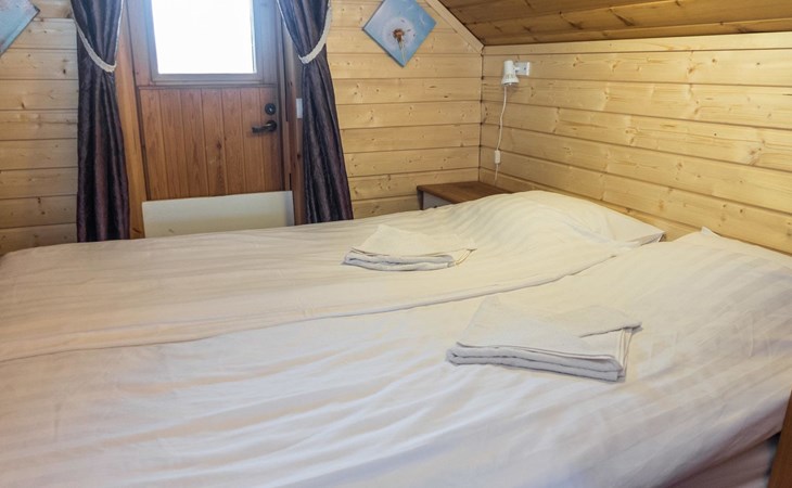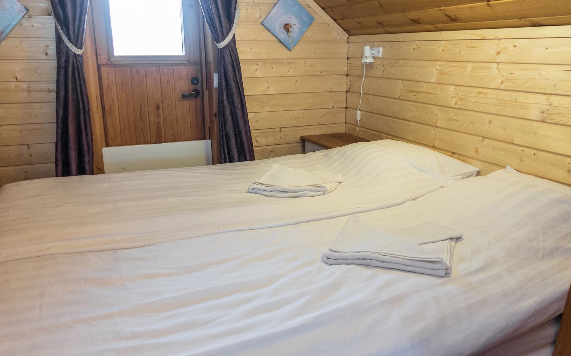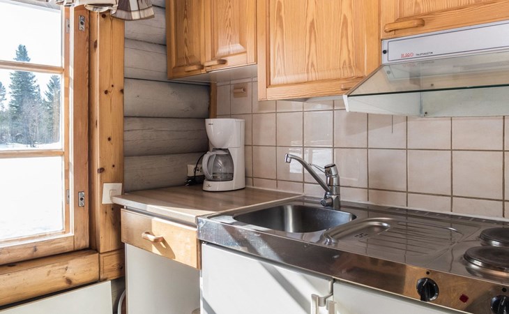 Vuokatticottage E living area 57 m², on two floors. Kitchenette, bright living room with dining table, sofa, TV 42 ", fireplace. Shower/toilet, sauna with electric stove. Loft with steep stairs, small lobby with access to both bedrooms, one with double bed (access to balcony), one with twin beds for 2. Small terrace.