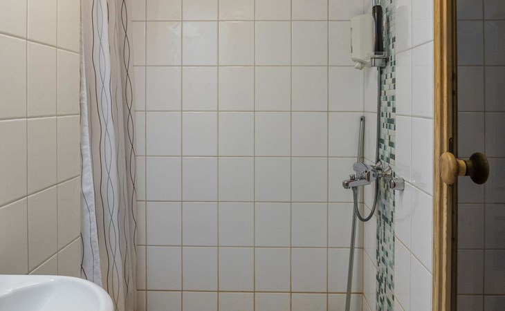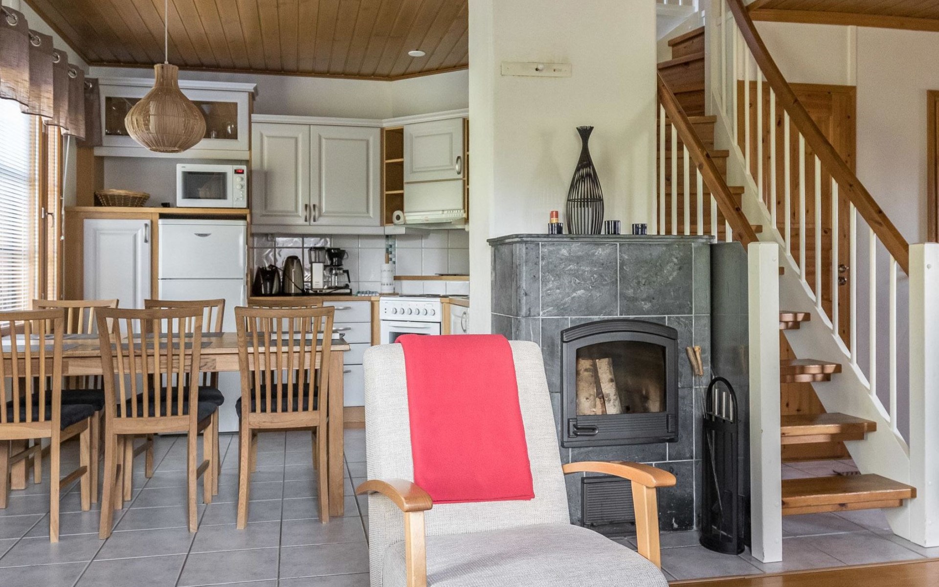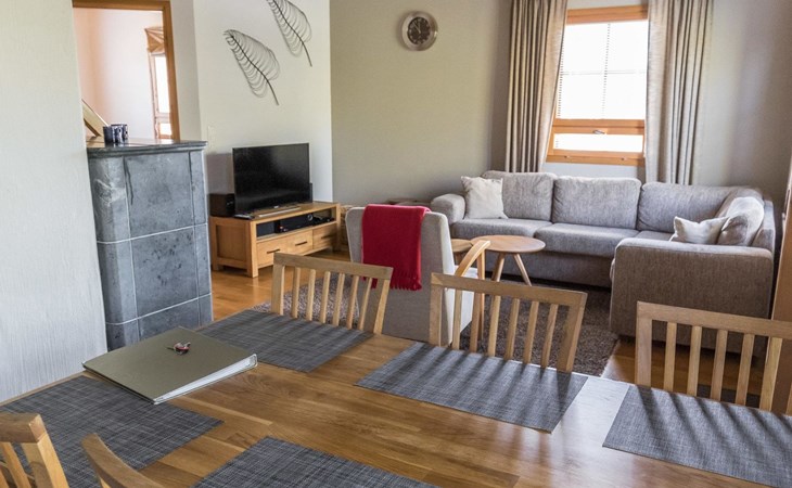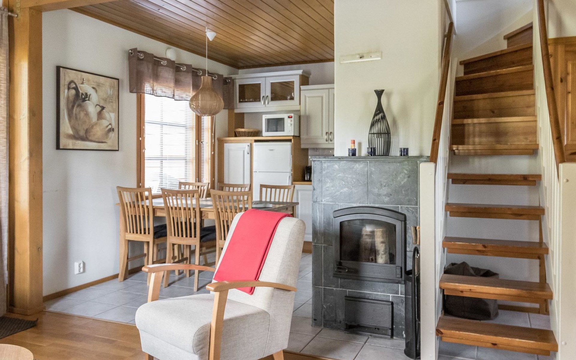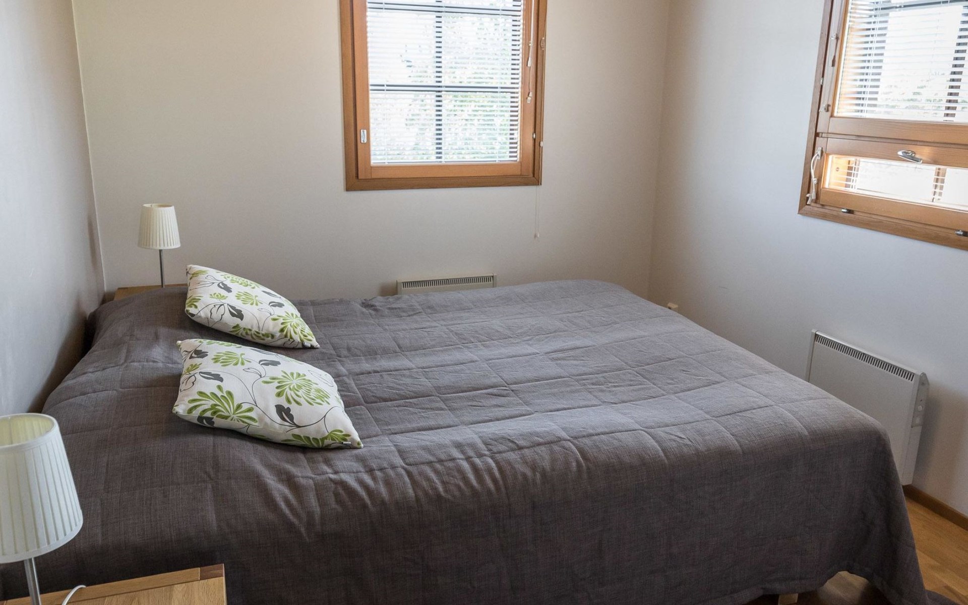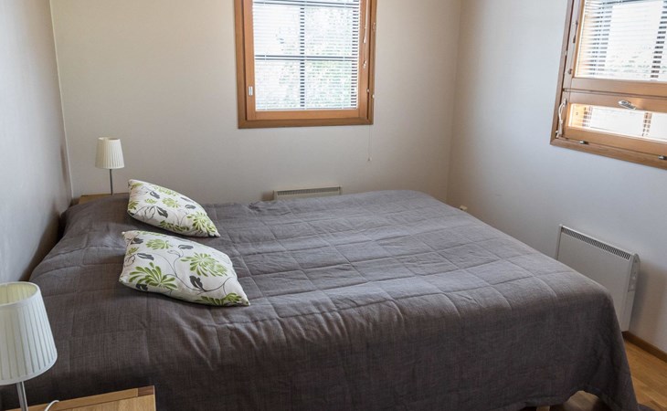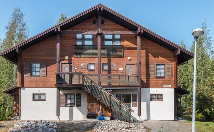 Two-storey chalet 2003, an apartement in the second floor, kitchen-living room, bedroom with two beds, washroom, sauna (electric stove), hall and a big terrace towards the ski slopes. Skistorage, two car plugs.